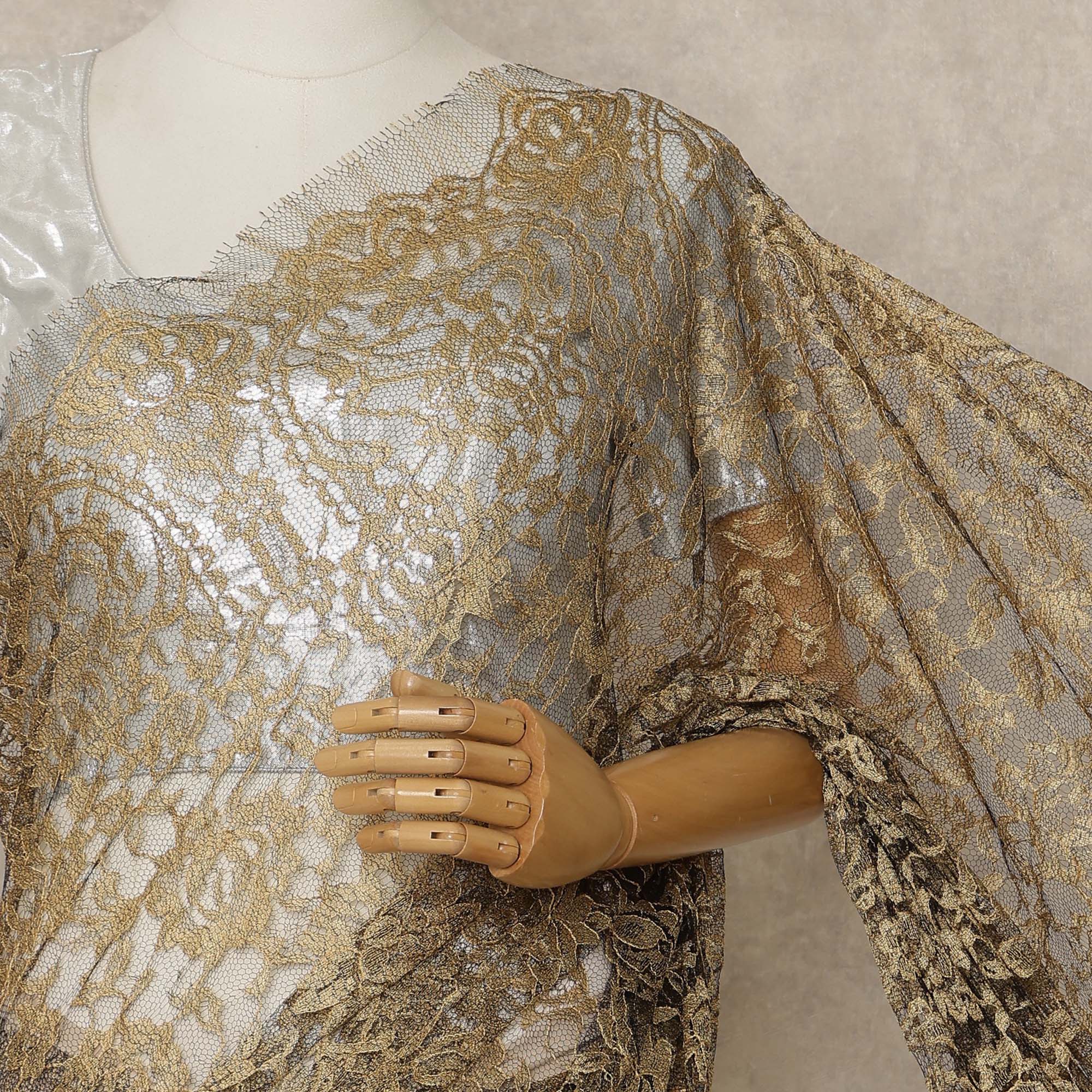 Premium antique gold 2-tone Chantilly lace saree fabric with elegant floral detailing.
