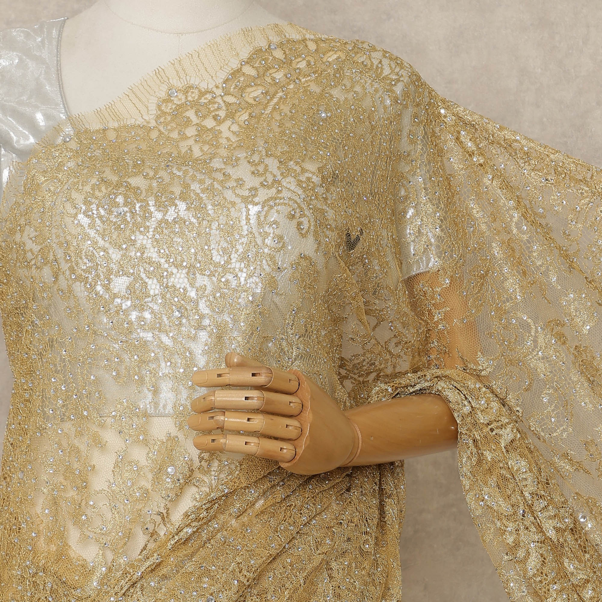 Luxurious antique gold metallic Chantilly lace saree fabric with intricate stone work.