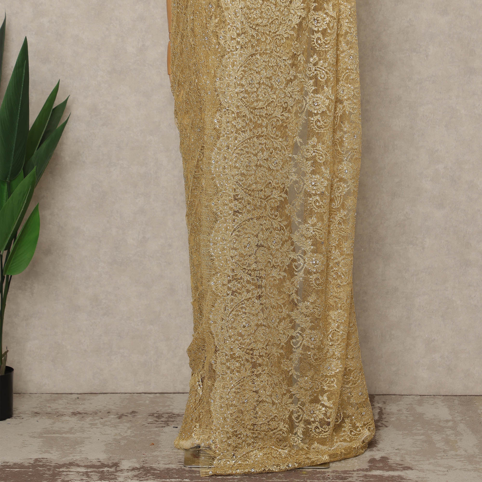 Antique Gold Premium French Metallic Chantilly Lace Saree with Stone Work, 5.5 Mtrs Length, 110 Cms Width, Made in France-D27129