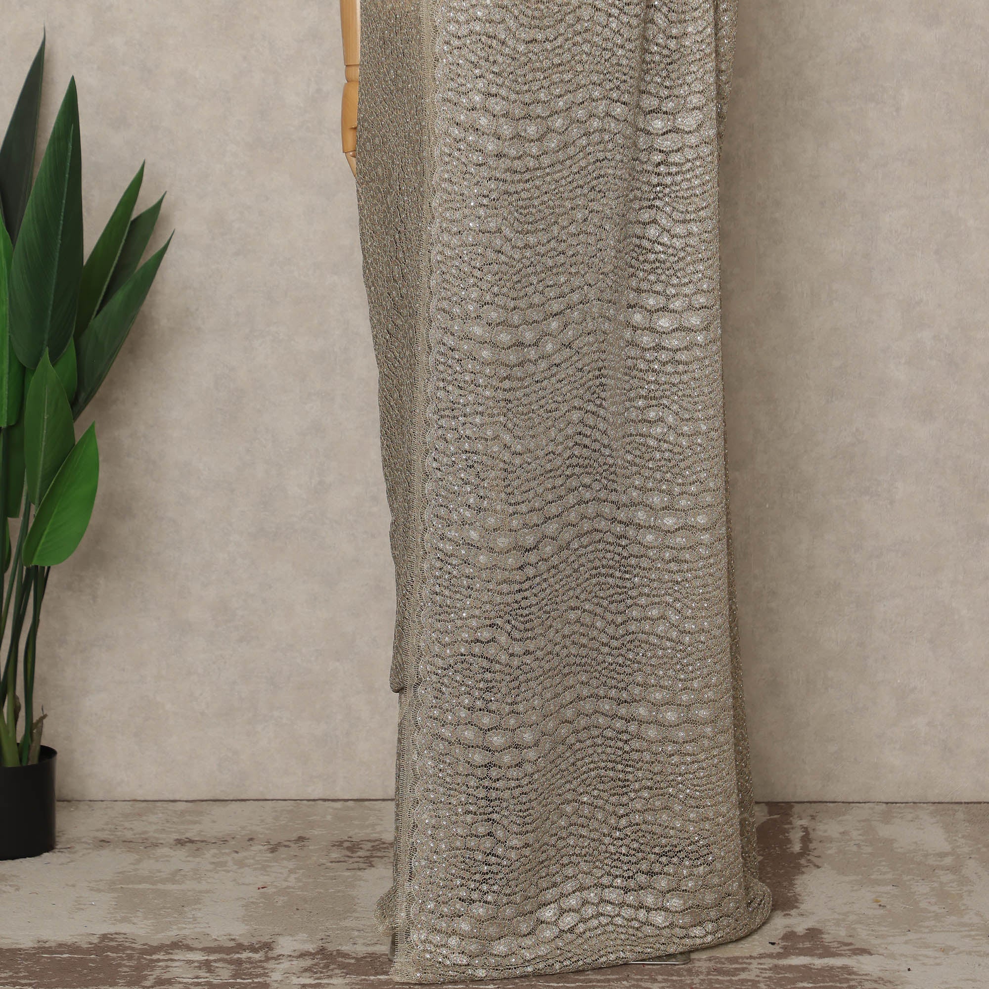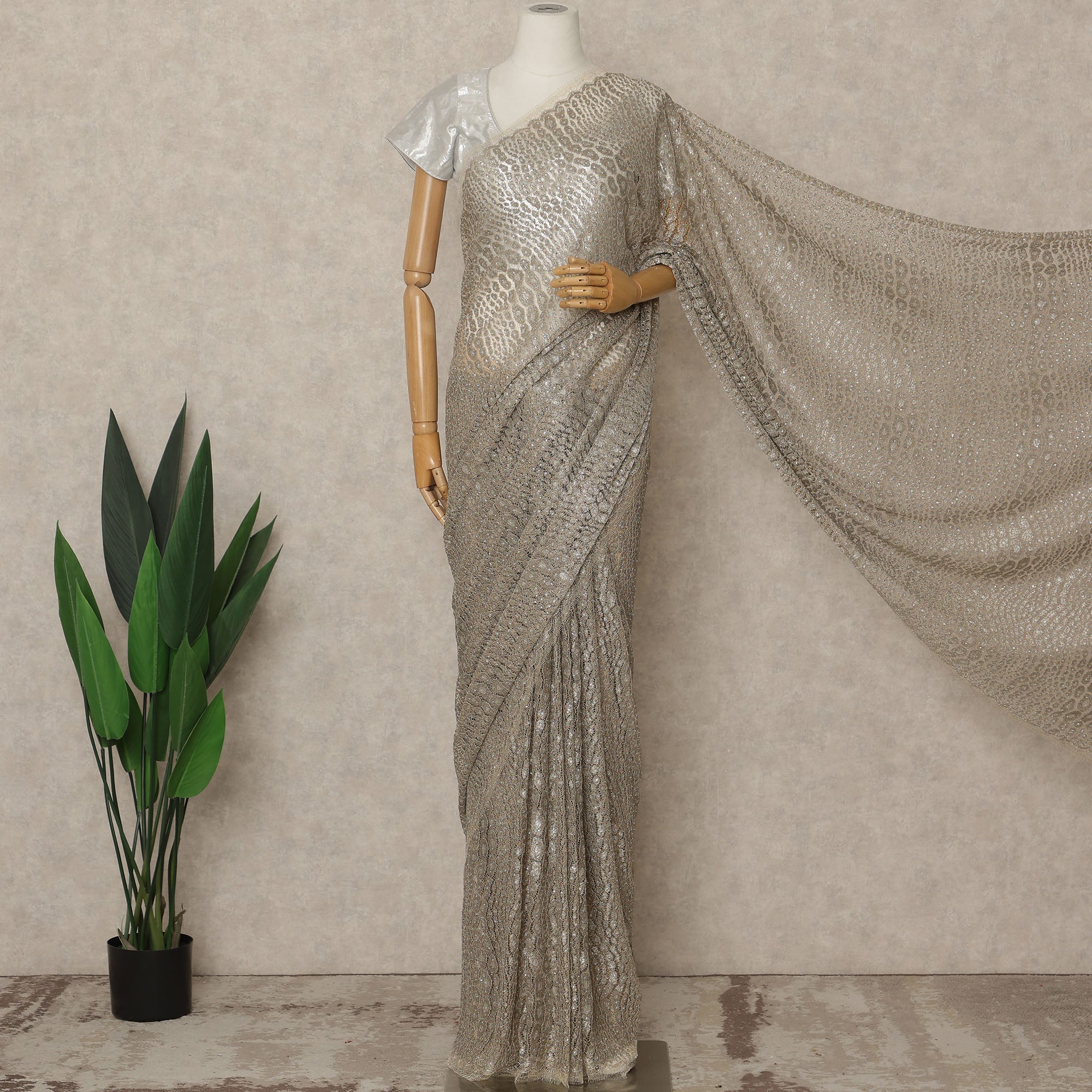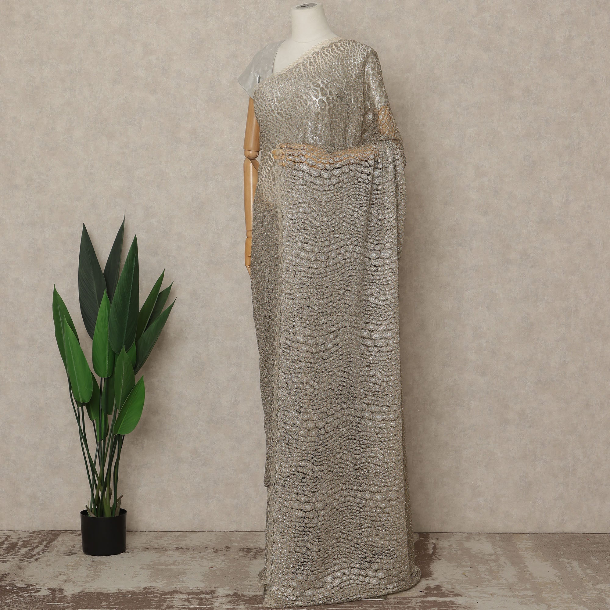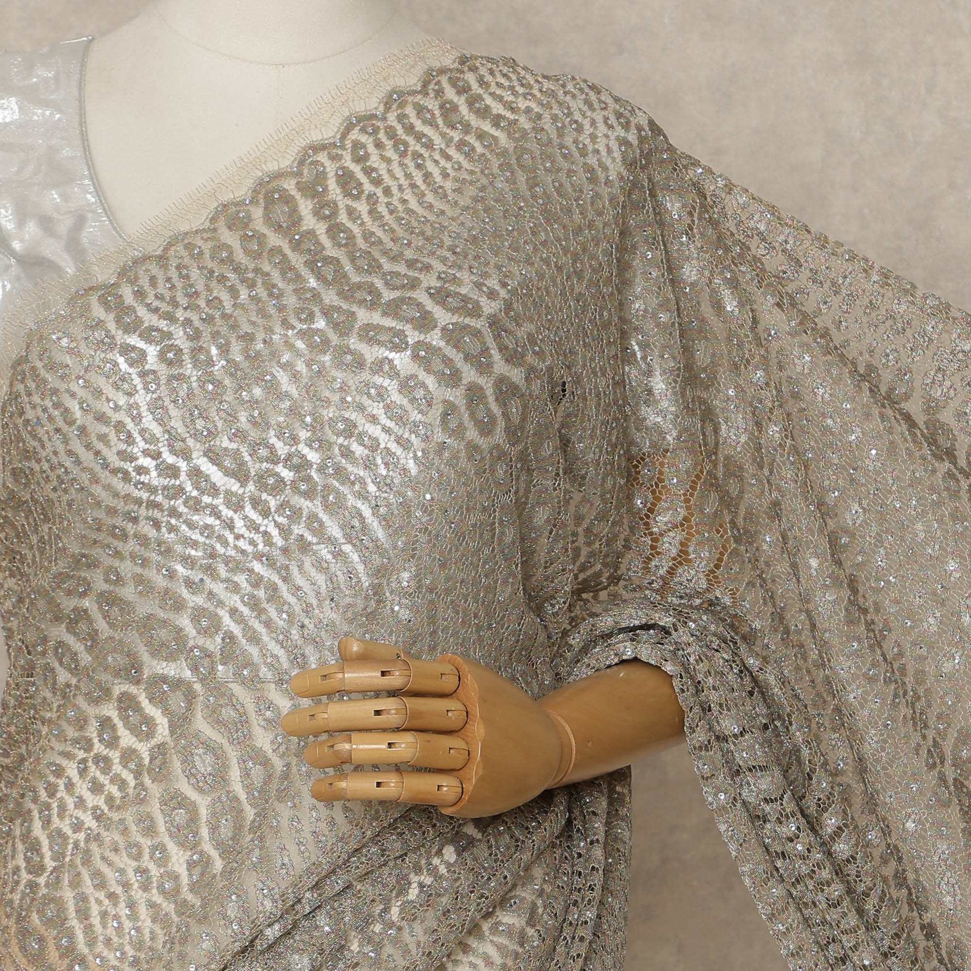 Exude refined glamour with this premium French metallic Chantilly saree lace in a rich antique gold shade, exquisitely crafted in France to showcase superior European craftsmanship. This luxurious lace features intricate Chantilly patterns with a subtle metallic finish, beautifully accented with fine stone work that creates a sophisticated shimmer across the fabric. Lightweight yet richly textured, the lace drapes effortlessly, offering a graceful fall ideal for designer sarees, couture gowns, bridal ensembles, and statement overlays. The antique gold tone radiates timeless elegance and pairs seamlessly with ivory, champagne, beige, and metallic accents, making it perfect for weddings, receptions, festive celebrations, and evening occasions. This piece measures approximately 5.5 meters in length with a width of 110 cms, providing ample fabric for seamless draping and creative styling. Blouse is not included. To maintain the metallic sheen, lace finesse, and stone embellishments, professional dry cleaning is recommended. Buy online to experience authentic French luxury, shop online for premium imported metallic Chantilly lace, and purchase online to elevate your couture collection with enduring sophistication.
