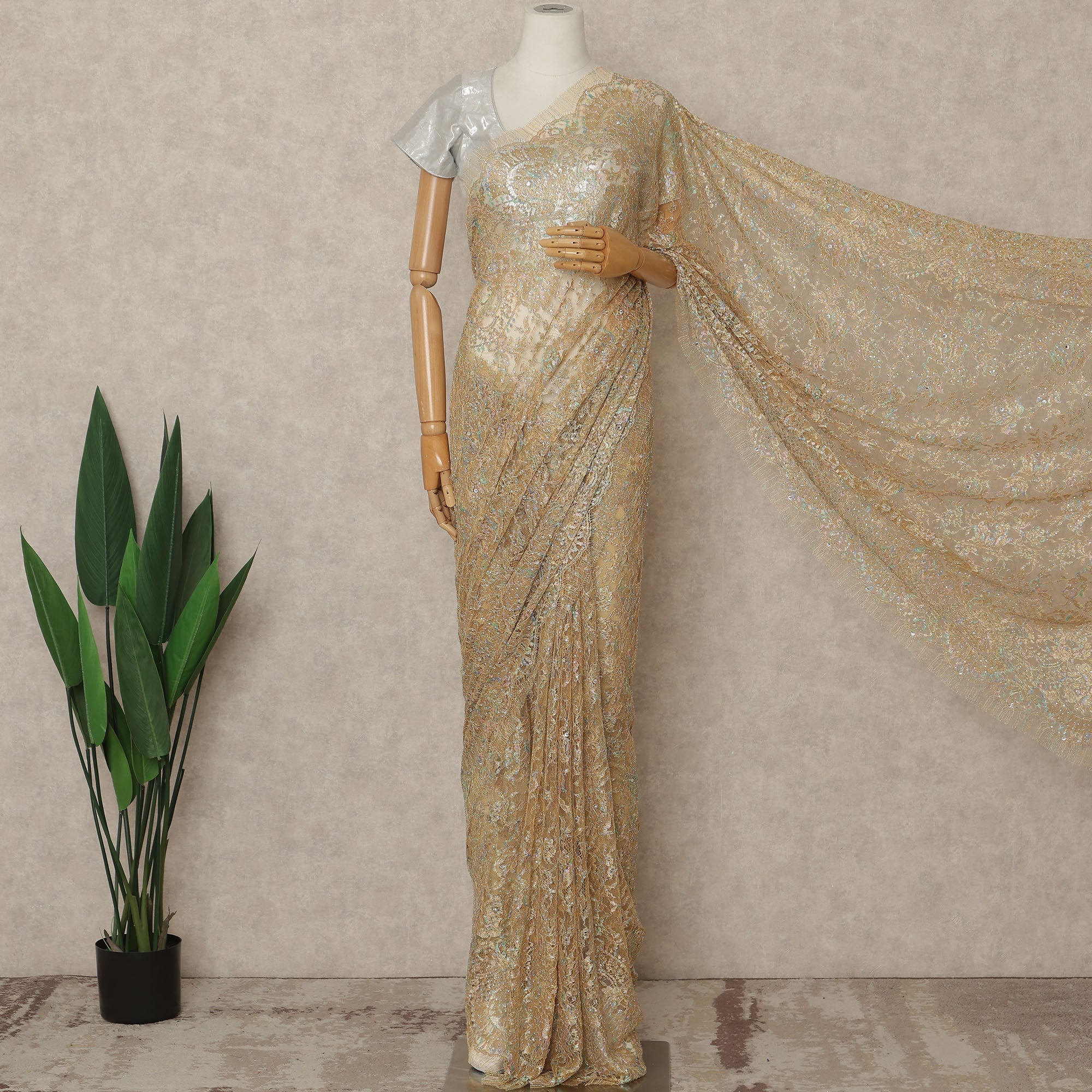 This antique gold premium French metallic Chantilly saree lace with stonework is a masterpiece of refined luxury and couture craftsmanship. Designed on a delicate sheer net base, the intricate Chantilly floral motifs are beautifully enhanced with metallic threads and detailed stone embellishments that create a radiant, multidimensional shimmer. The antique gold tone is enriched with subtle iridescent highlights, adding depth and a regal glow perfect for bridal wear, receptions, evening celebrations, and grand festive occasions. Crafted in France, this exquisite lace reflects heritage artistry blended with contemporary glamour. Measuring approximately 5.5 meters in length and 110 cms in width, it offers generous fabric for a graceful saree drape with fluid movement and an opulent finish. Blouse not included.