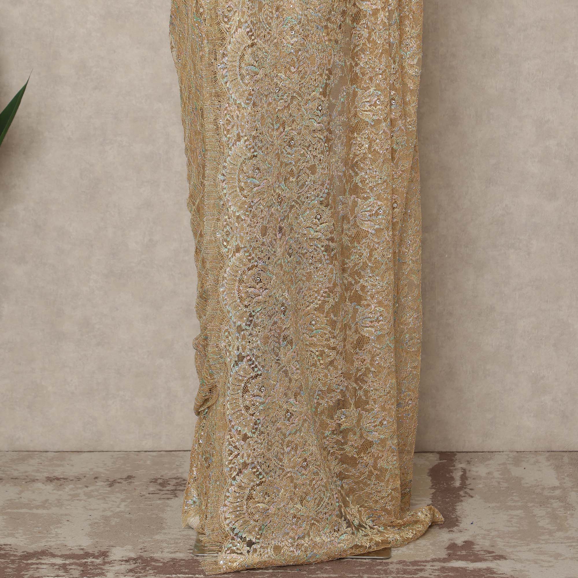 Antique Gold Premium French Metallic Chantilly Saree Lace With Stonework 5.5 Mtrs 110 Cms Width France-D27772