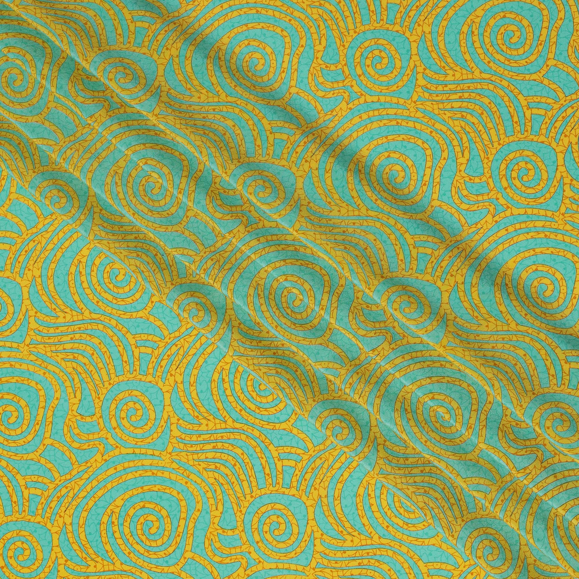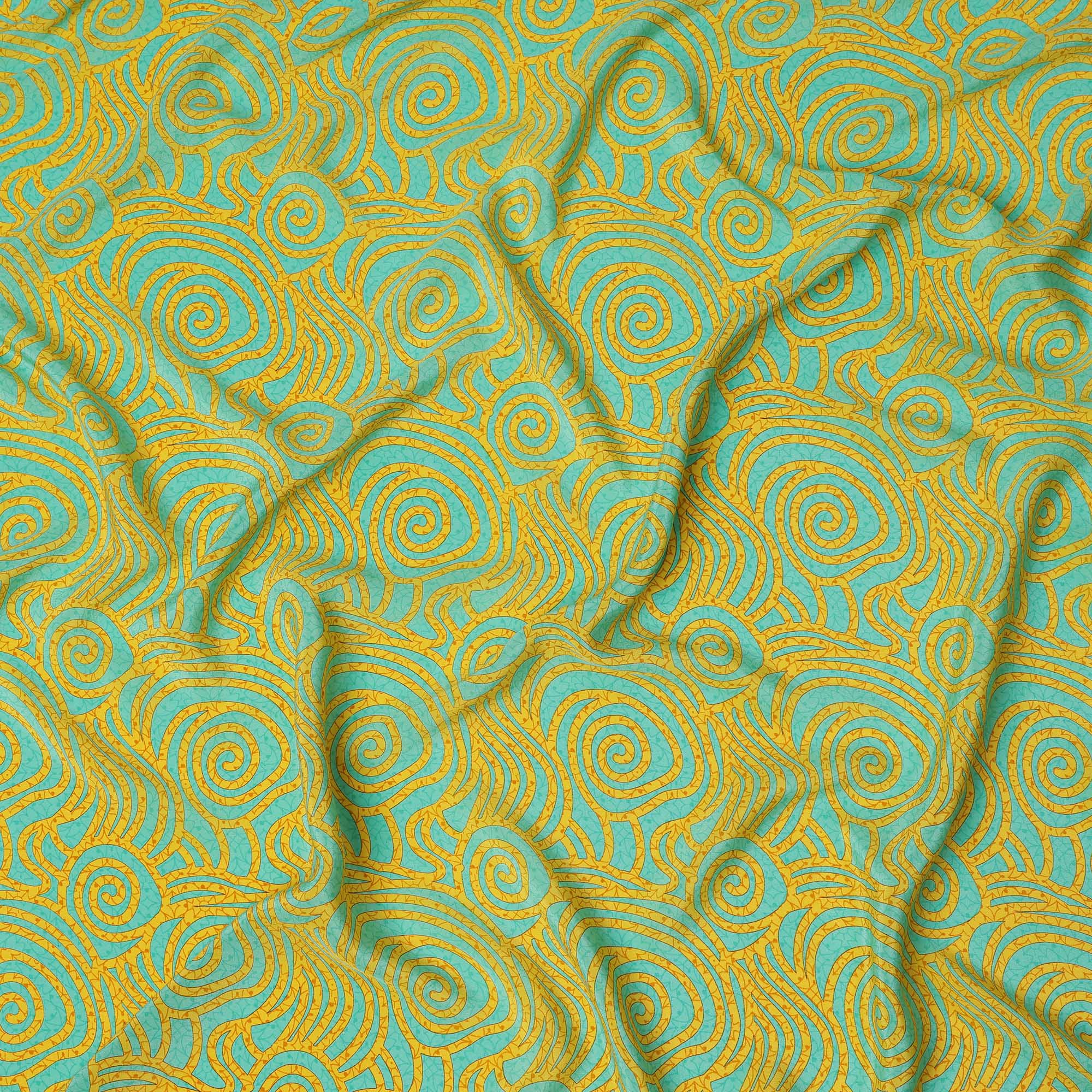 Aqua and Mustard Swirl Mosaic Print Pure Silk Crepe Fabric, 110 Cms Width, Made in India-D23175