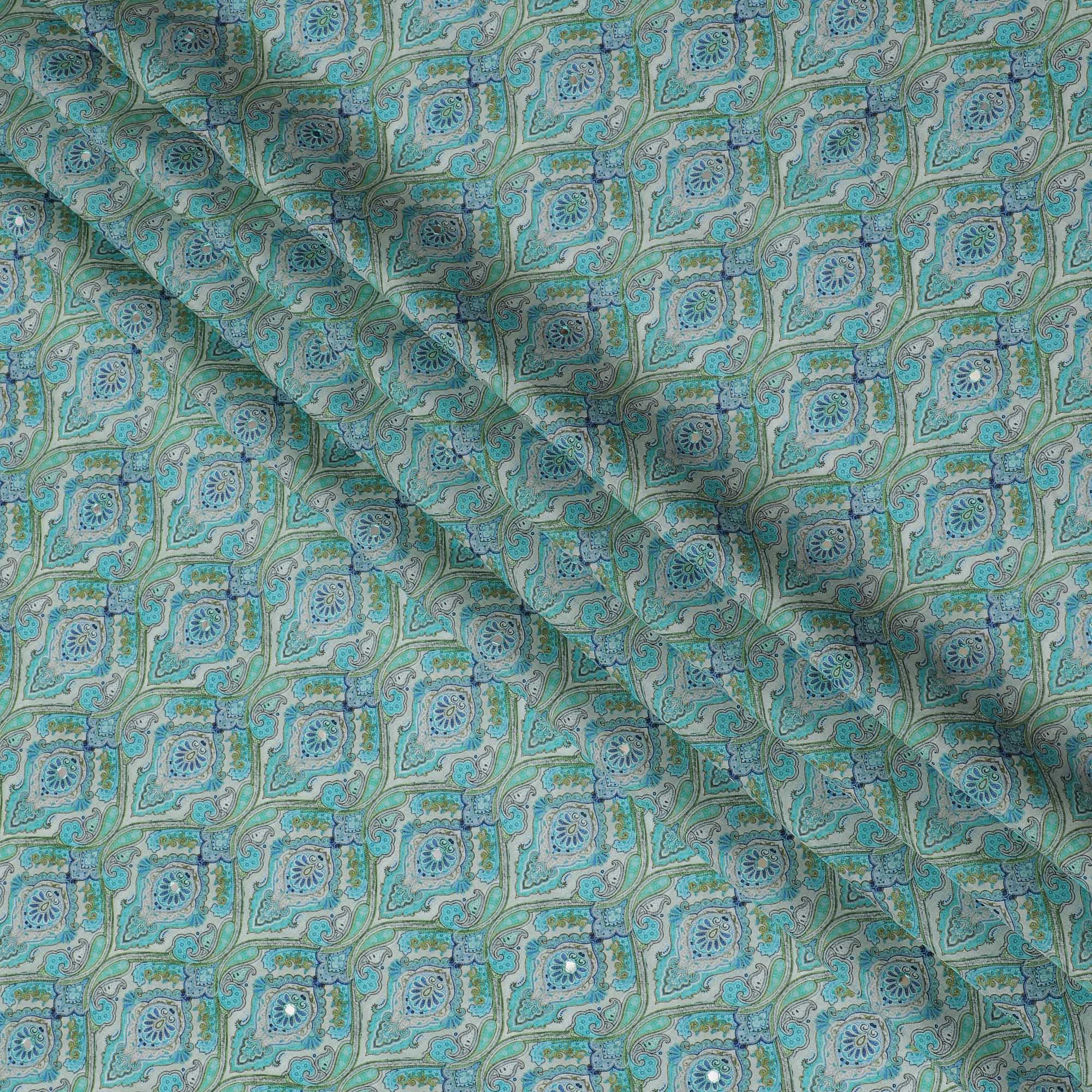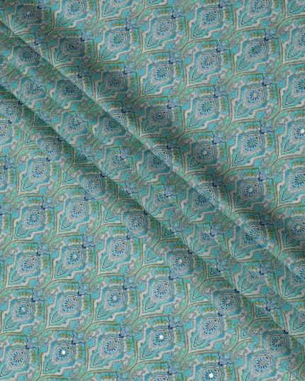 Embrace the timeless elegance of our Aqua Blue and Green Paisley Viscose Crepe Printed Fabric, featuring a delicate paisley pattern in soothing shades of aqua blue, green, and grey on a soft, lightweight crepe fabric. This viscose crepe offers an exquisite drape, perfect for crafting stylish dresses, blouses, skirts, and more. With a width of 110 cm, this fabric provides ample material for various sewing projects. The intricate paisley design adds a touch of sophistication, making it suitable for both casual and formal attire. Enhance your wardrobe with this versatile and high-quality fabric. Shop online now to add this beautiful paisley fabric to your collection.