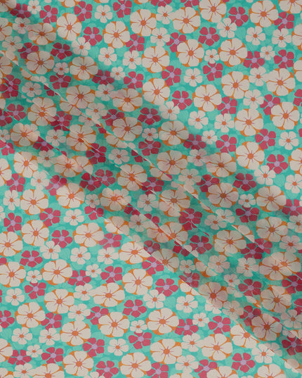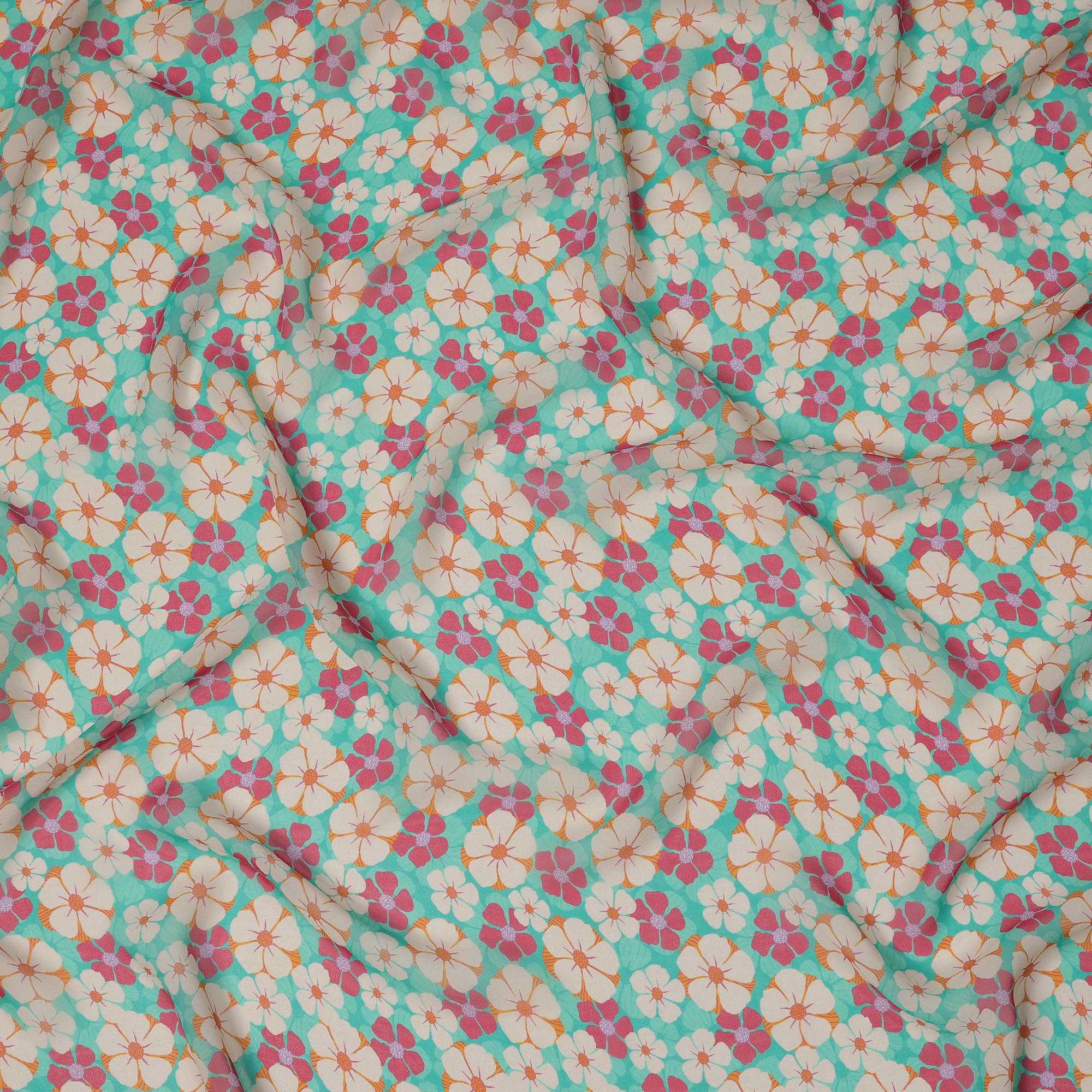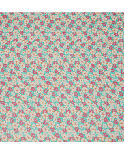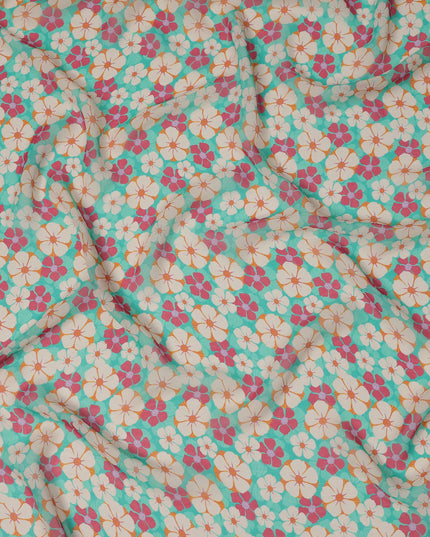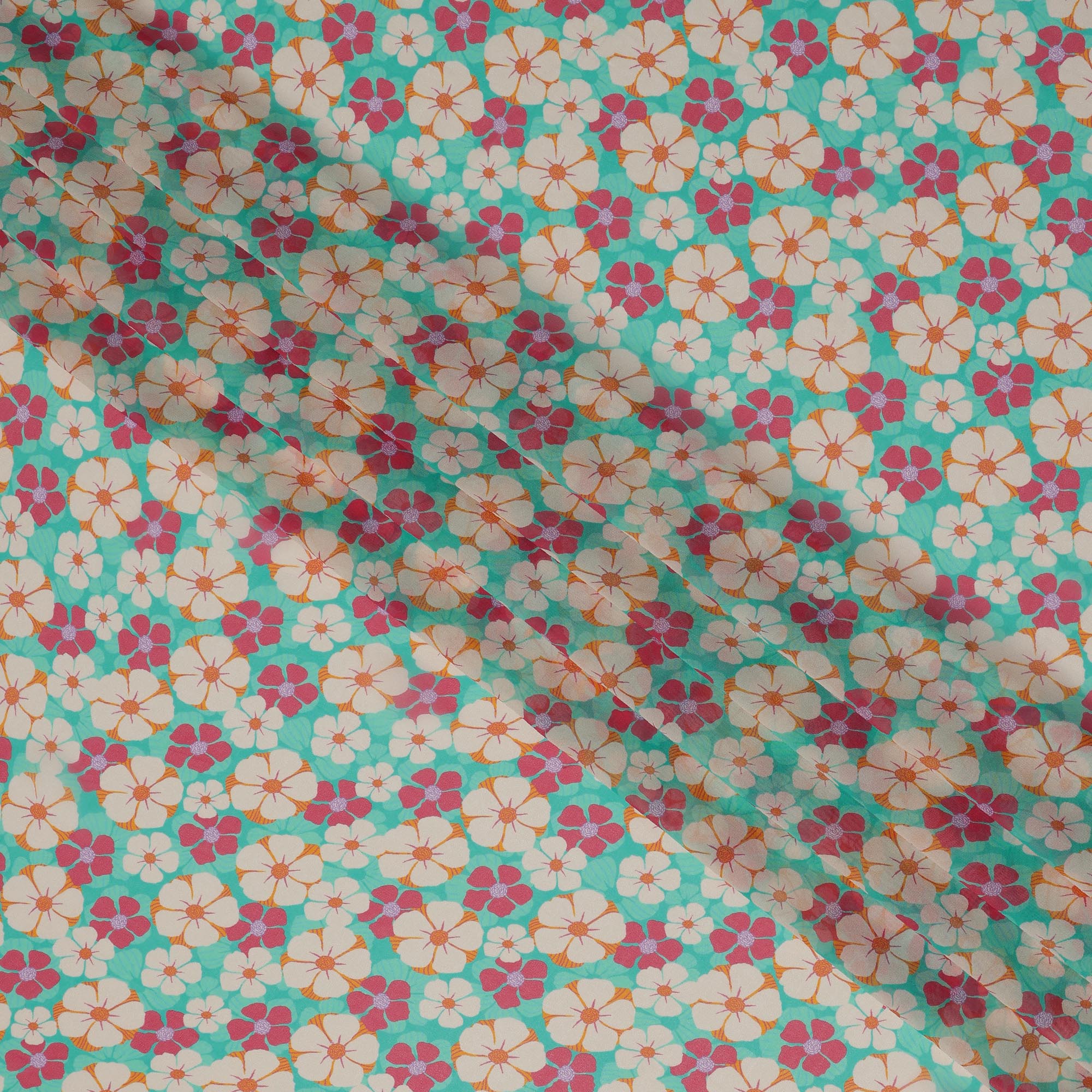 Brighten your ensemble with this aqua blue synthetic georgette fabric featuring a vibrant all-over floral print in off-white, magenta, and subtle orange accents. The bold flower clusters create a lively and youthful aesthetic, making it ideal for statement sarees, breezy kurtis, or trendy festive wear. The lightweight, semi-sheer texture of georgette gives it a graceful fall and fluid movement, while the 110 cms width provides flexibility for a variety of design possibilities. Crafted in India using high-quality synthetic yarns, this fabric offers durability and easy maintenance along with a fashionable flair. Whether you're crafting ethnic outfits or modern silhouettes, shop online to discover this eye-catching floral georgette that blends bold colors with playful sophistication.