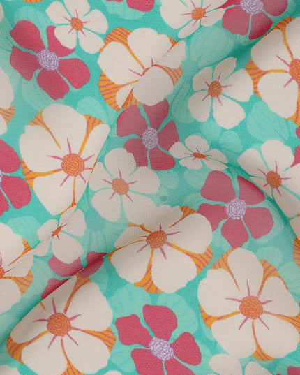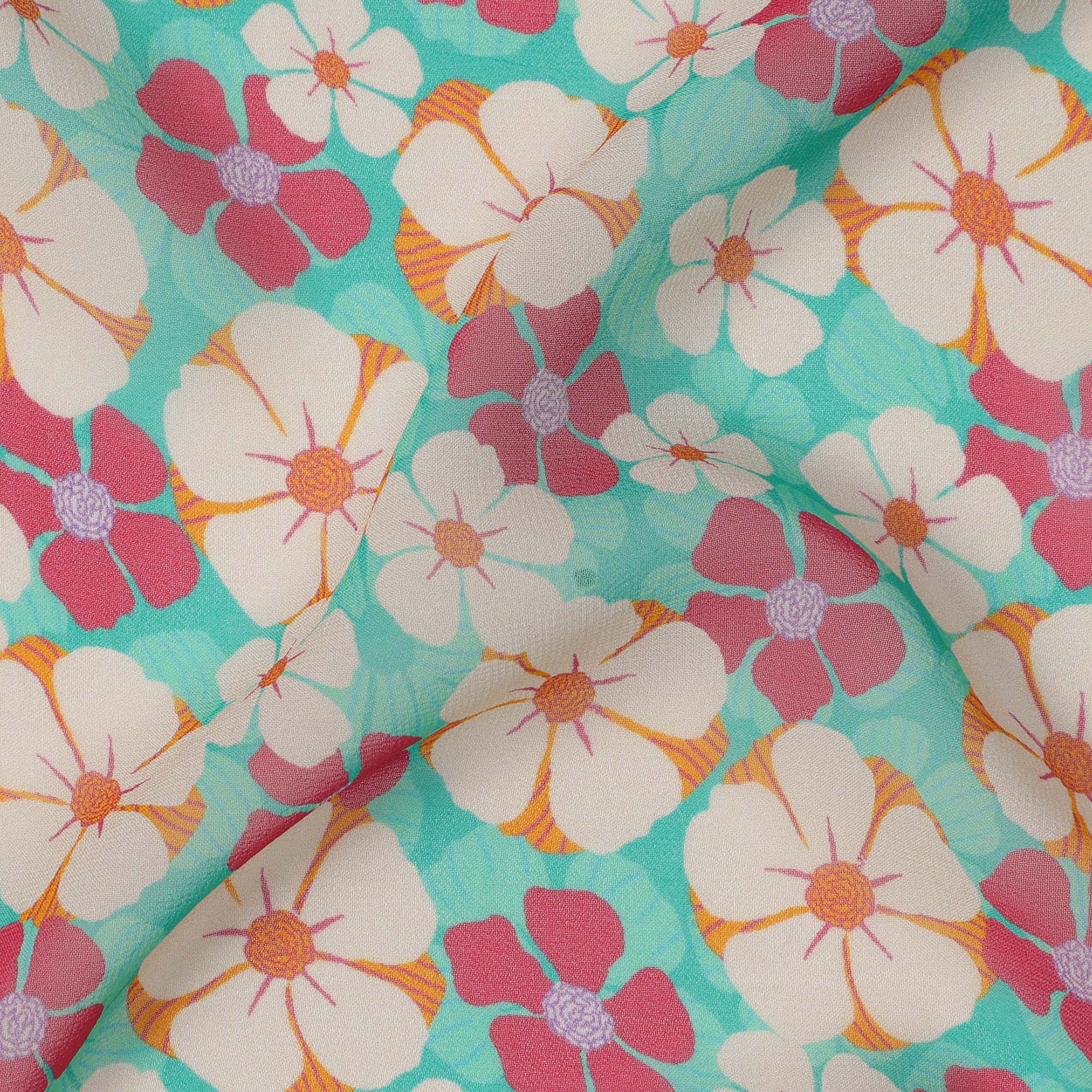 Aqua Blue Bold Floral Printed Synthetic Georgette Fabric with Off-White and Magenta Motifs, Width 110 Cms, Made in India-D23323