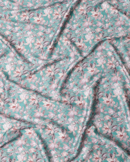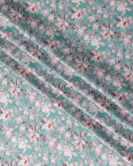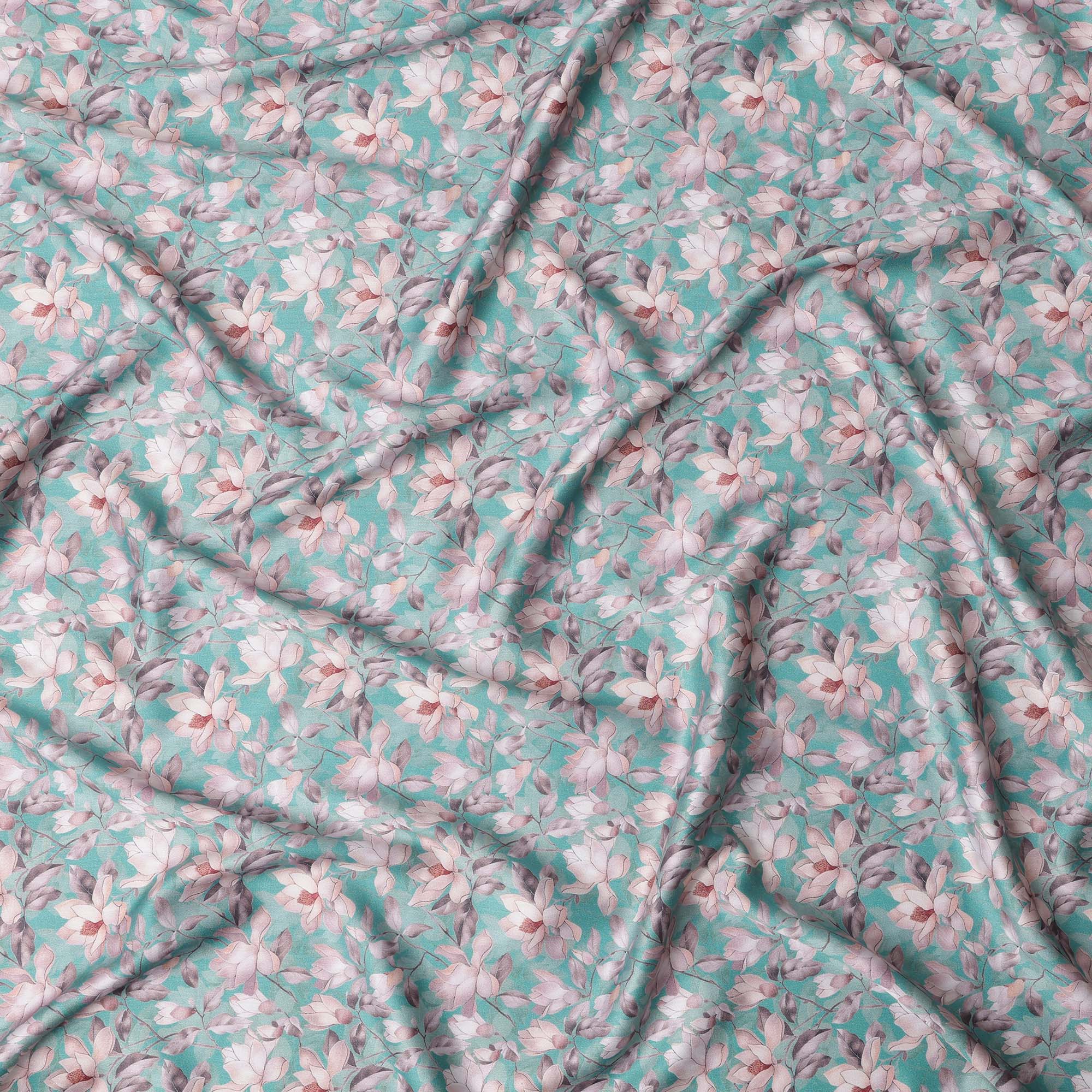 Aqua blue cotton satin fabric with an exquisite white & pink floral print.