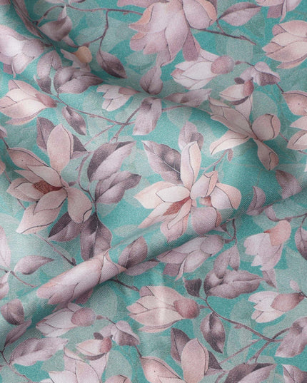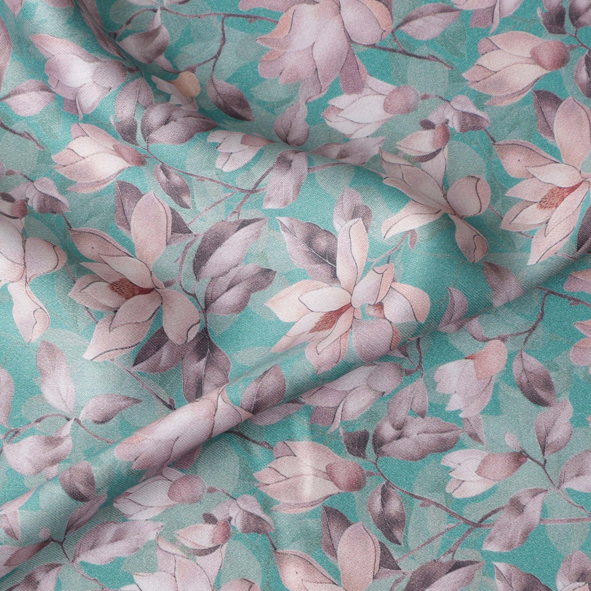 Enhance your wardrobe and décor with this aqua blue cotton satin fabric, beautifully adorned with a delicate white and pink floral print that exudes elegance and charm. Imported from India, this high-quality satin fabric features a smooth texture, subtle sheen, and fluid drape, making it ideal for designer apparel, stylish tops, ethnic wear, and refined home décor. The intricate floral pattern set against the serene aqua blue backdrop creates a refreshing and timeless appeal, perfect for both modern and classic styles. With a 110 cm width, this fabric provides excellent versatility, while its breathable, lightweight, and skin-friendly properties ensure superior comfort. Shop online today to bring a touch of sophistication and beauty to your collection.
