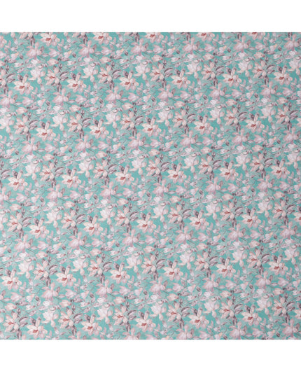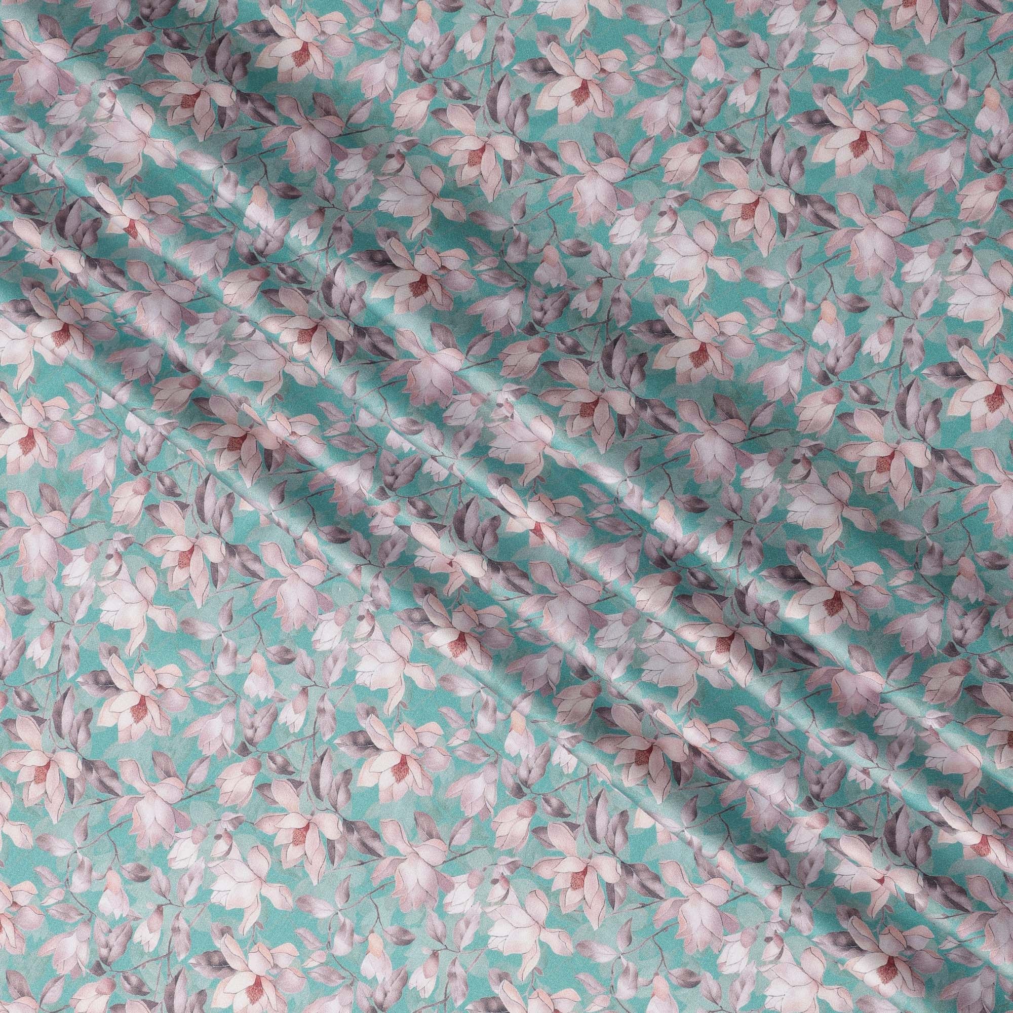 Aqua Blue Cotton Satin Fabric with White & Pink Floral Print – 110 cm, Imported from India-D22301