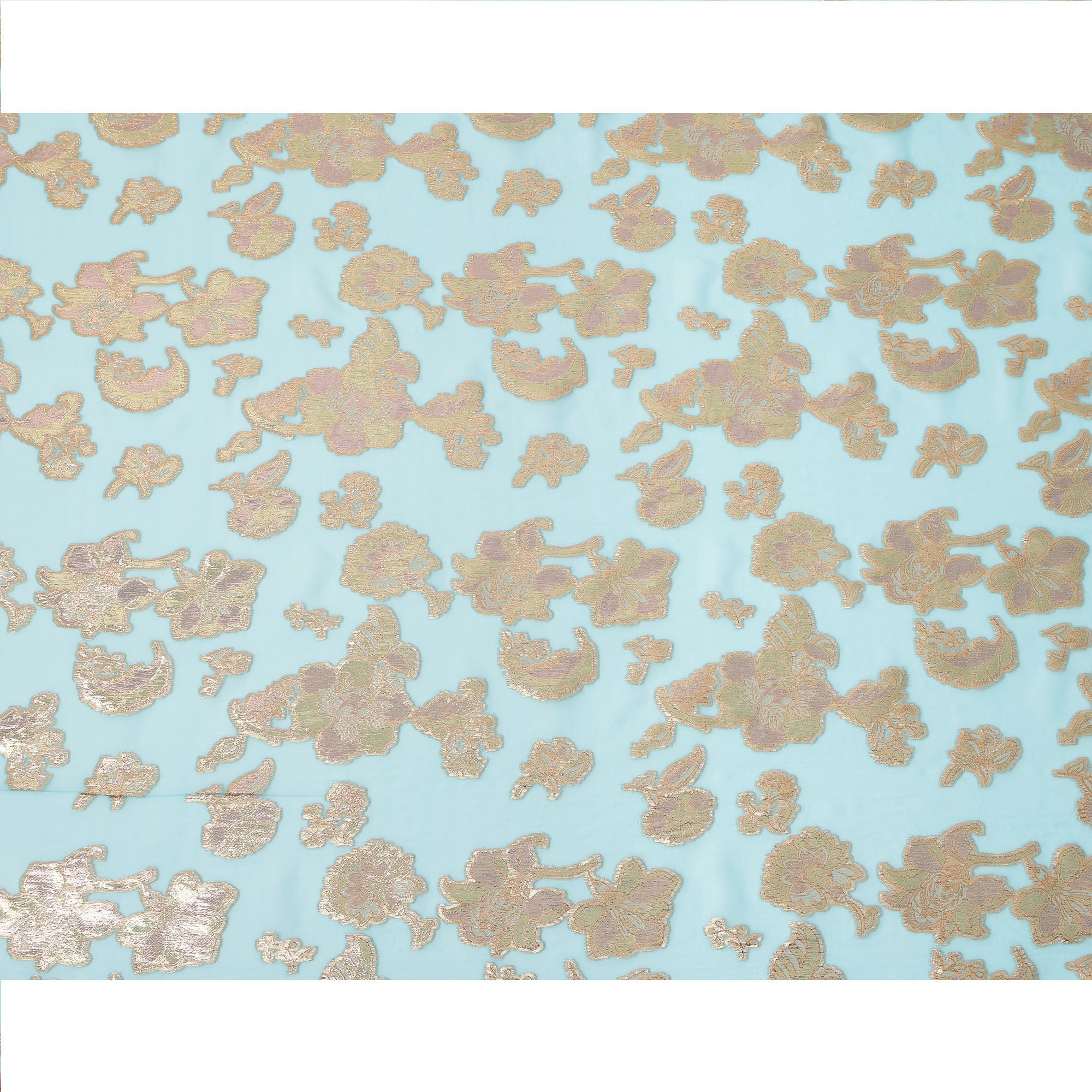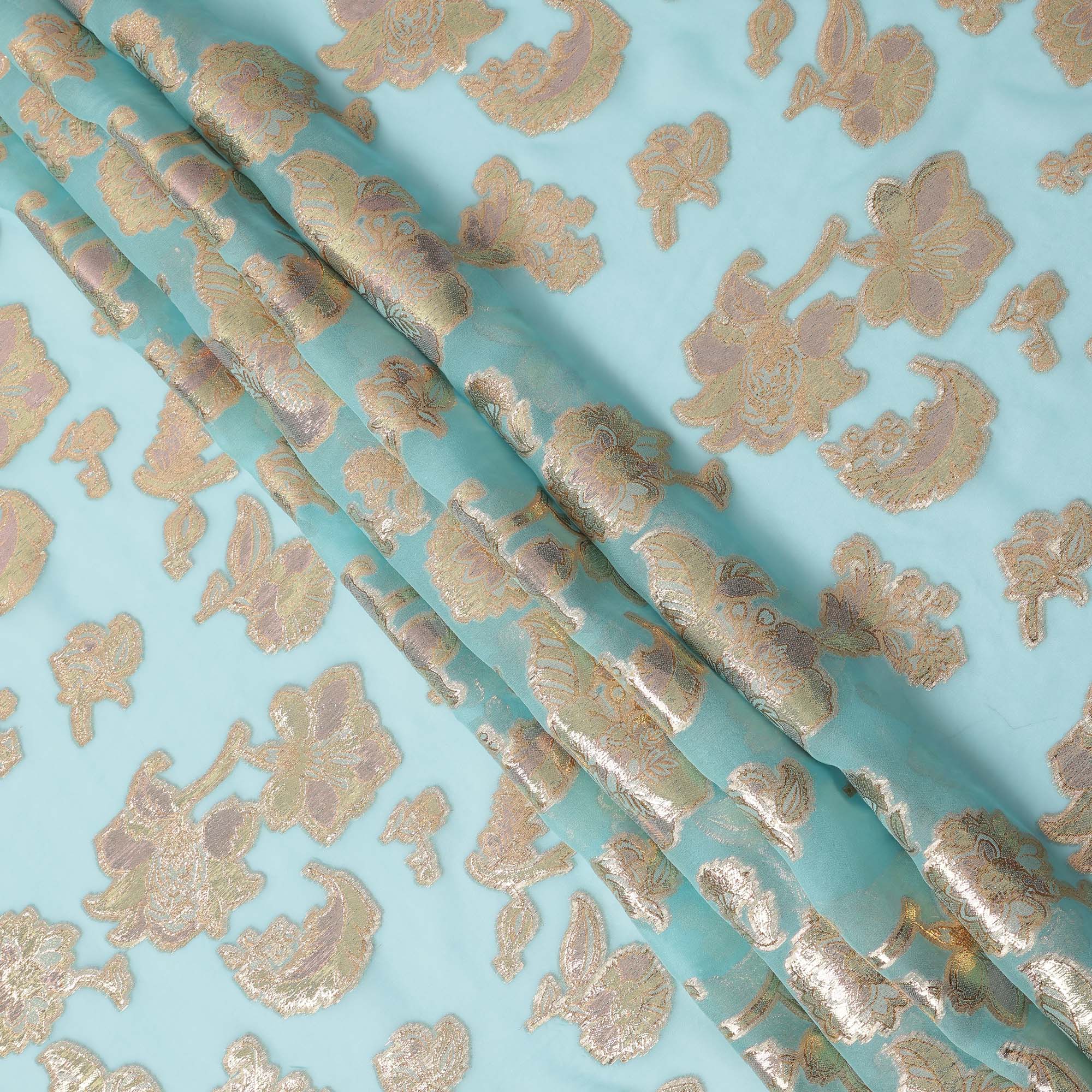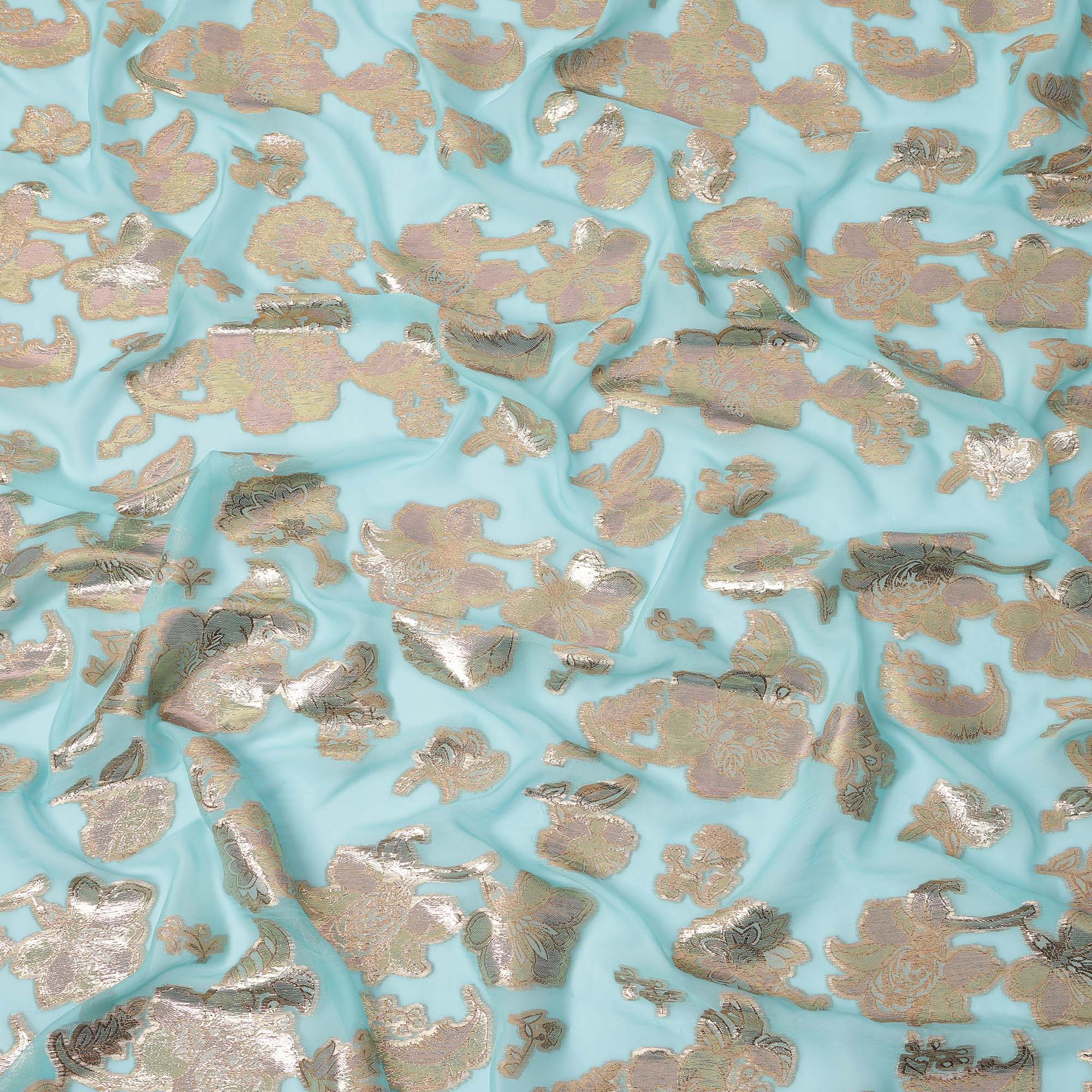 Aqua Blue Gold Metallic Lurex Floral Design Premium Silk Chiffon Fabric, 110 Cms Width, Made in South Korea-D25957