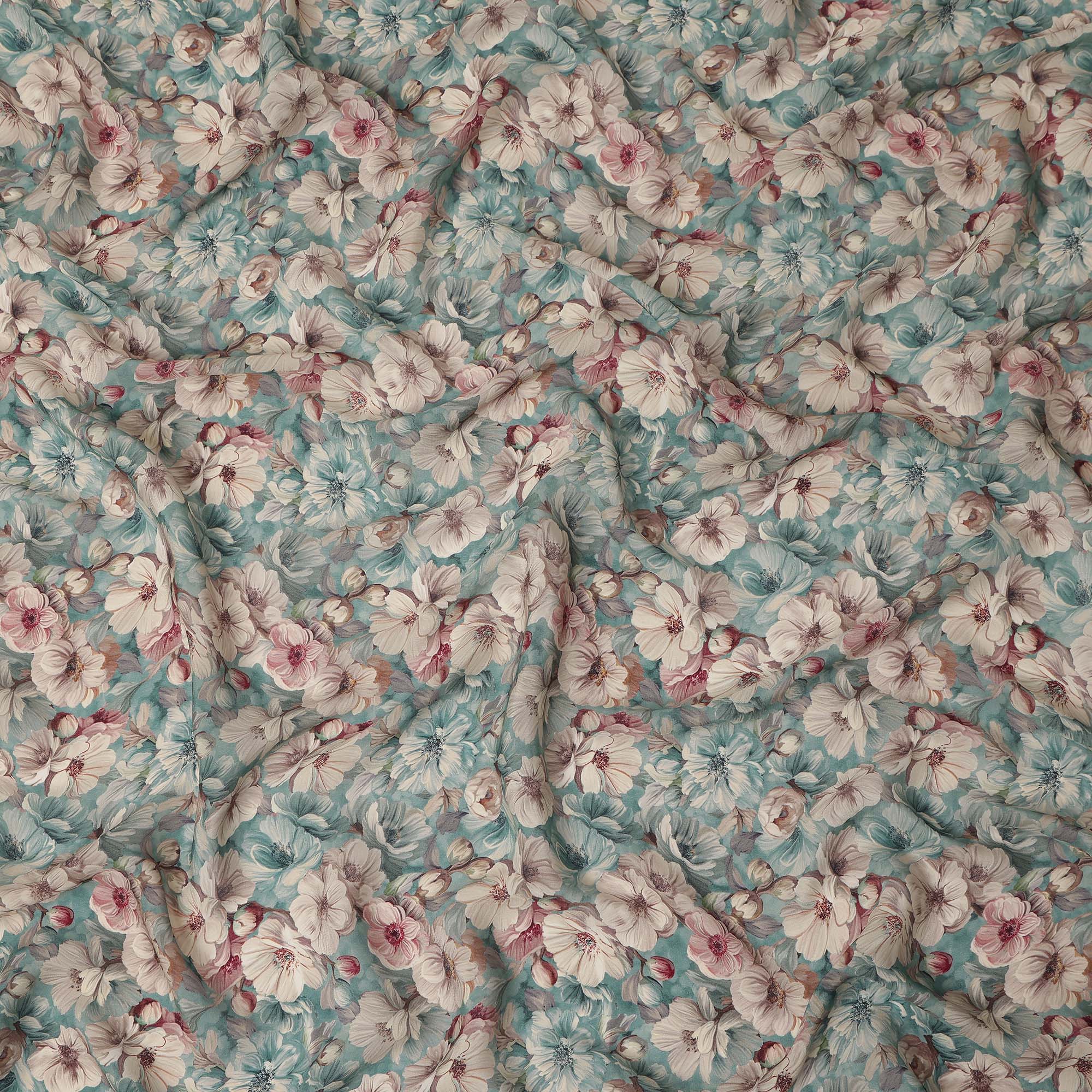 This aqua blue viscose crepe printed fabric showcases a refreshing blend of soft ivory, blush pink, and muted sage florals... Read more Read more
