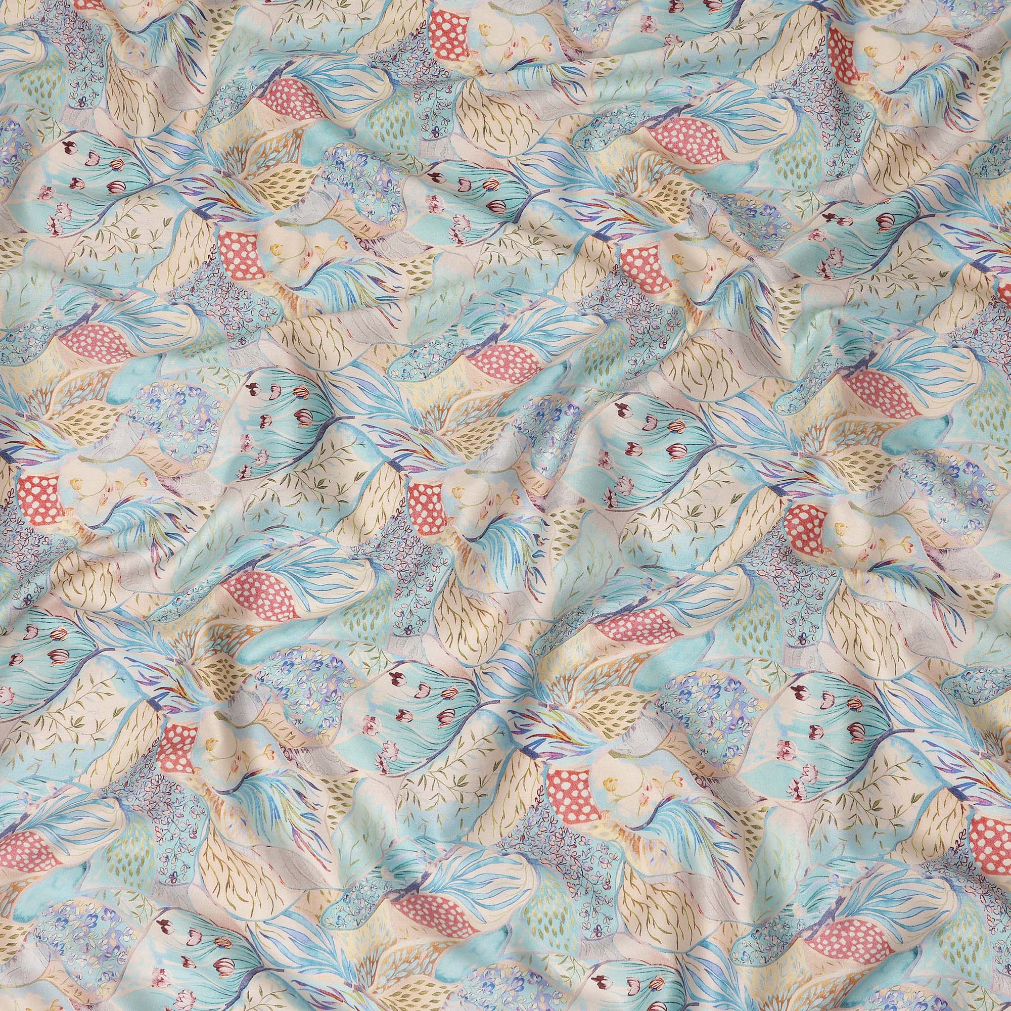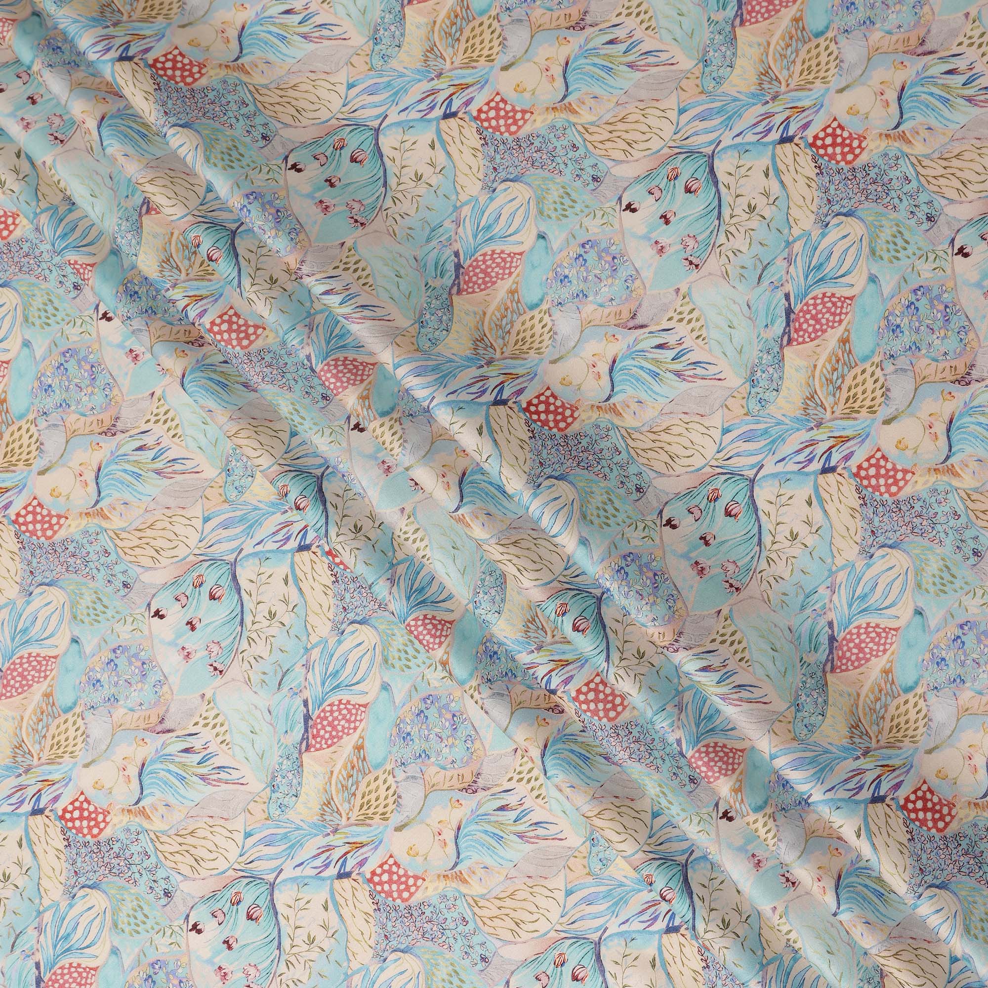 This aqua blue multicolor bird floral printed cotton satin fabric features a refreshing aqua blue base adorned with artistic bird and botanical motifs in soft pastel shades of sky blue, peach, yellow, and muted green. The flowing composition of birds and leaves creates a lively yet elegant visual appeal that blends nature inspired charm with modern design aesthetics. Crafted from premium cotton satin, the fabric offers a smooth and silky texture with a gentle natural sheen that enhances the depth and detailing of the print. With a width of 110 cms, it provides versatility for designing dresses, kurtis, tops, skirts, and coordinated outfits. The breathable cotton composition ensures comfortable wear throughout the day, while the satin weave delivers a fluid drape and refined finish, making it an excellent choice for stylish and designer garment creations from India.
