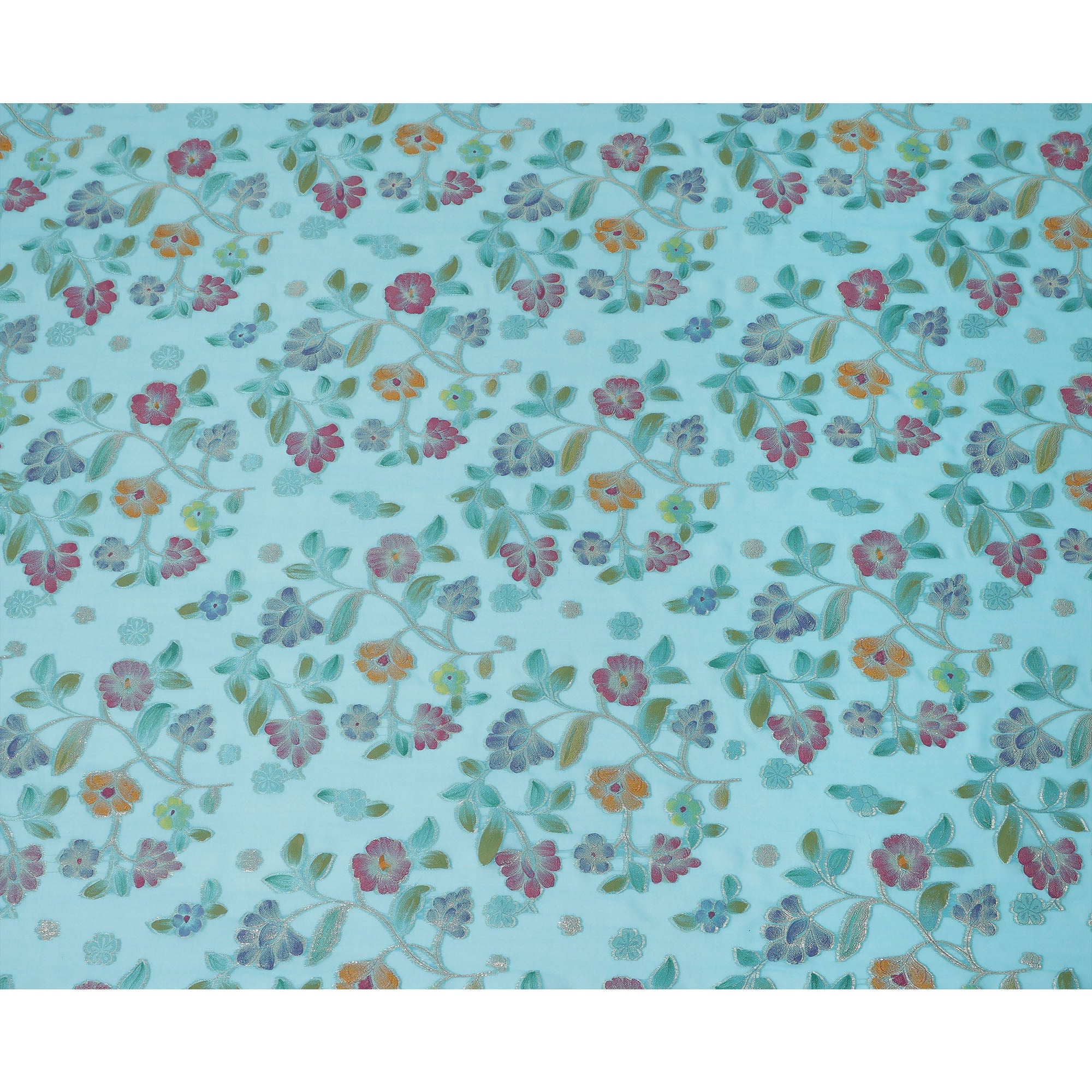 Aqua Blue Multicolor Floral Embroidered Metallic Lurex Design Premium Silk Chiffon Fabric, 110 Cms Width, Made in South Korea-D25748