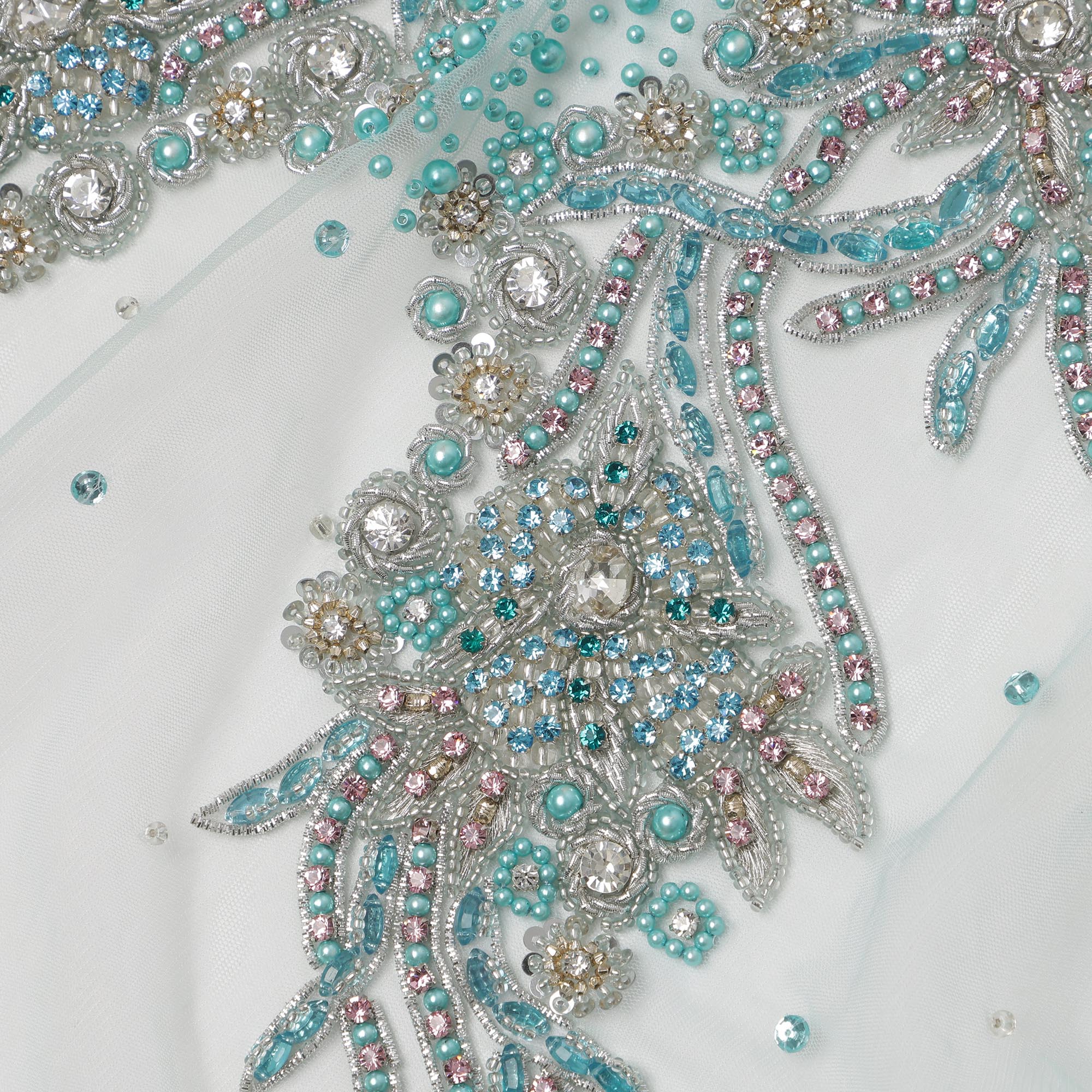 Silver sequin and aqua bead embellishments create radiant detailing.