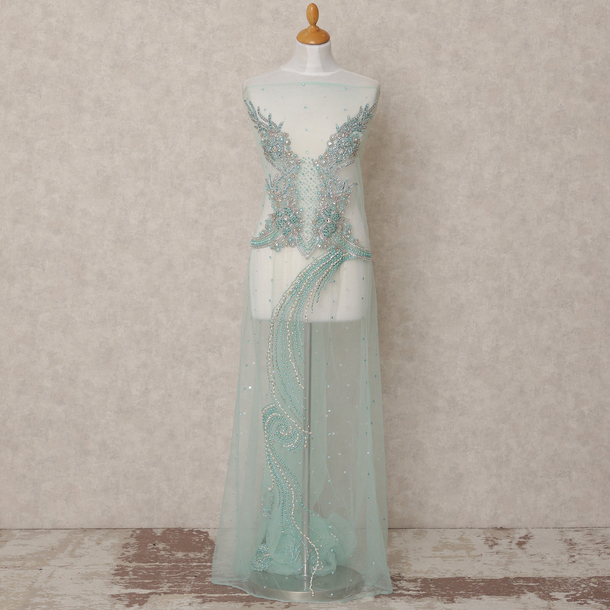 This aqua blue nylon tulle fabric is a vision of delicate beauty, featuring luxurious hand embroidery with silver sequins and aqua beads arranged in a dramatic swirl and floral motif. Specially designed in a 3-meter length for crafting Fustaann dresses, this 140 cm wide fabric showcases the elegance of sheer netting enhanced by fluid embellishments. The shimmering threadwork flows effortlessly over the transparent tulle base, offering a regal and contemporary appeal perfect for weddings, evening gowns, or festive occasions. The fabric maintains a lightweight yet sturdy feel, allowing graceful draping while retaining its ornate detailing. Crafted in India, it reflects a heritage of fine embroidery and attention to intricate design. Ideal for designers and boutique creators looking to buy online a luxurious fabric for bespoke fashion.