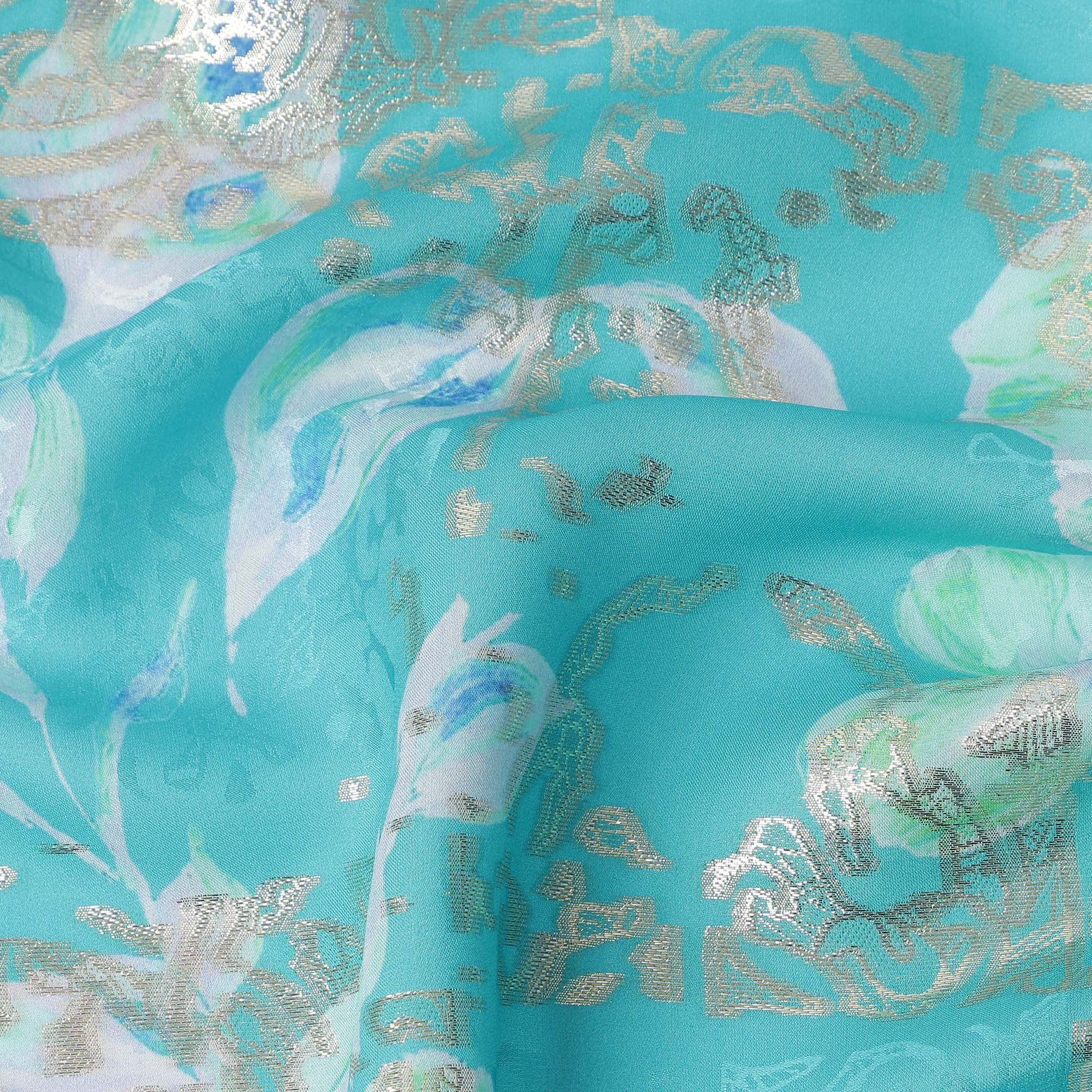 Bring home the charm of refined luxury with this Aqua Blue with White and Green Floral Print Pure Silk Satin Fabric, masterfully crafted in South Korea to exude elegance and sophistication. The serene aqua blue base is beautifully complemented by soft white and green floral motifs highlighted with subtle metallic accents, adding a touch of shimmer and artistic flair. Made from 100% premium pure silk, this satin fabric features a smooth, glossy texture and fluid drape, making it ideal for crafting sarees, dresses, gowns, blouses, scarves, and graceful home décor pieces. Its generous 140 cm width allows for versatile tailoring and creative design expression. Lightweight, breathable, and lustrous, this fabric embodies the perfect blend of comfort and luxury. The delicate floral pattern gives it a timeless appeal, perfect for festive, bridal, or high-fashion creations. To preserve its natural shine and softness, dry clean only. Shop online today to experience the artistry of fine Korean silk craftsmanship.