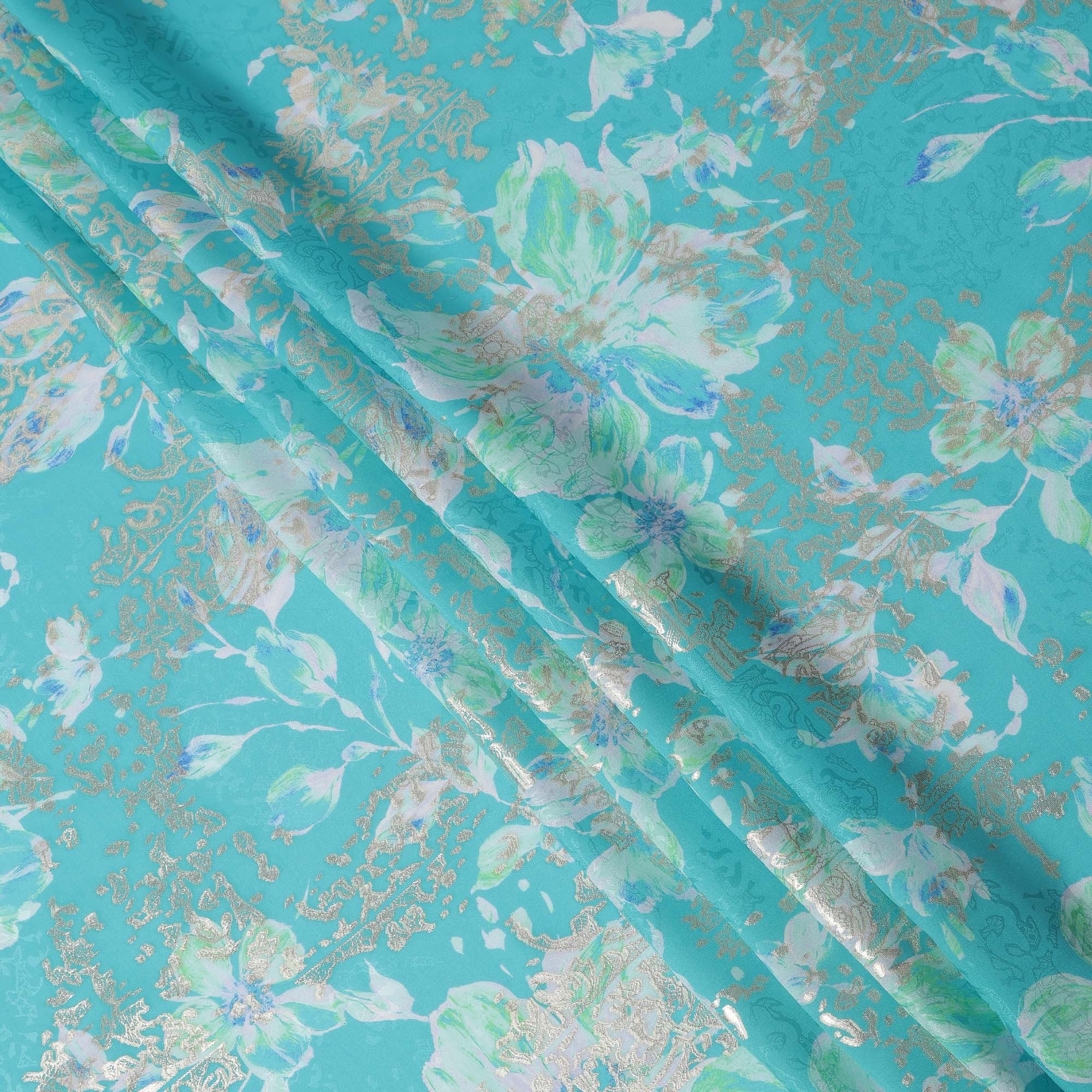 Premium Aqua Blue with White and Green Floral Print Pure Silk Satin Fabric with glossy sheen