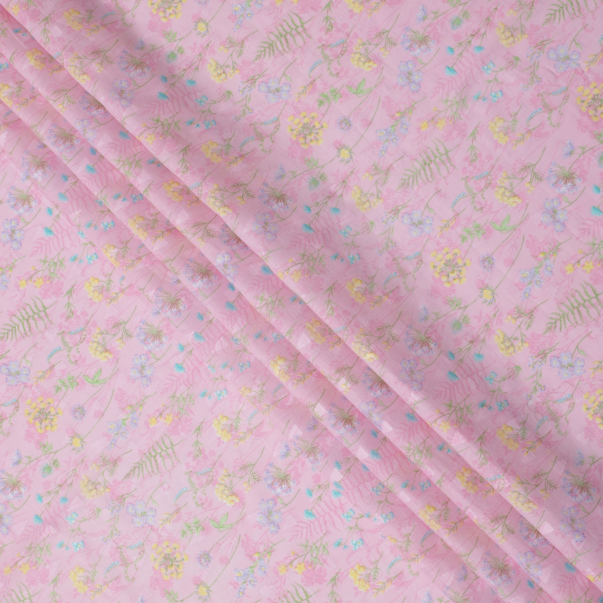 Soft and cheerful, this baby pink cotton voile fabric features a whimsical botanical floral print with scattered pastel blooms in yellow, turquoise blue, lilac, and soft green, delicately complemented by sprigs and ferns for a garden-fresh feel. The airy cotton voile base offers a lightweight and breathable texture, ideal for summer sarees, casual kurtis, breezy tops, and dupattas. The delicate detailing and pastel color palette give this fabric a soothing and youthful appeal, while the sheer quality enhances its elegance. Measuring 110 cms in width, this fabric is easy to work with for both traditional and contemporary silhouettes. Made in India with fine-quality cotton and expert printing, it is a beautiful blend of comfort and playful style. Shop online now to refresh your warm-weather wardrobe with this pastel floral delight.
