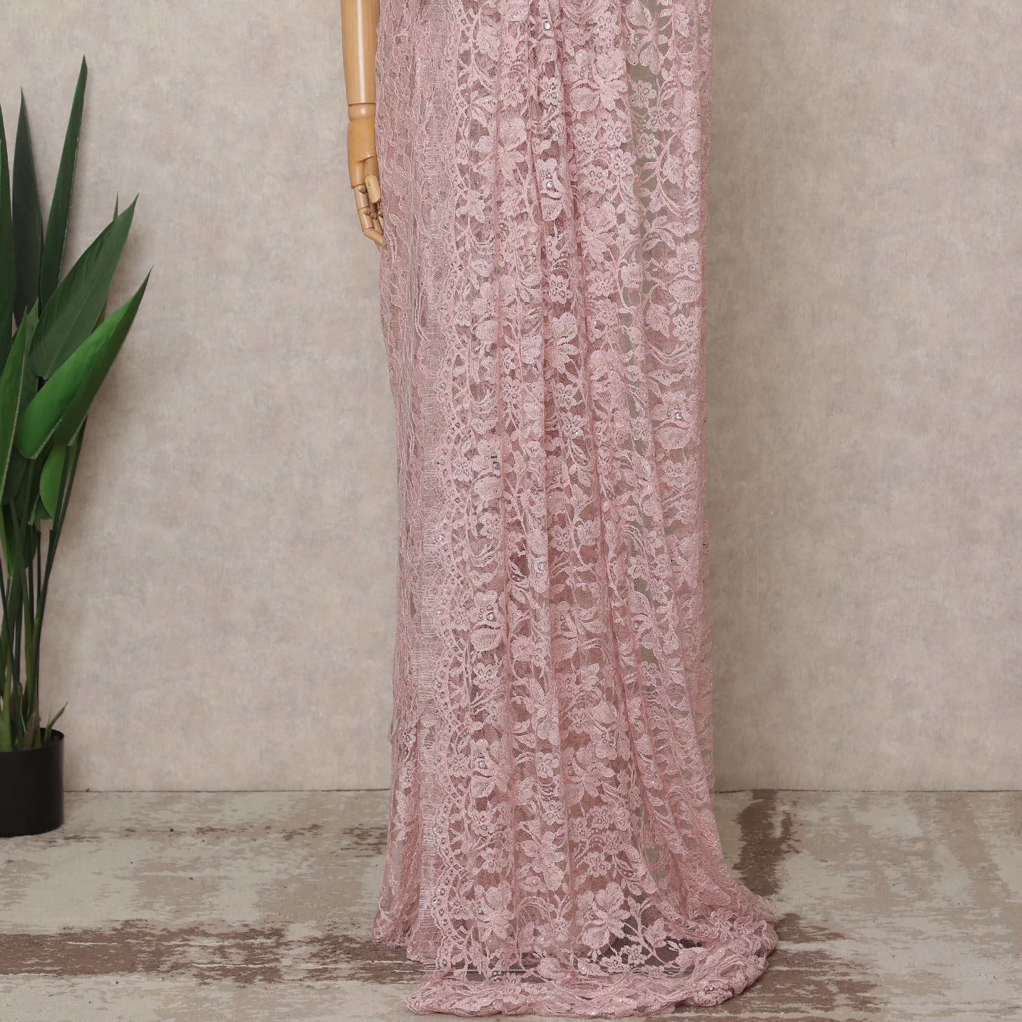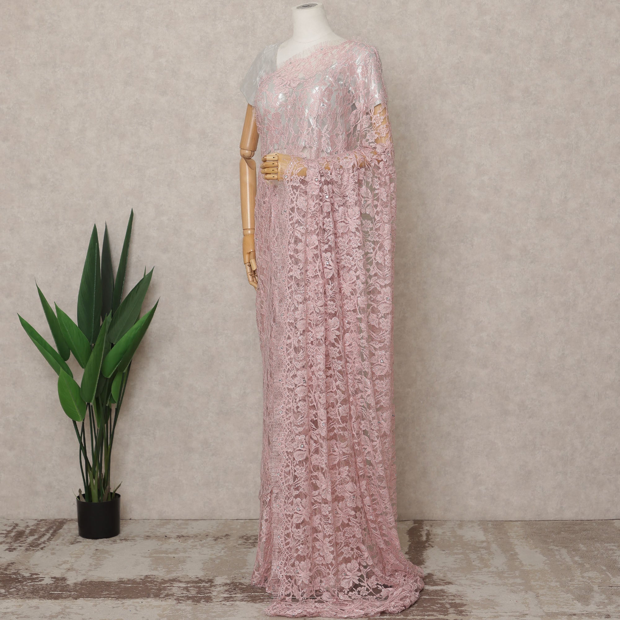 Baby Pink Premium French 2-Tone Chantilly Lace Saree with Stone Work, Width 110 Cms, 5.5 Mtrs, France-D25560
