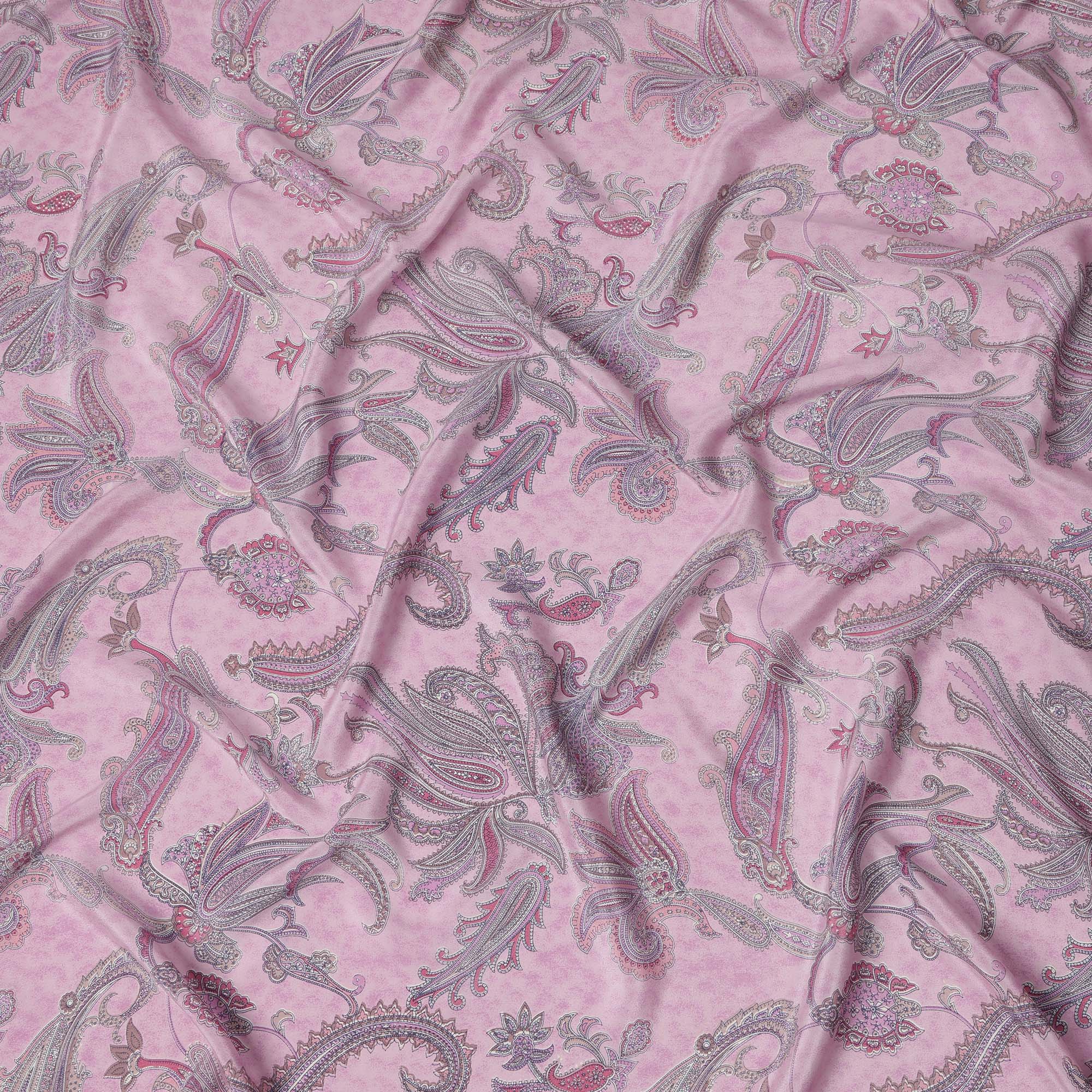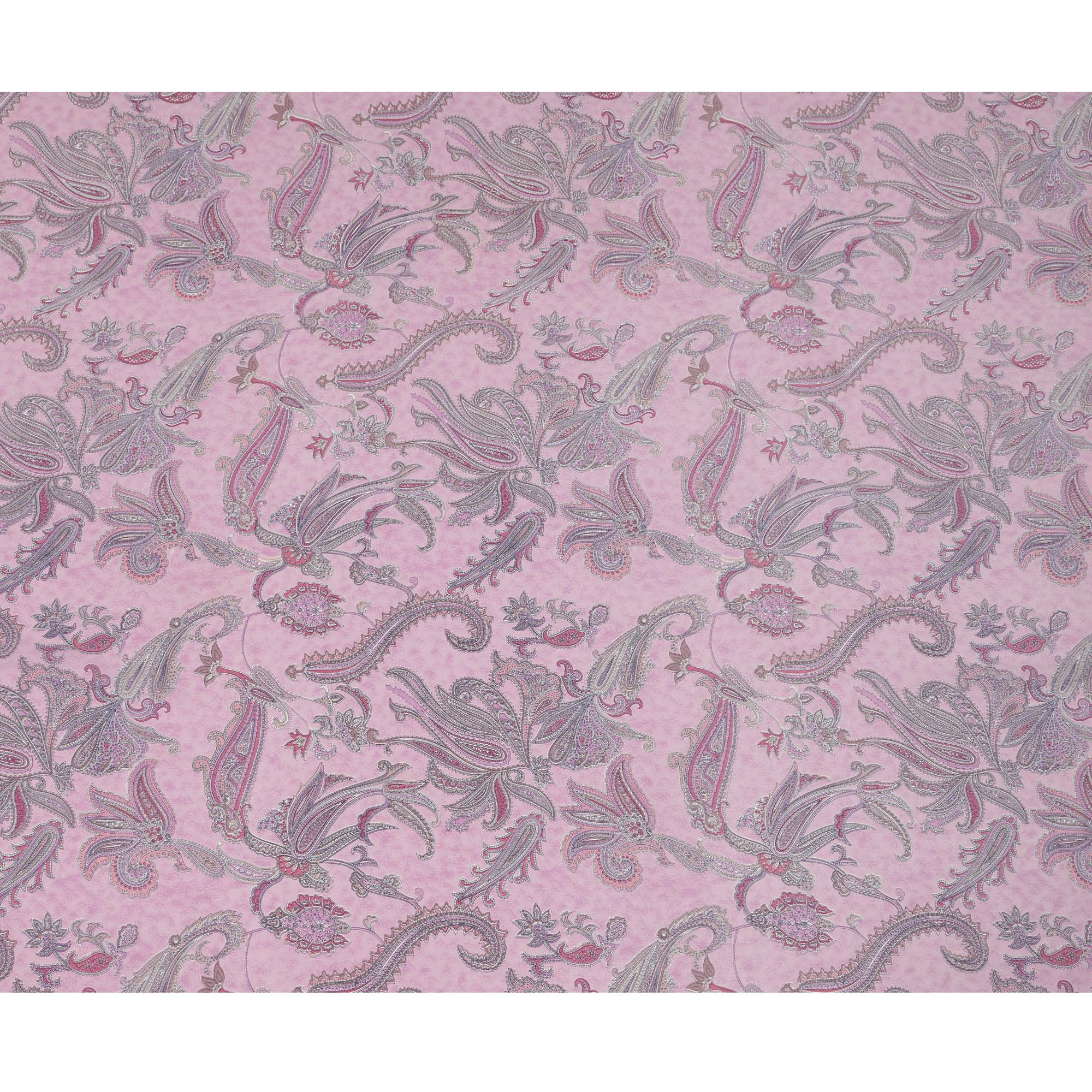 Baby pink base paired with paisley floral motifs in magenta, lilac, and silver tones.