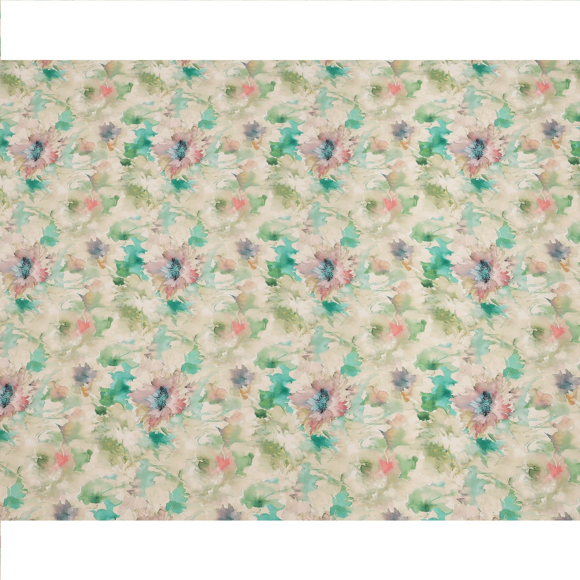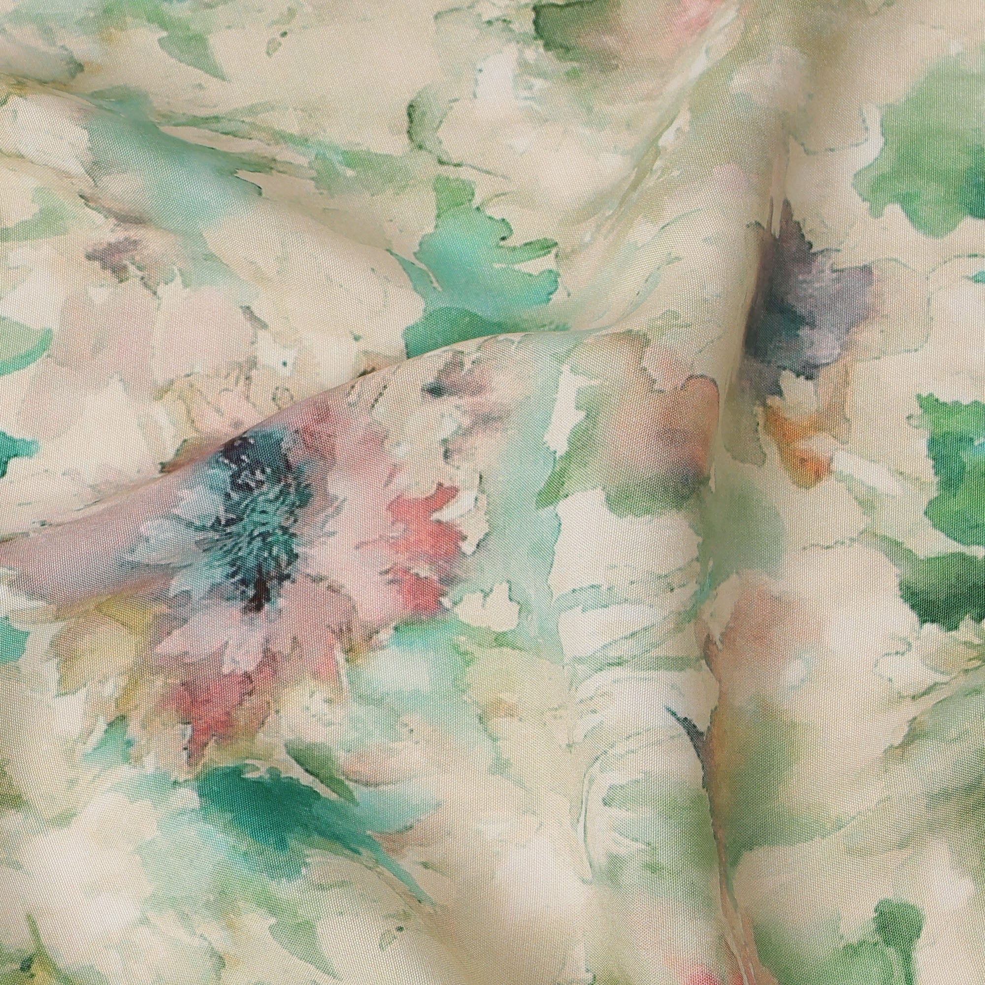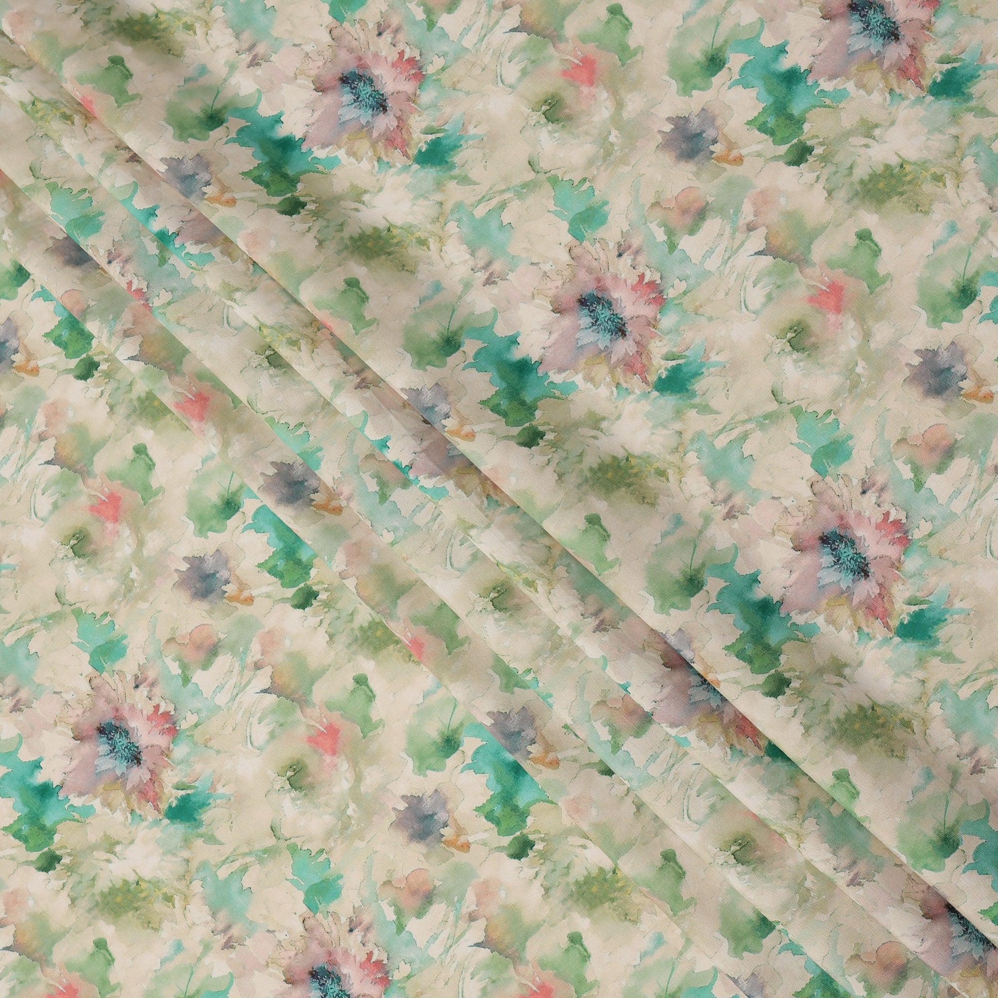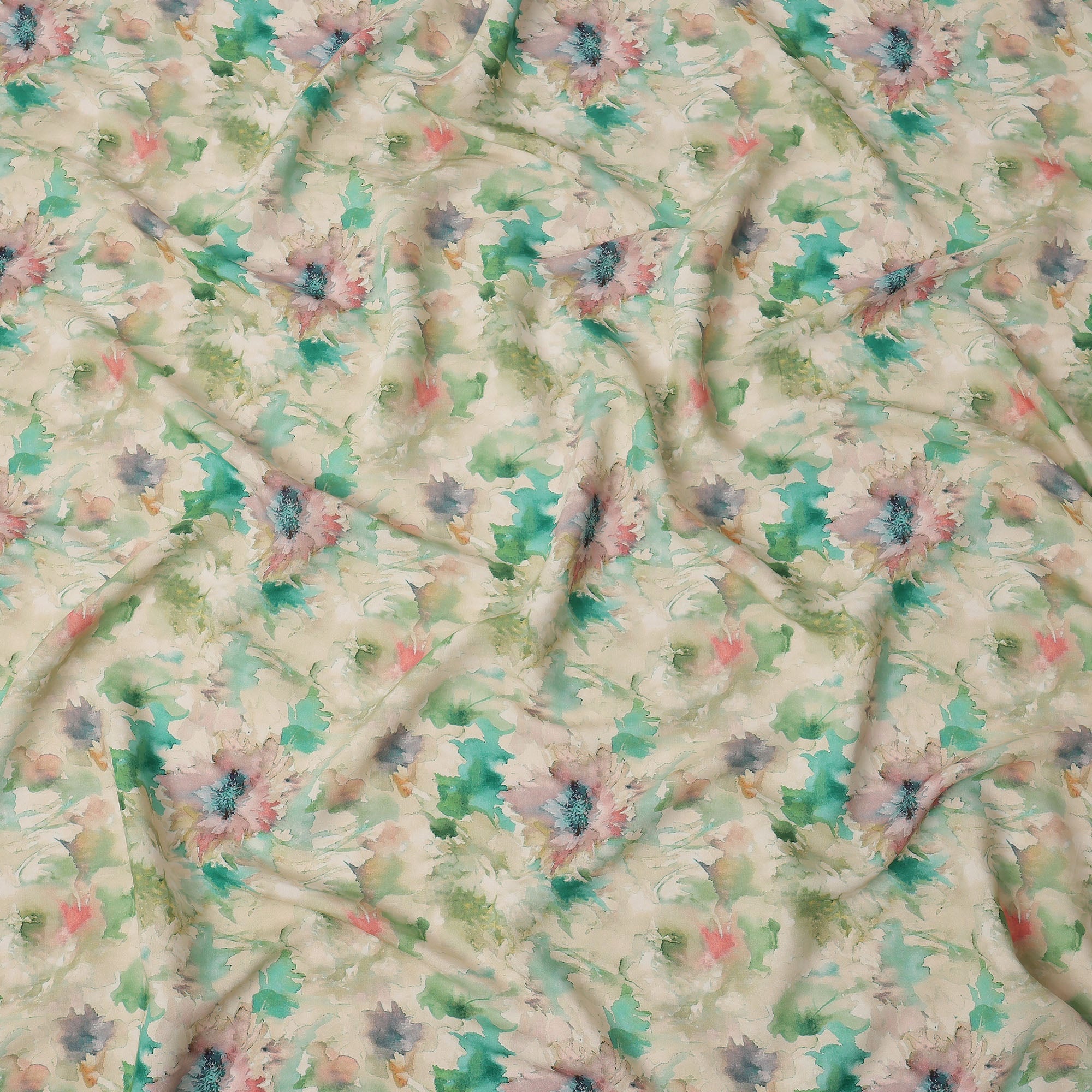 Beige and Aqua Watercolor Floral Printed Viscose Crepe Fabric, 110 Cms Width, Made in India-D26246