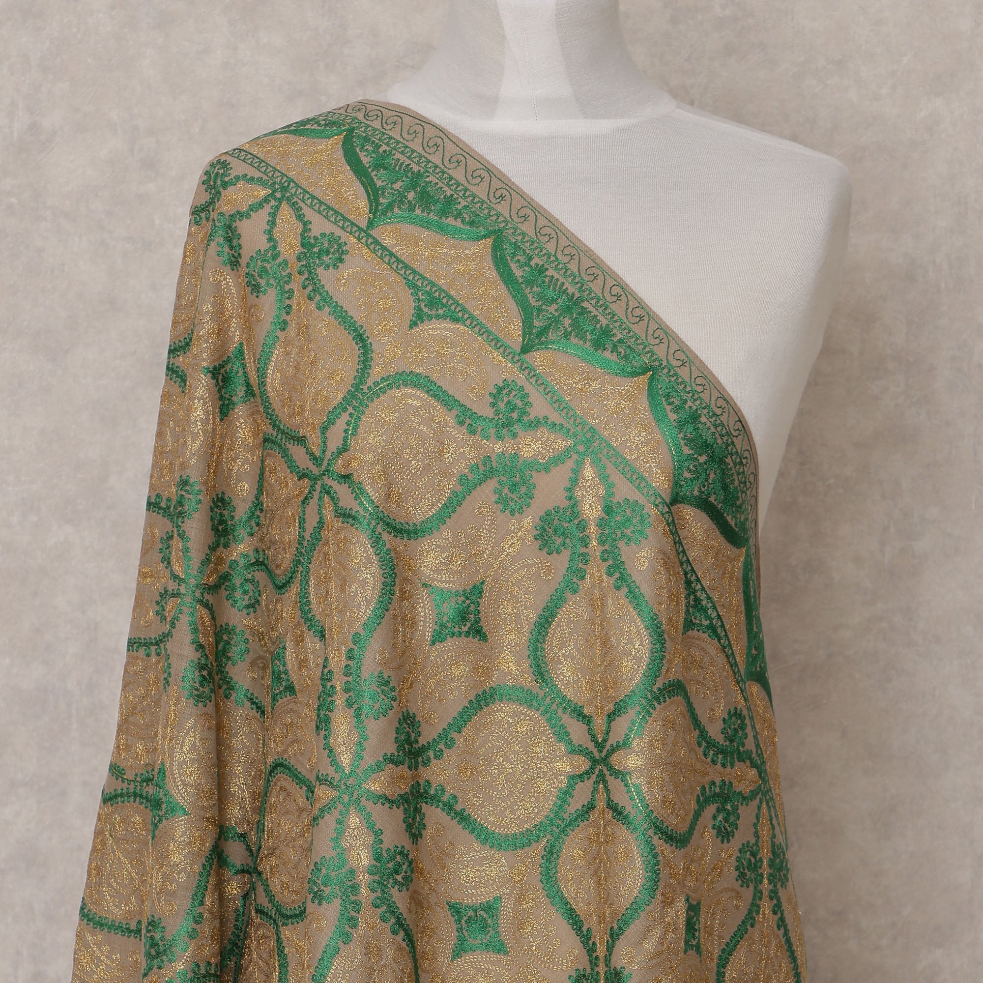 Beige Kashmiri pashmina shawl adorned with bold green geometric motifs