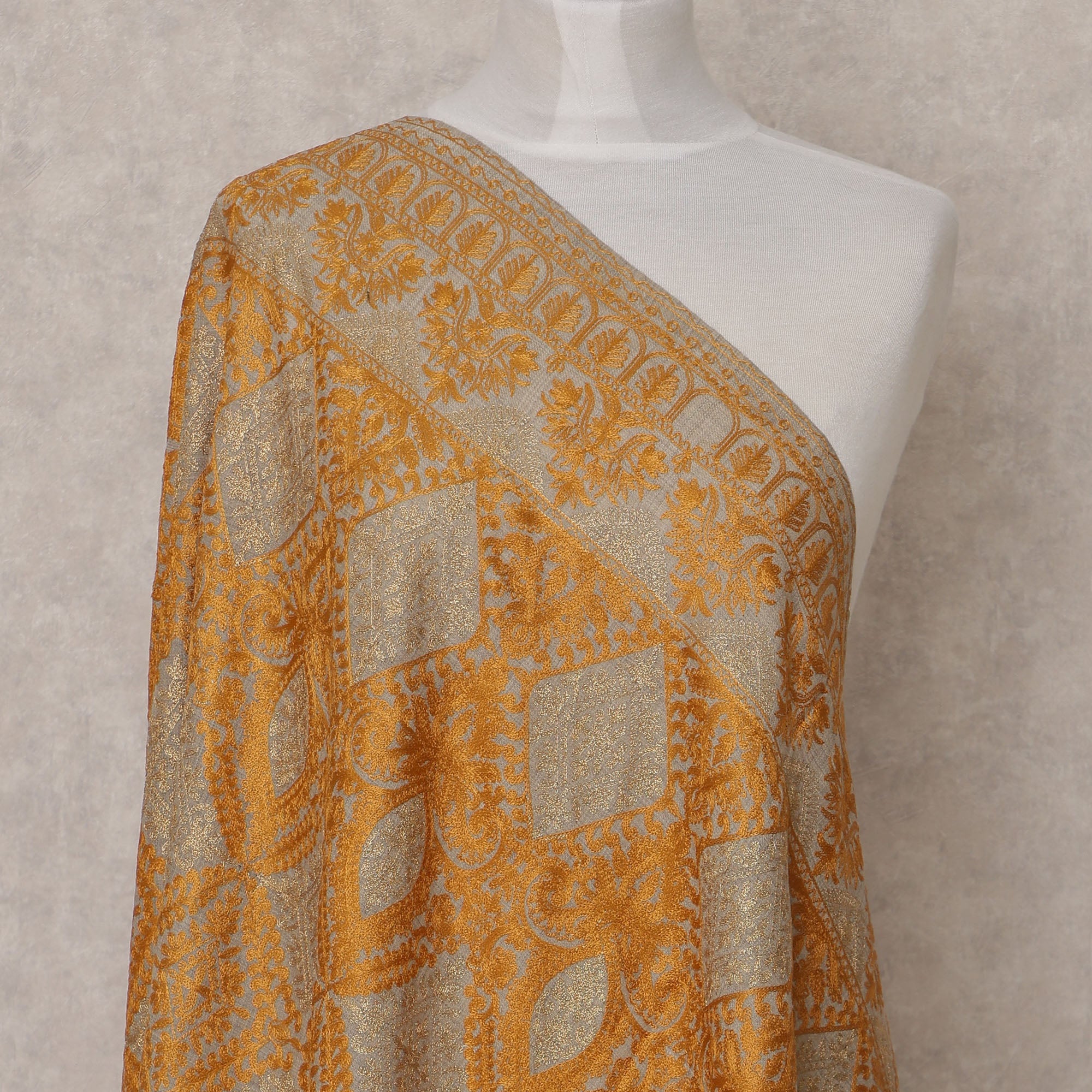 This beige and mustard geometric motif premium Kashmiri pashmina shawl is a fine example of timeless artistry blended with luxurious comfort. The beige base serves as a subtle canvas for the intricate mustard geometric motifs, creating a striking yet elegant appeal. Crafted from premium quality pashmina, this shawl is exceptionally soft, lightweight, and warm, making it perfect for every season. Its generous size of 210X100 cms allows versatile draping styles, whether you want to wear it over a saree, lehenga, or modern attire. Each piece reflects Kashmiri heritage through detailed weaving patterns that elevate its traditional charm while keeping it suitable for contemporary fashion. A true heirloom, this handcrafted shawl from India brings a touch of sophistication and cultural richness to your wardrobe, ensuring both elegance and comfort.