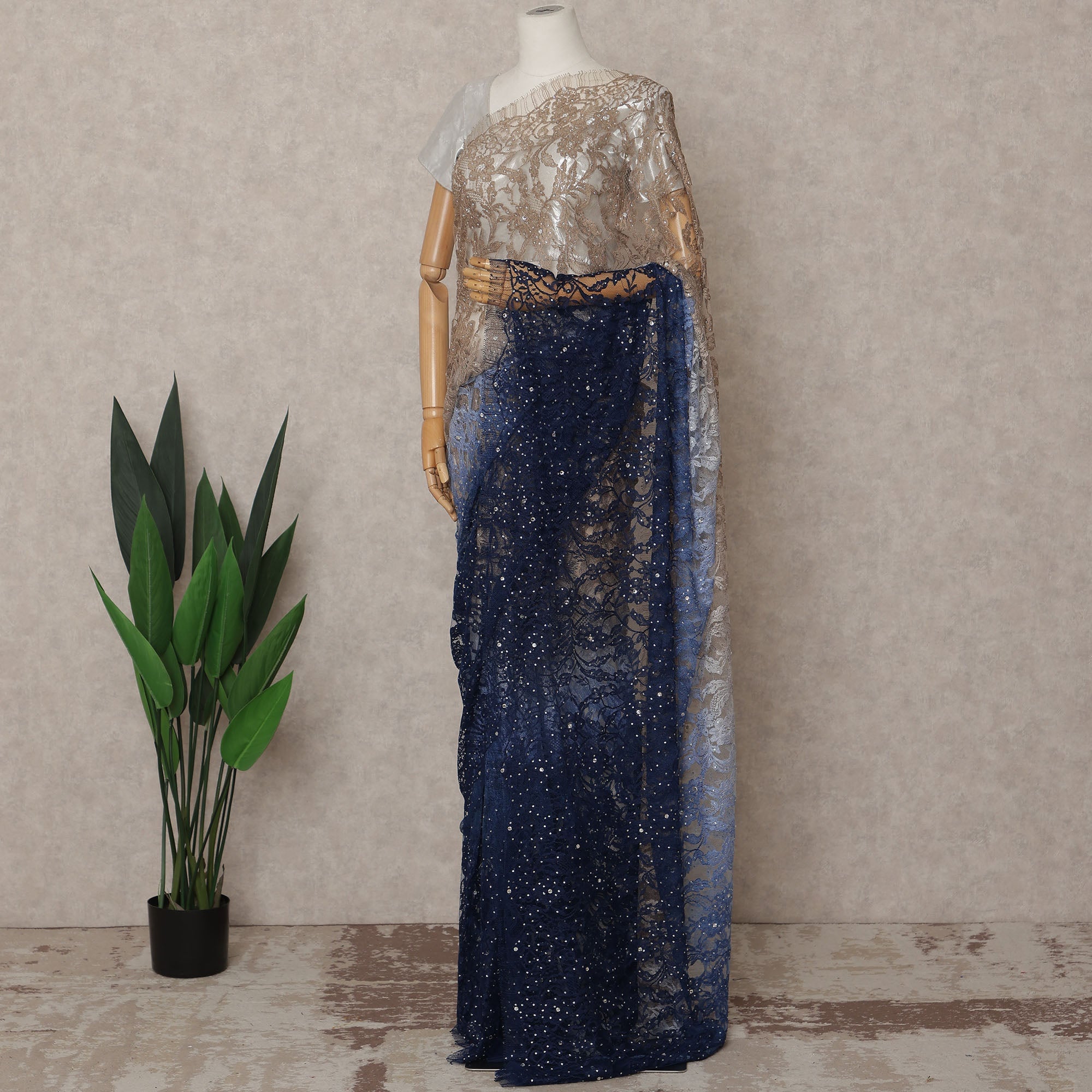 Beige and Navy Blue Premium French Ombre Chantilly Lace Saree with Stone Work – 5.5 Meters Length, 110 Cms Width, Crafted in France-D26111