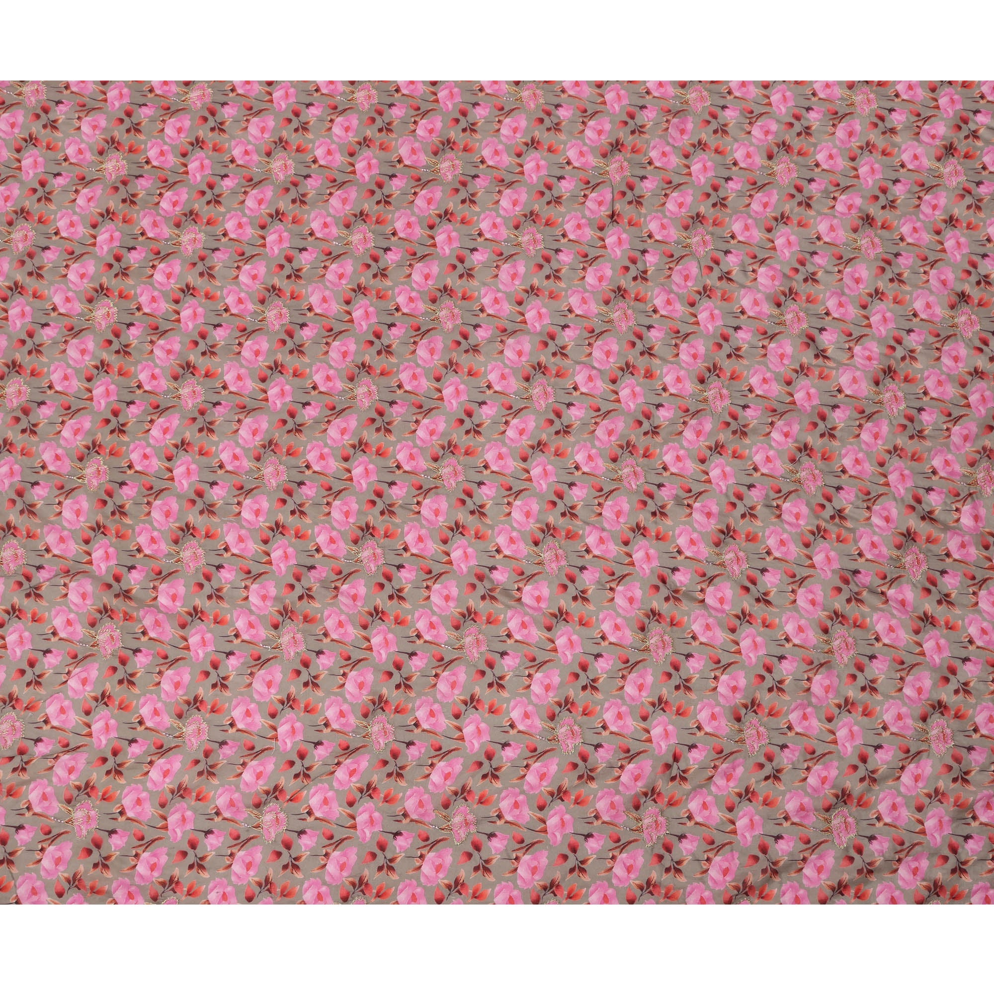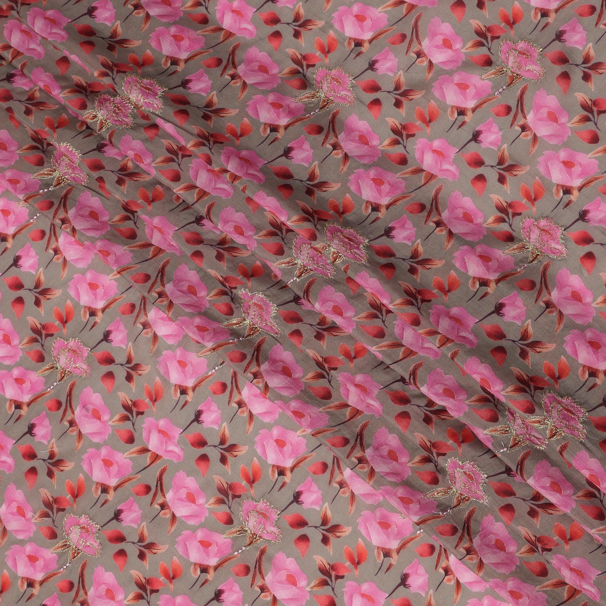 This beige cotton lawn fabric is digitally printed with vibrant pink rose motifs accented by warm red and coral leaves,... Read more Read more