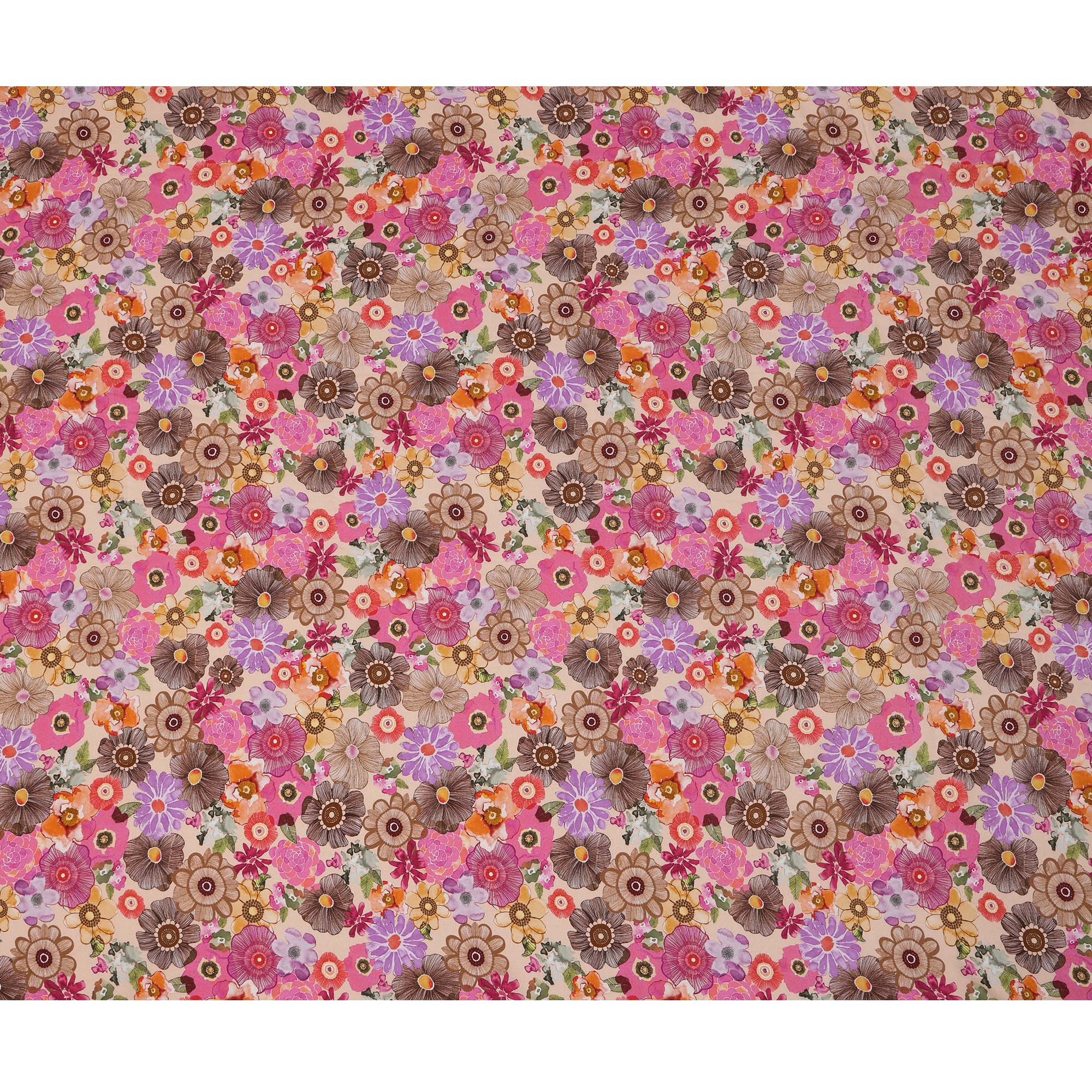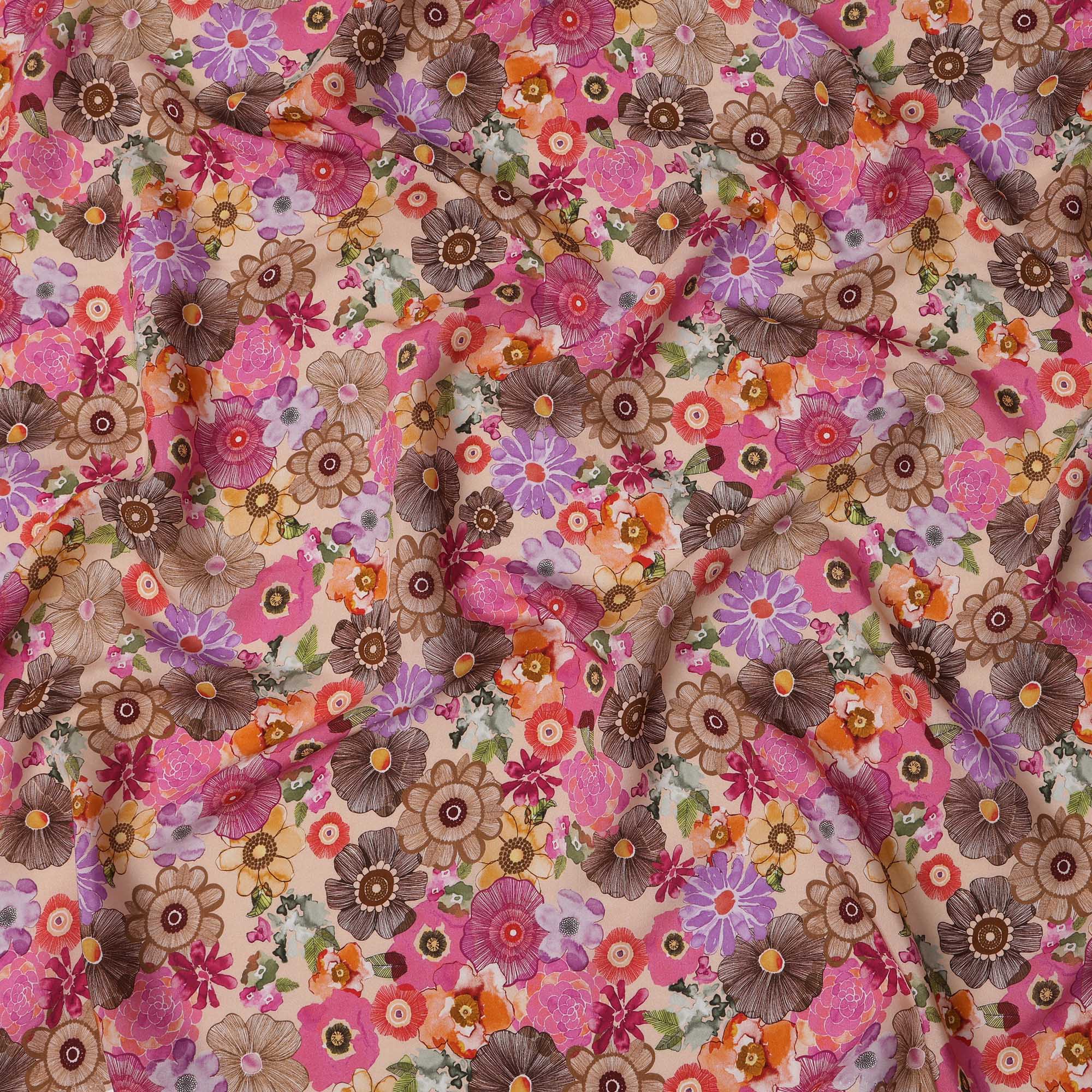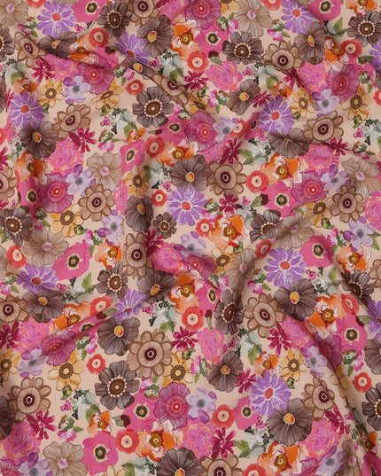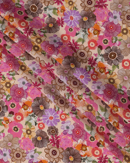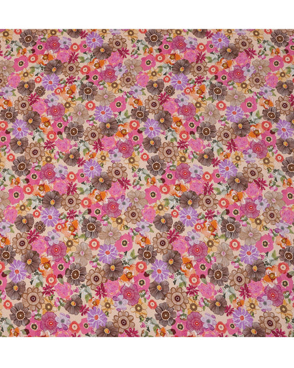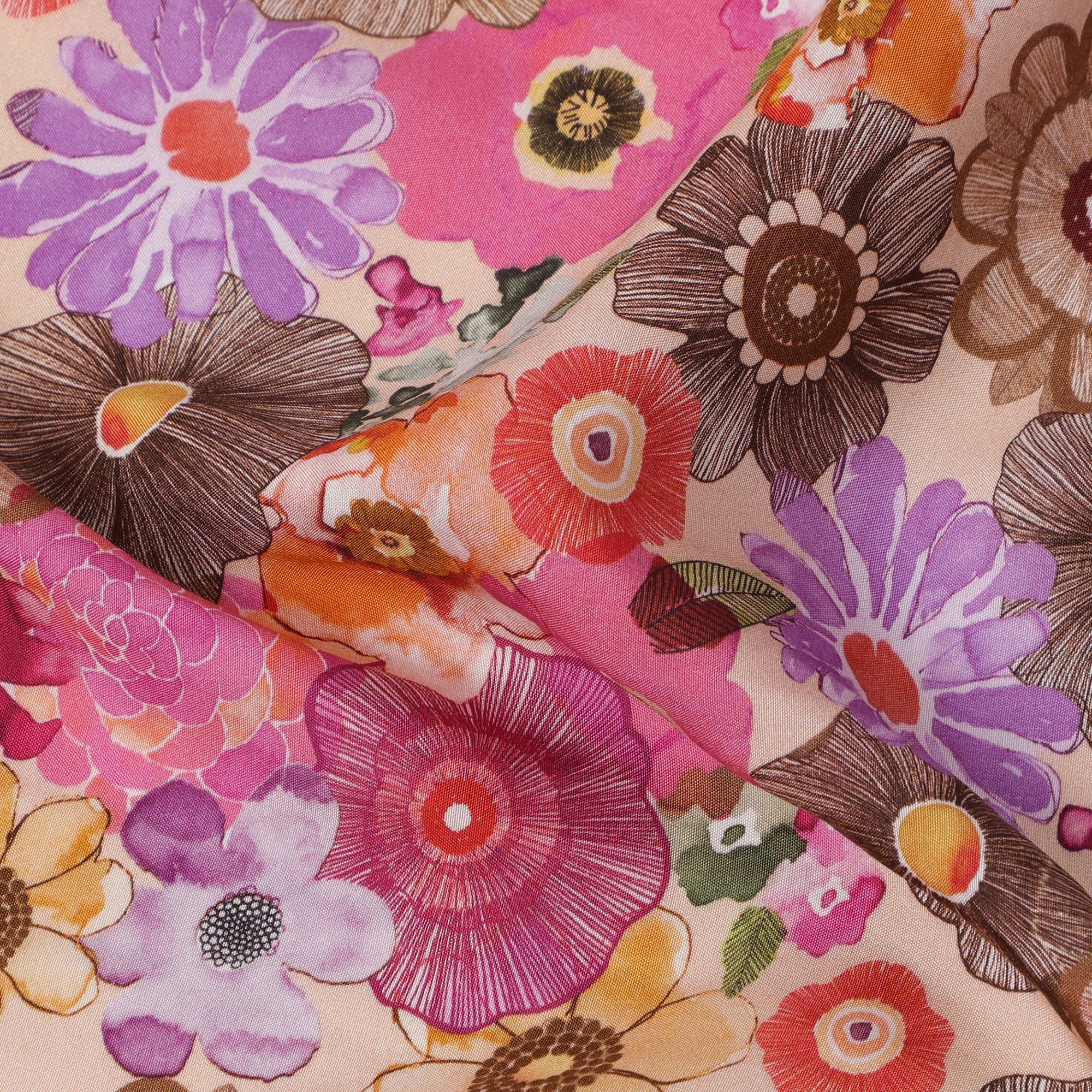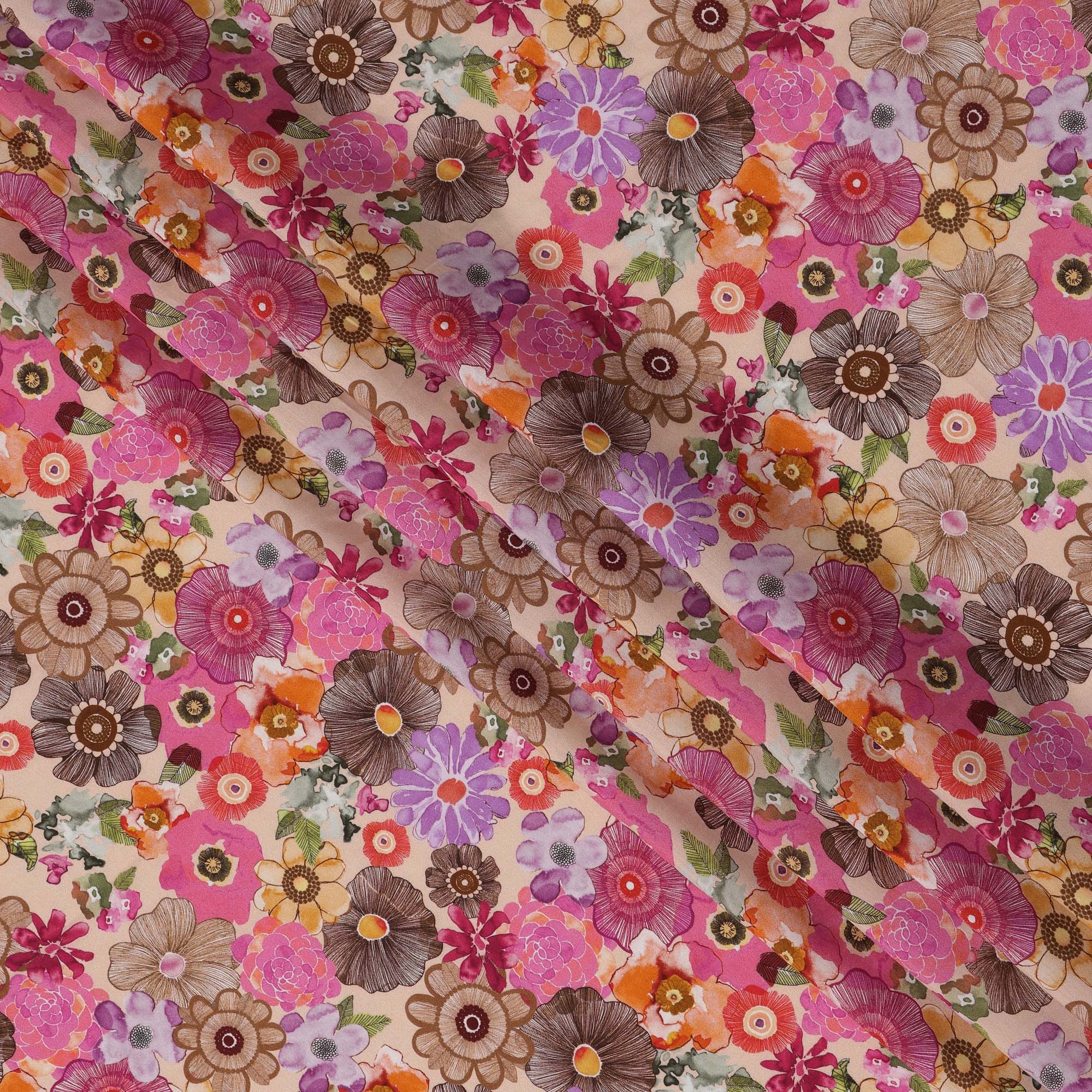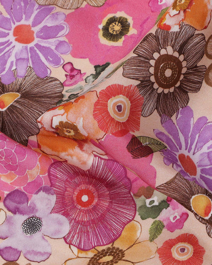 Beige viscose crepe fabric featuring bold floral print in pink, orange, brown, and purple