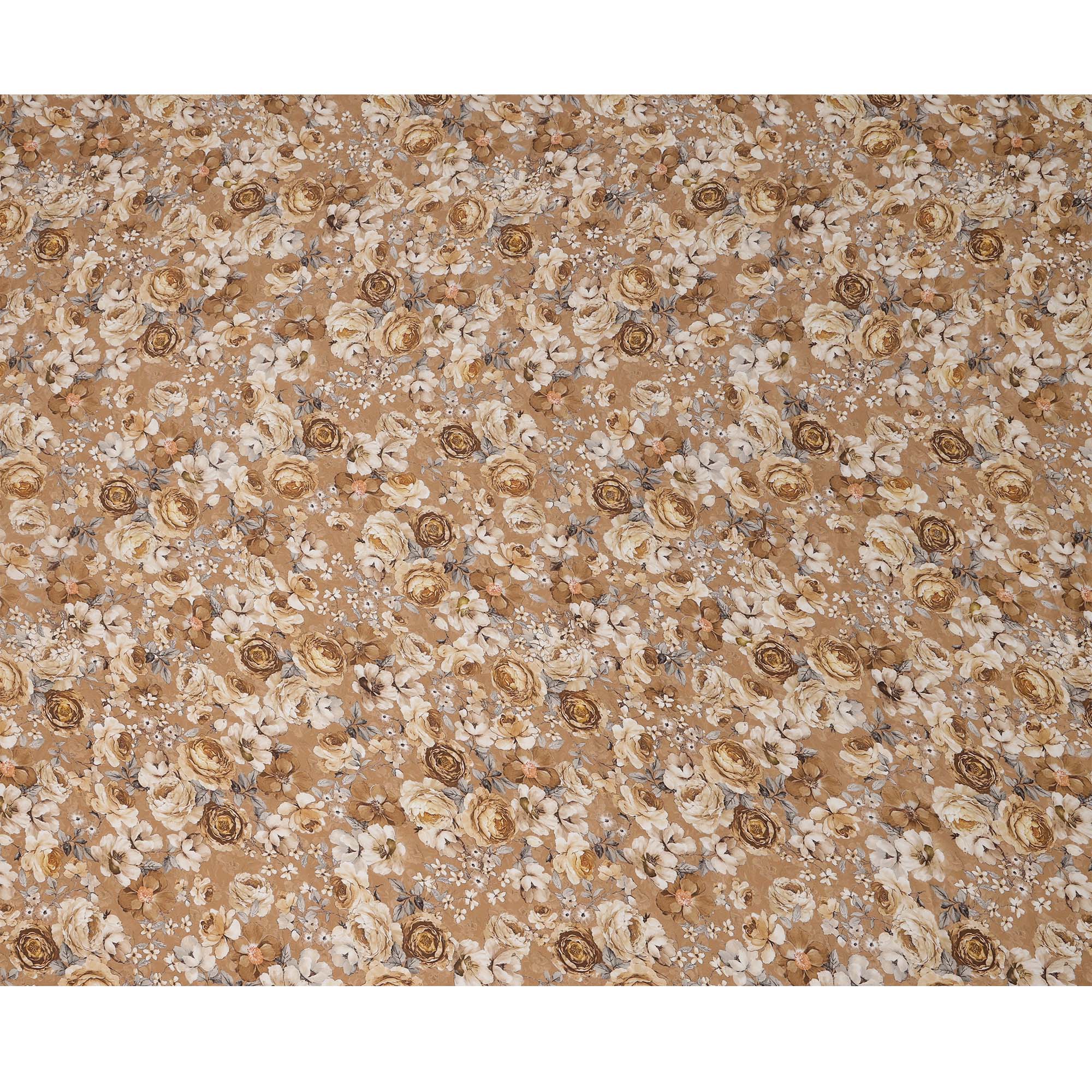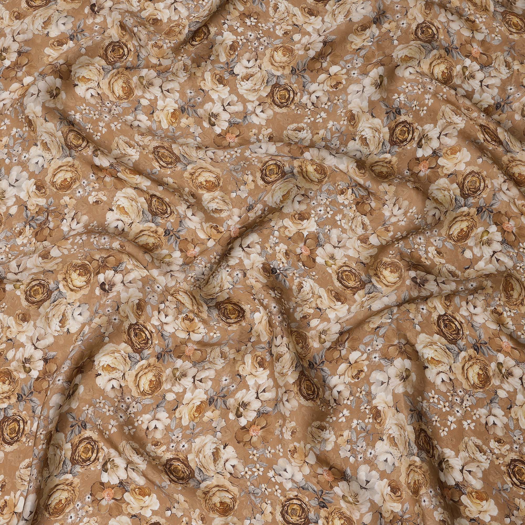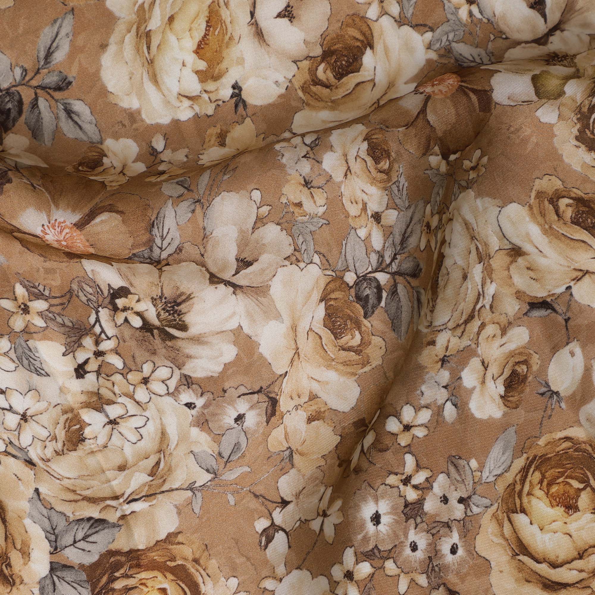 Beige Brown Vintage Floral Printed Synthetic Modal Satin Fabric with Antique Bloom Pattern, 110 Cms Width, Made in India-D23124