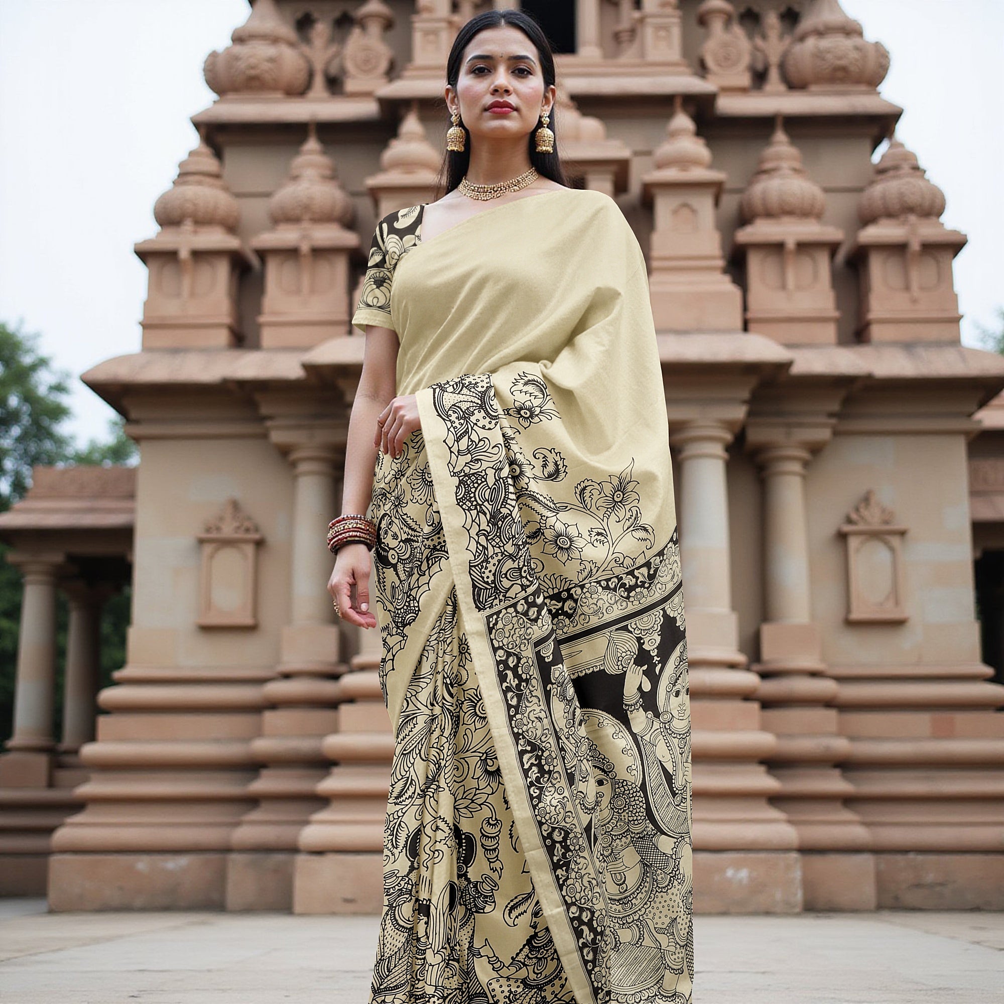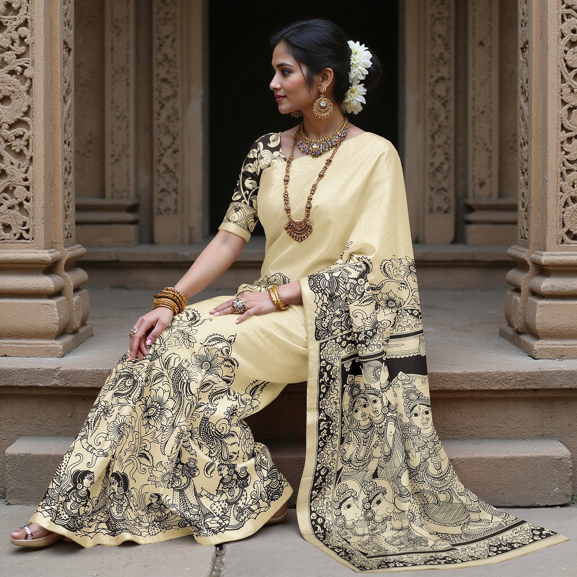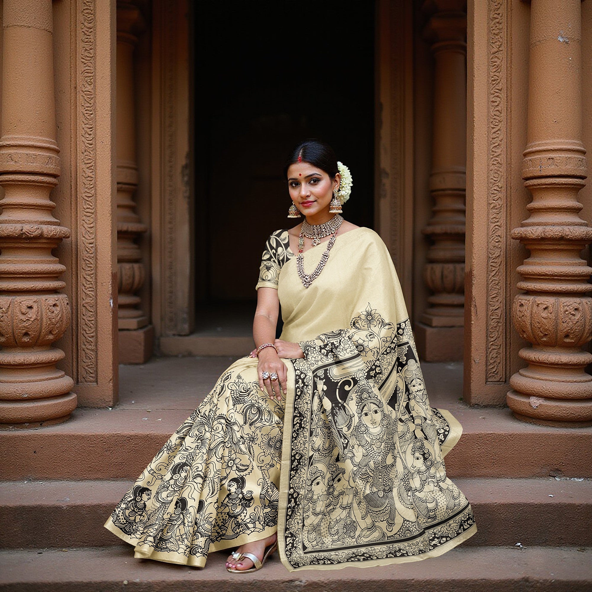 A canvas of devotion and storytelling, this Pen Kalamkari saree in beige Chennori silk is handpainted with scenes from Indian... Read more Read more