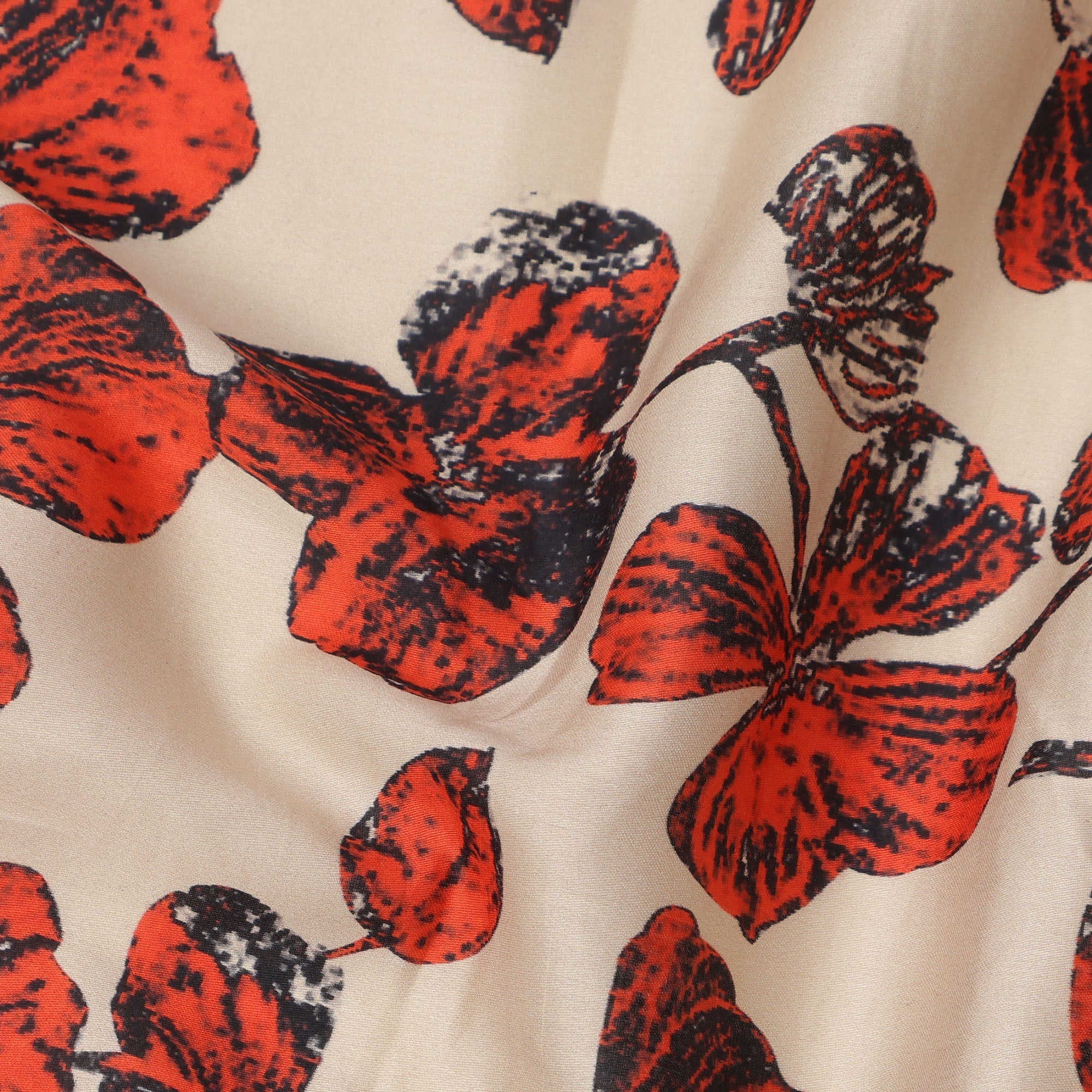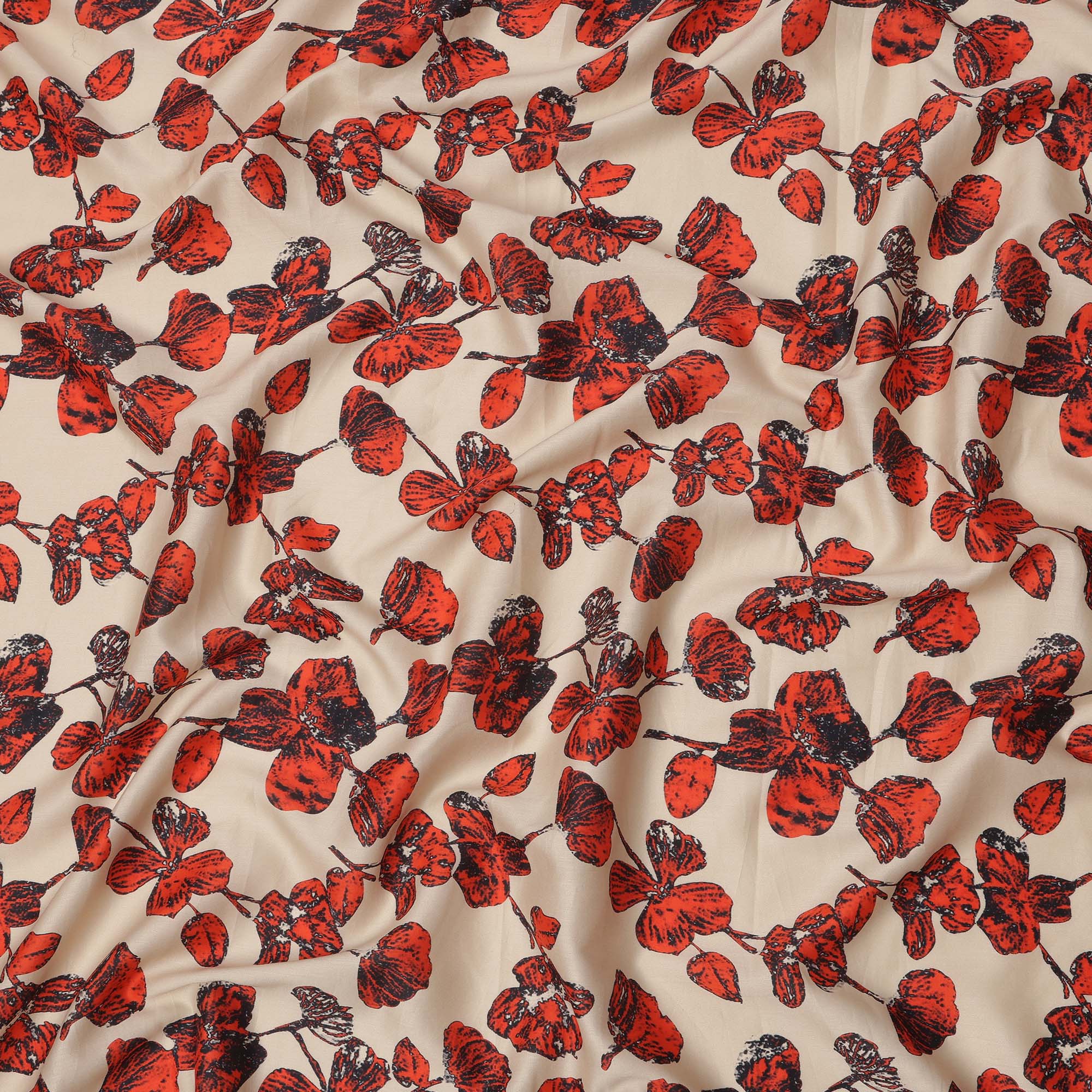 Beige base enhanced with vibrant red and black floral sketch-style prints