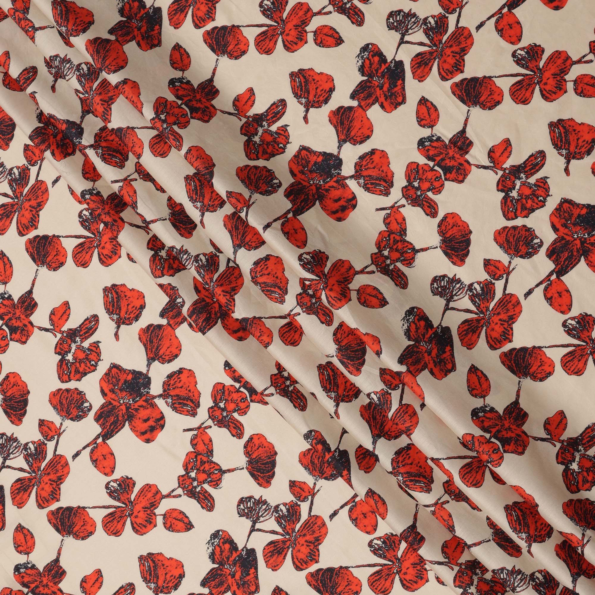Beige Cotton Lawn Fabric with Red and Black Floral Sketch Print, Width 110 Cms, Made in India-D23942