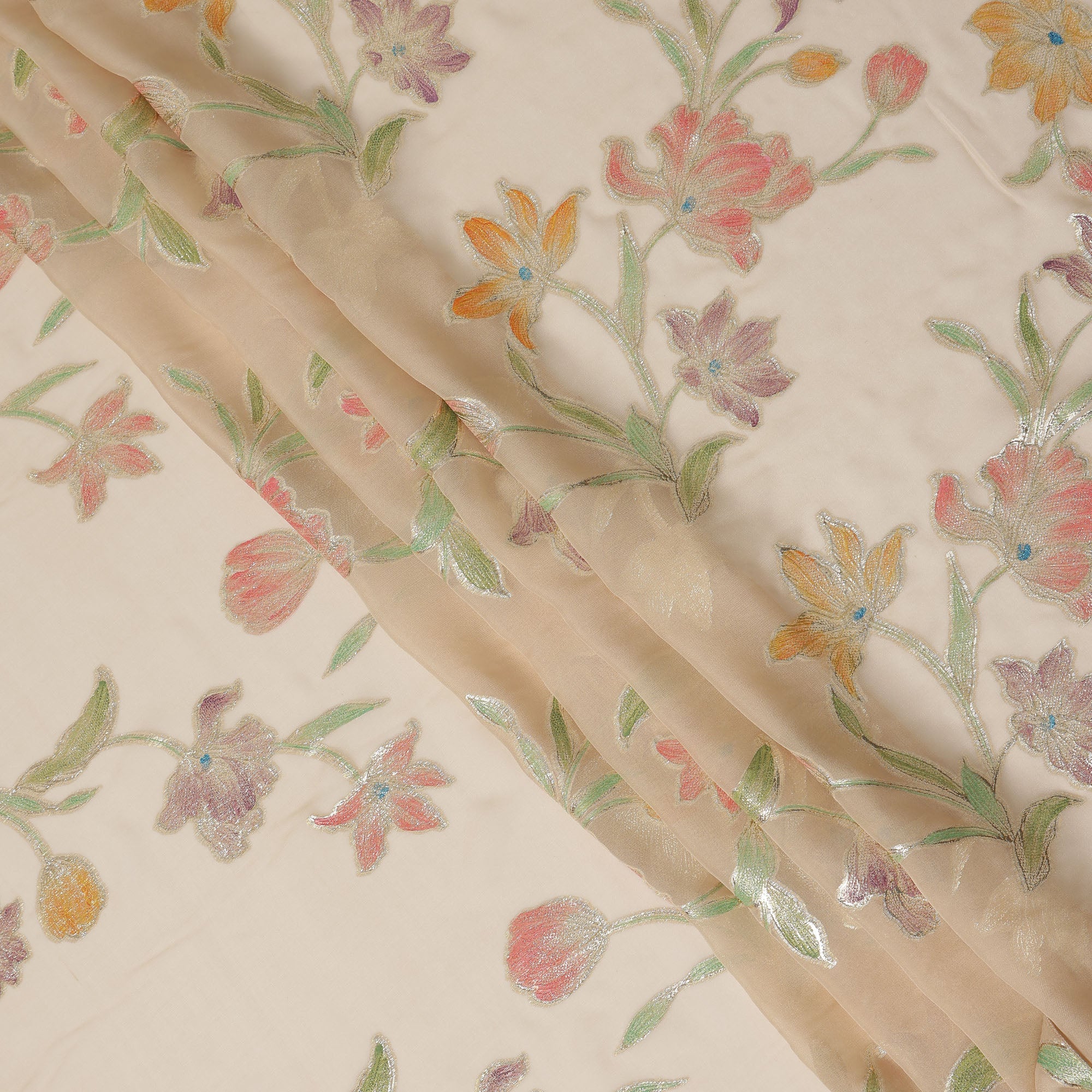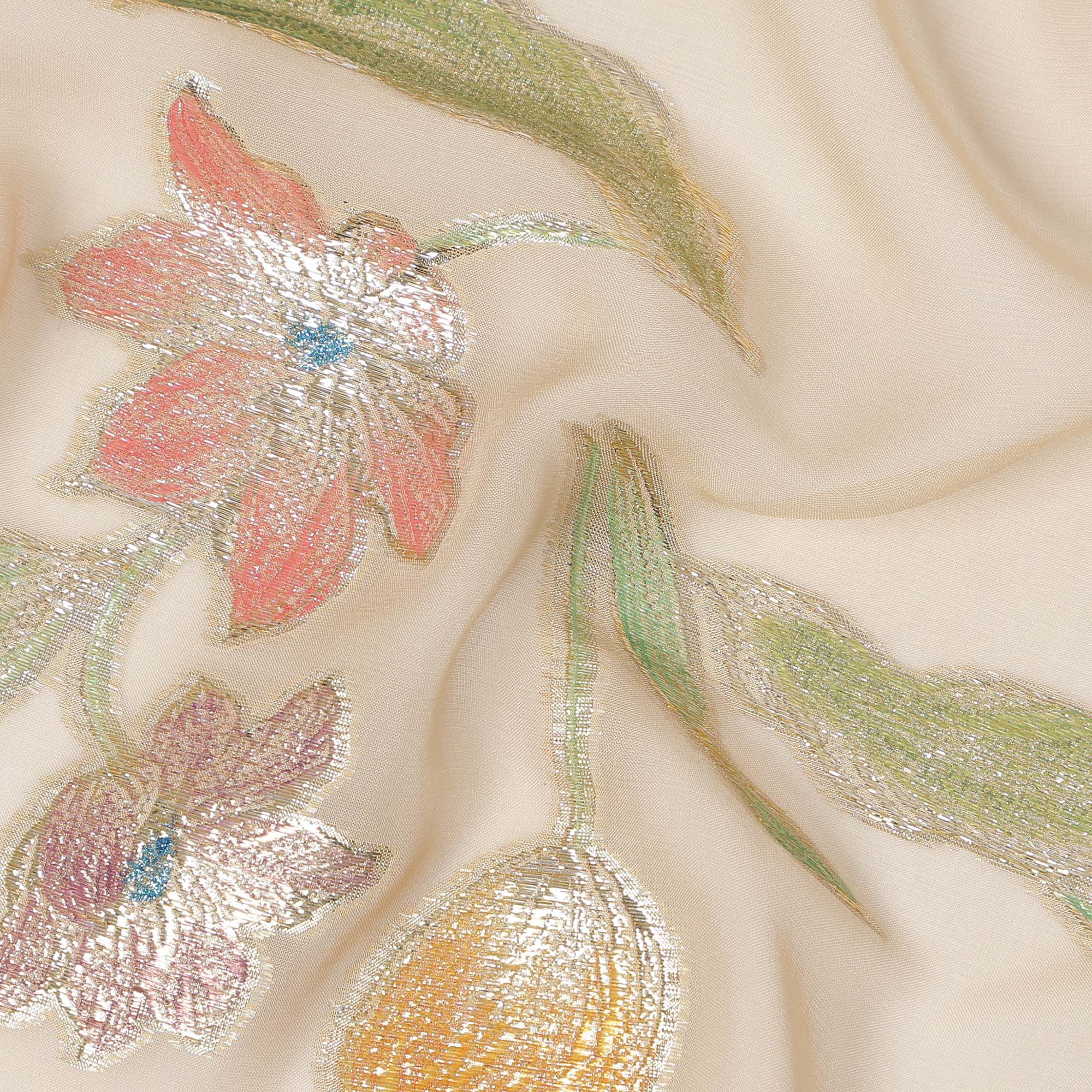 Beige Floral Embroidered Metallic Lurex Design Premium Silk Chiffon Fabric, 110 Cms Width, Made in South Korea-D25757