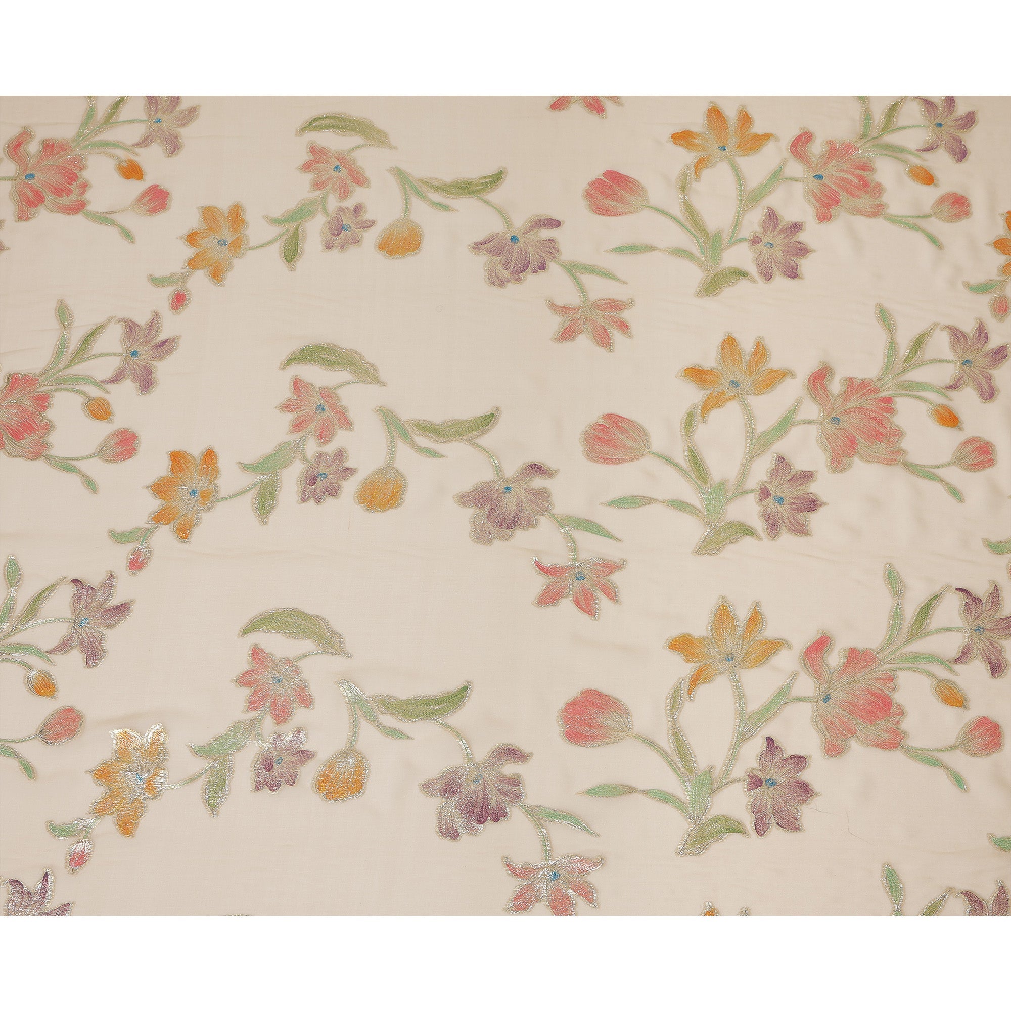 Unveil understated elegance with this Beige Premium Silk Chiffon fabric, exquisitely adorned with floral embroidery and metallic lurex highlights that add a soft, radiant glow. Expertly crafted in South Korea, this fabric reflects timeless sophistication through its delicate color palette and intricate craftsmanship. The serene beige base enhances the beauty of embroidered florals in pastel hues of peach, lavender, yellow, and mint green, intricately detailed with shimmering metallic threads that exude grace and refinement. Lightweight, airy, and luxuriously smooth, this chiffon drapes beautifully, making it perfect for sarees, gowns, dupattas, and designer couture creations. Its ethereal charm, combined with superior Korean weaving, makes it ideal for festive, bridal, and evening wear. Designed to embody both comfort and class, this fabric offers a flawless fusion of modern artistry and traditional appeal. Dry clean only to maintain its luminous sheen and embroidery perfection. Shop online now to experience true Korean silk luxury.