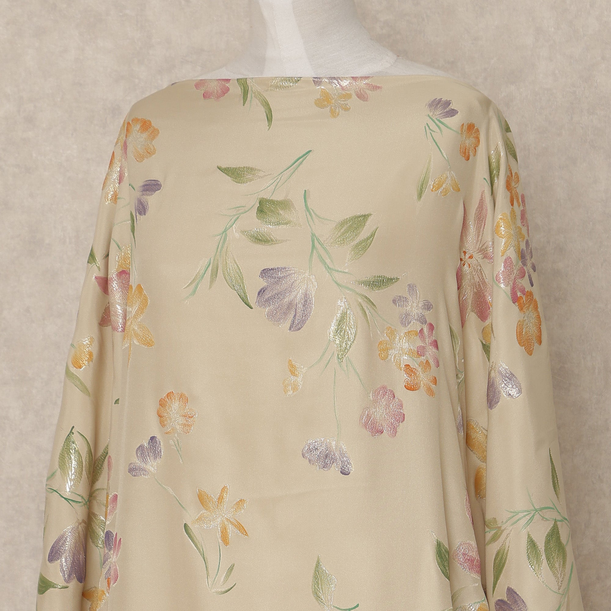 This premium pure silk satin fabric with metallic in an elegant beige base with delicate multicolor floral prints offers a... Read more Read more