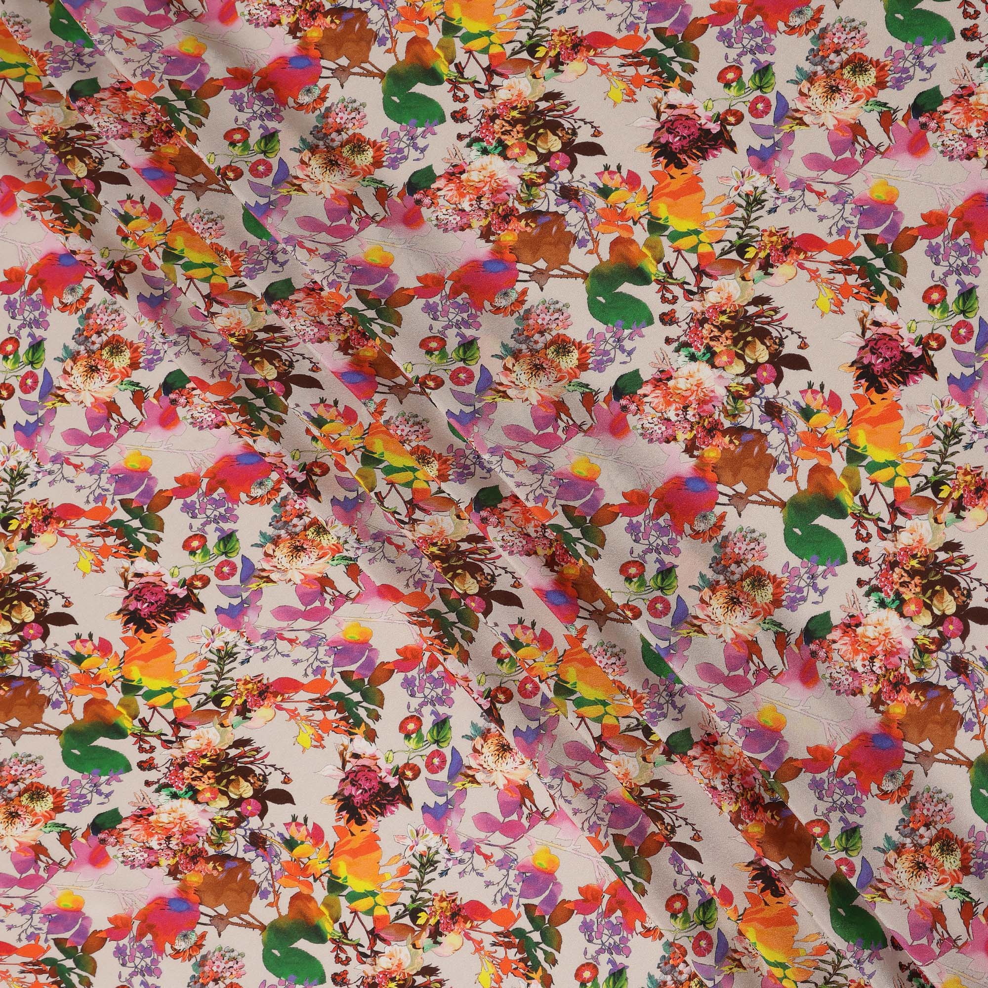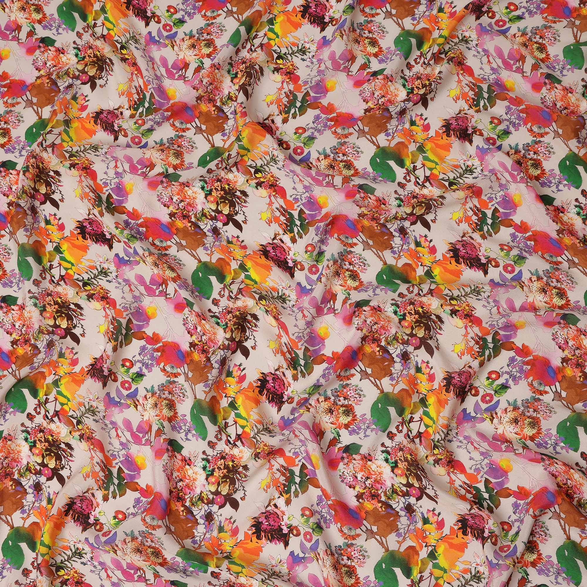 This beige floral printed silk crepe fabric showcases a vibrant botanical garden design featuring artistic blooms in shades of orange,... Read more Read more