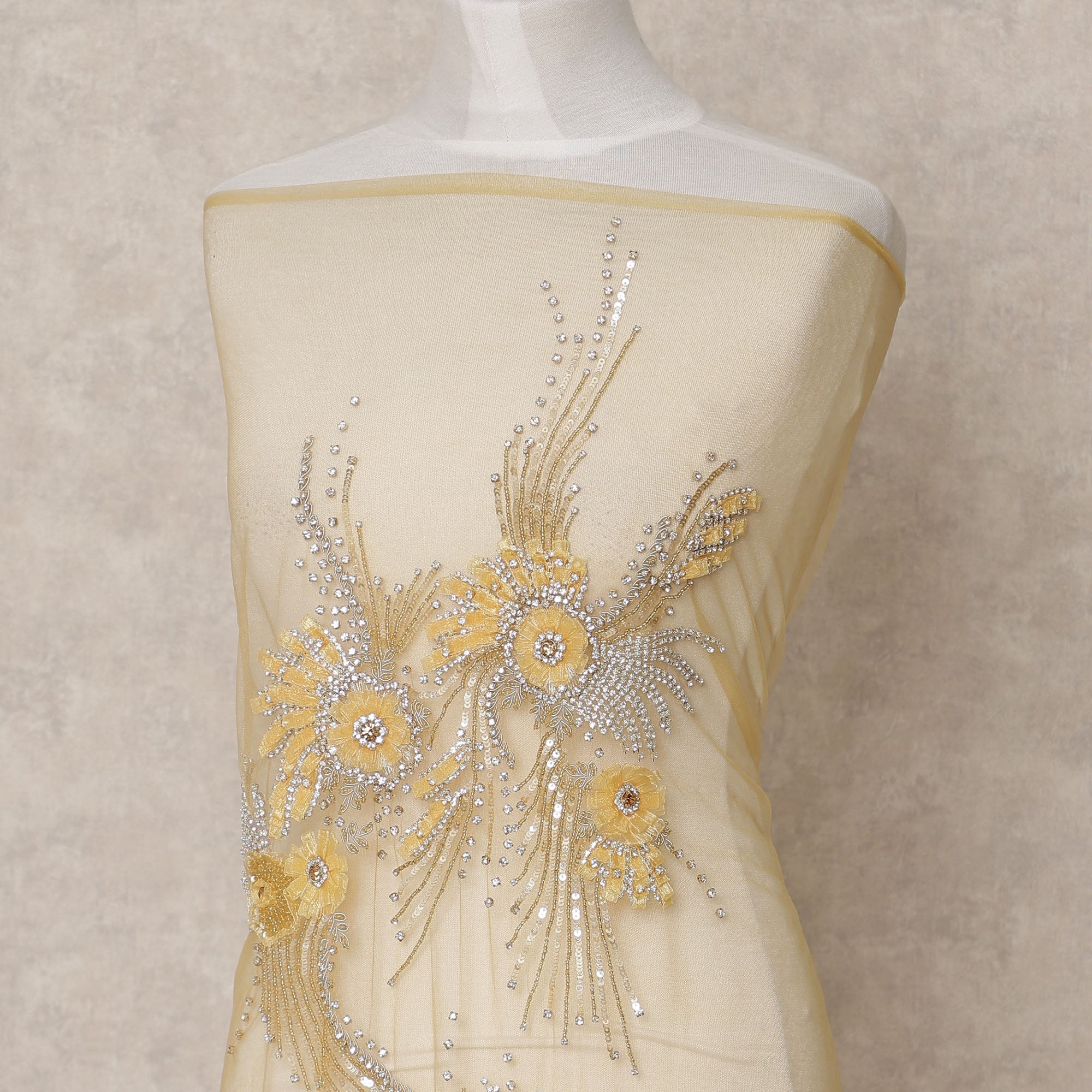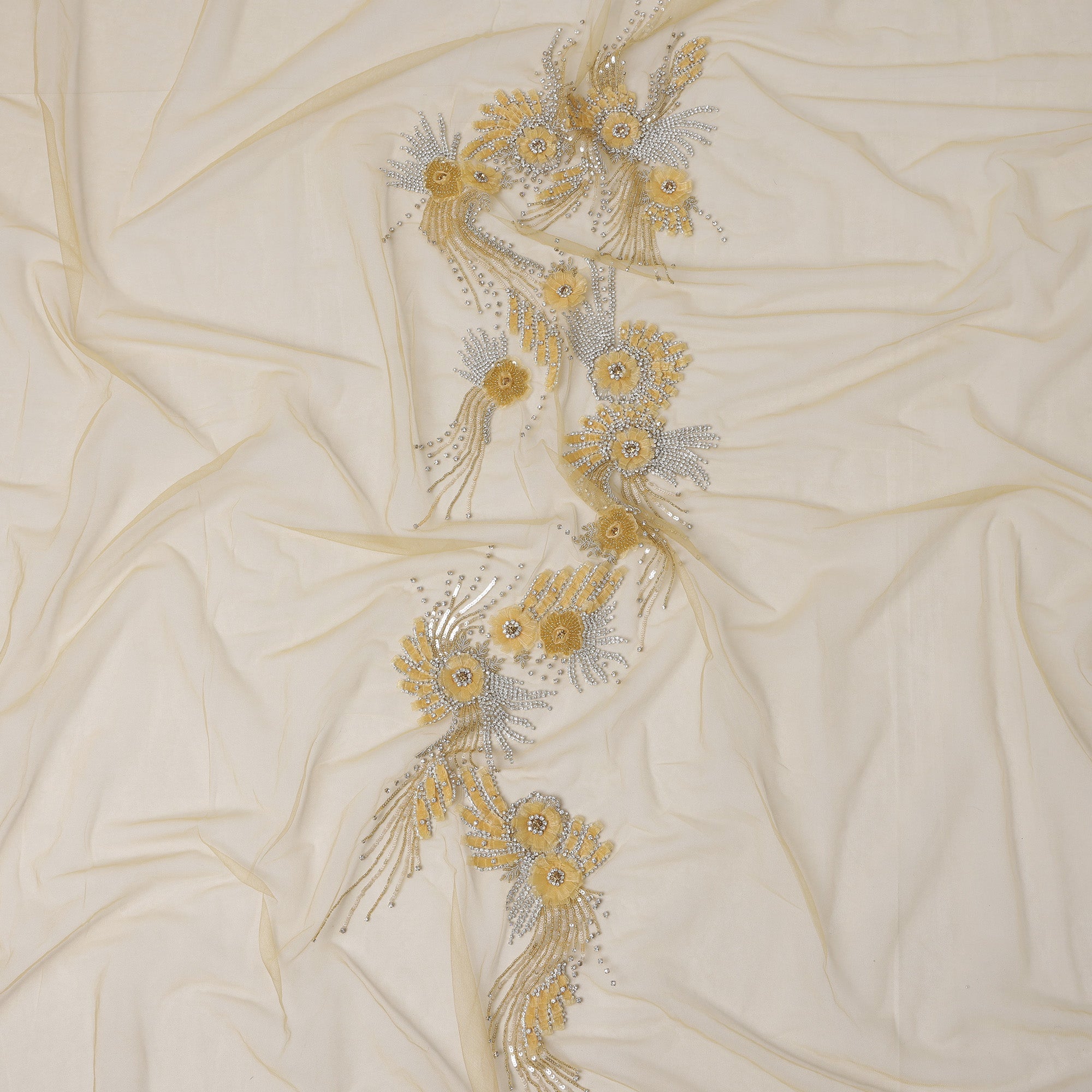 Graceful and sophisticated, this beige nylon tulle fabric showcases delicate floral embroidery with shimmering silver sequins and mustard-gold threadwork, arranged in a cascading motif ideal for elegant Fustaann dresses. The embroidery flows beautifully over the sheer tulle base, enhancing its lightweight texture while retaining strength and structure. With a width of 140 cm and offered in a 3-meter length, this fabric offers excellent coverage and design flexibility. Each sequin and stitch is meticulously placed to reflect the refined craftsmanship synonymous with Indian artisans. Perfect for formal events, bridal fashion, or high-end ethnic wear, this fabric merges subtle elegance with visual richness. Buy online and elevate your fashion creations with this premium embroidered fabric.