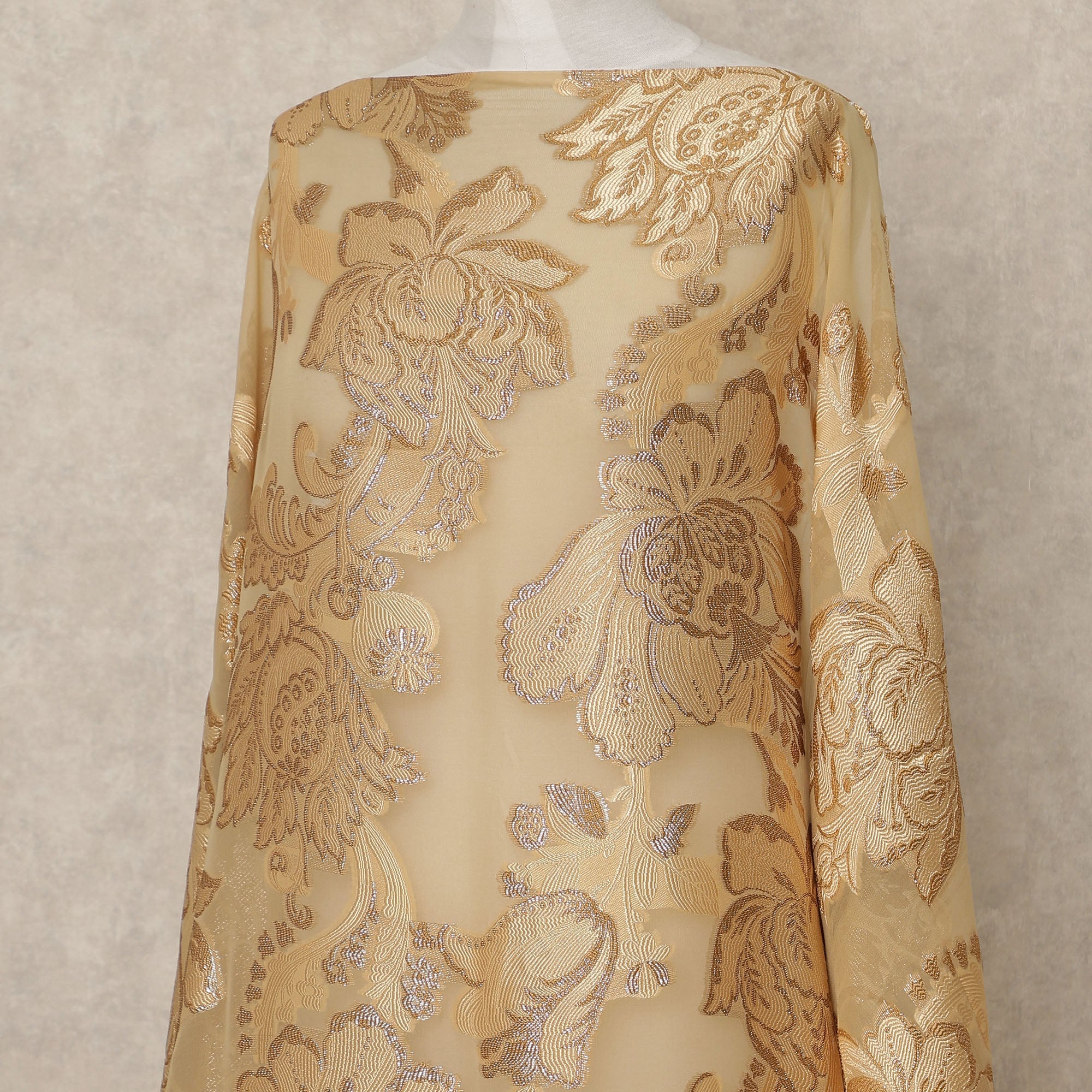 Soft beige base with intricate gold floral woven design for a luxurious finish
