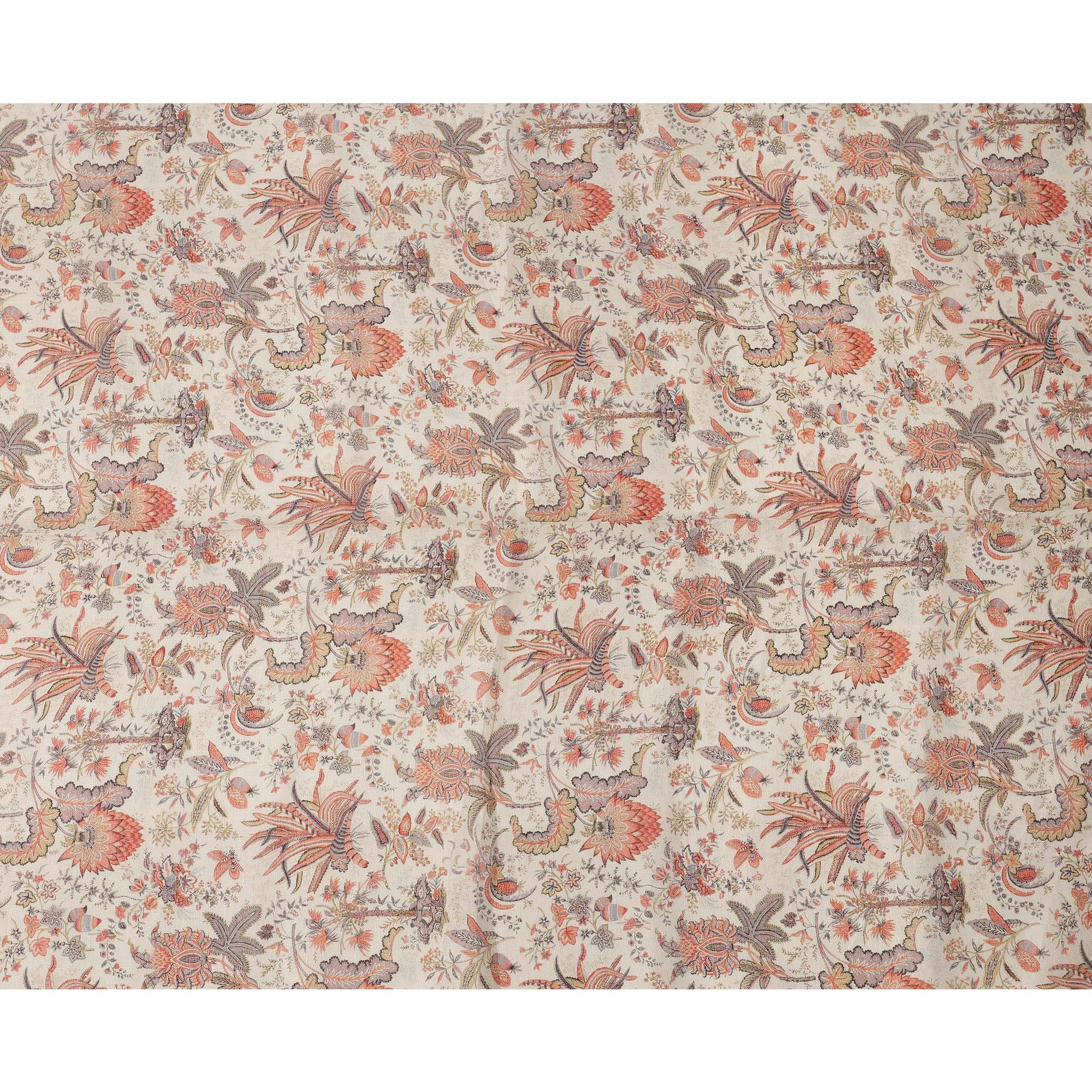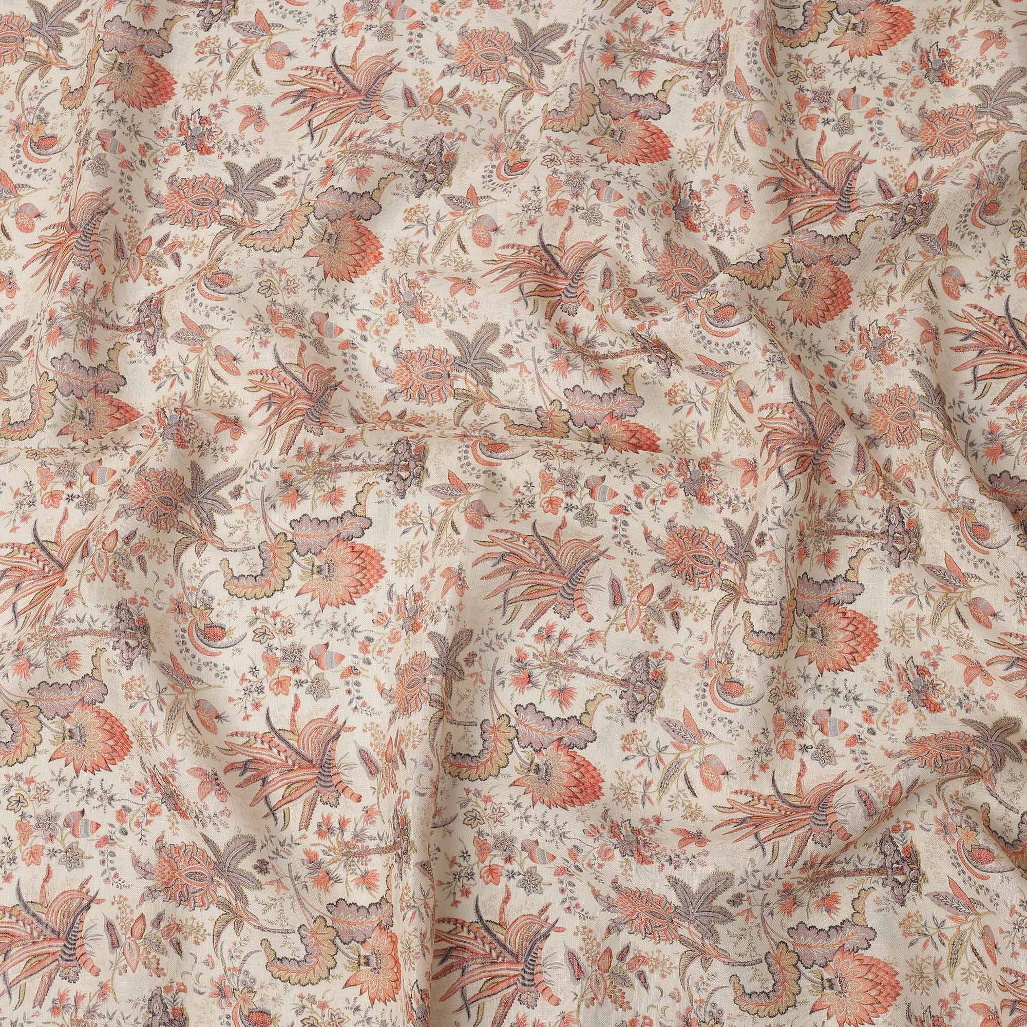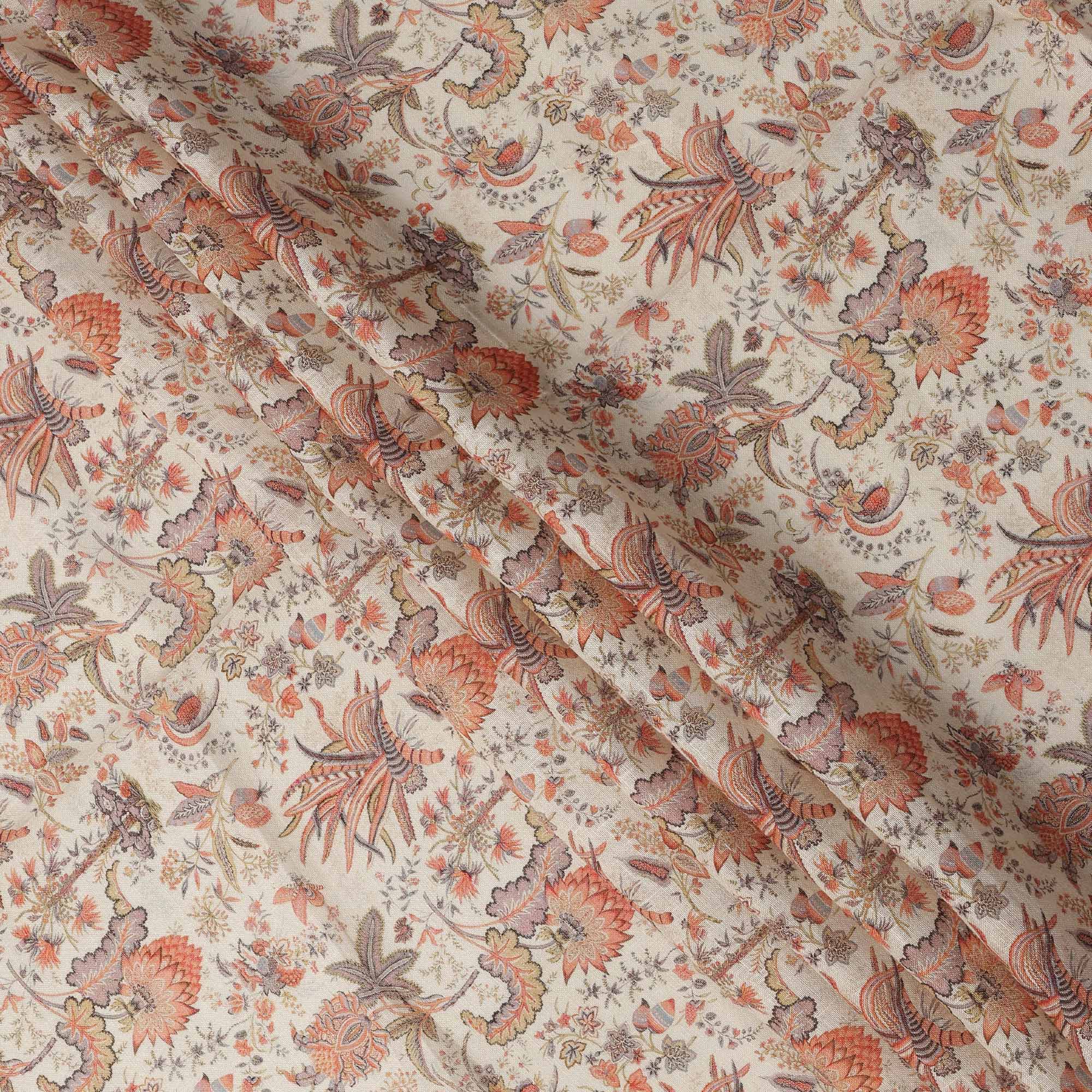 Beige Multicolor Floral Kalamkari Print Blended Linen Fabric, 110 Cms Width, Made in India-D26173