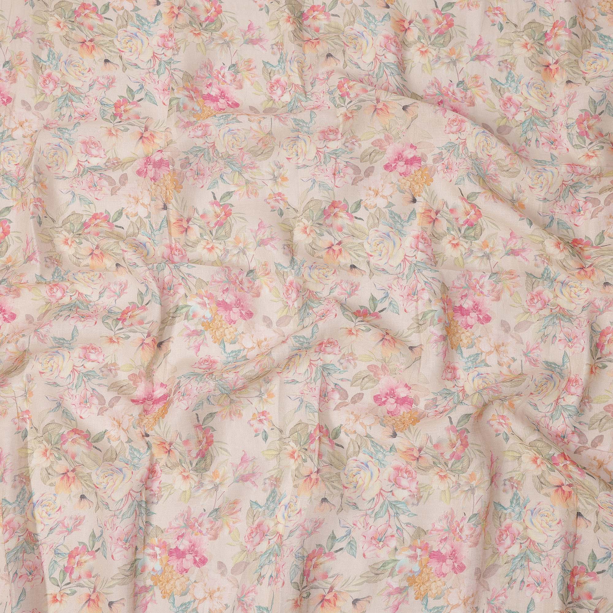 Beige Multicolor Floral Printed Blended Cotton Linen Fabric, 110 Cms Width, India-D25175