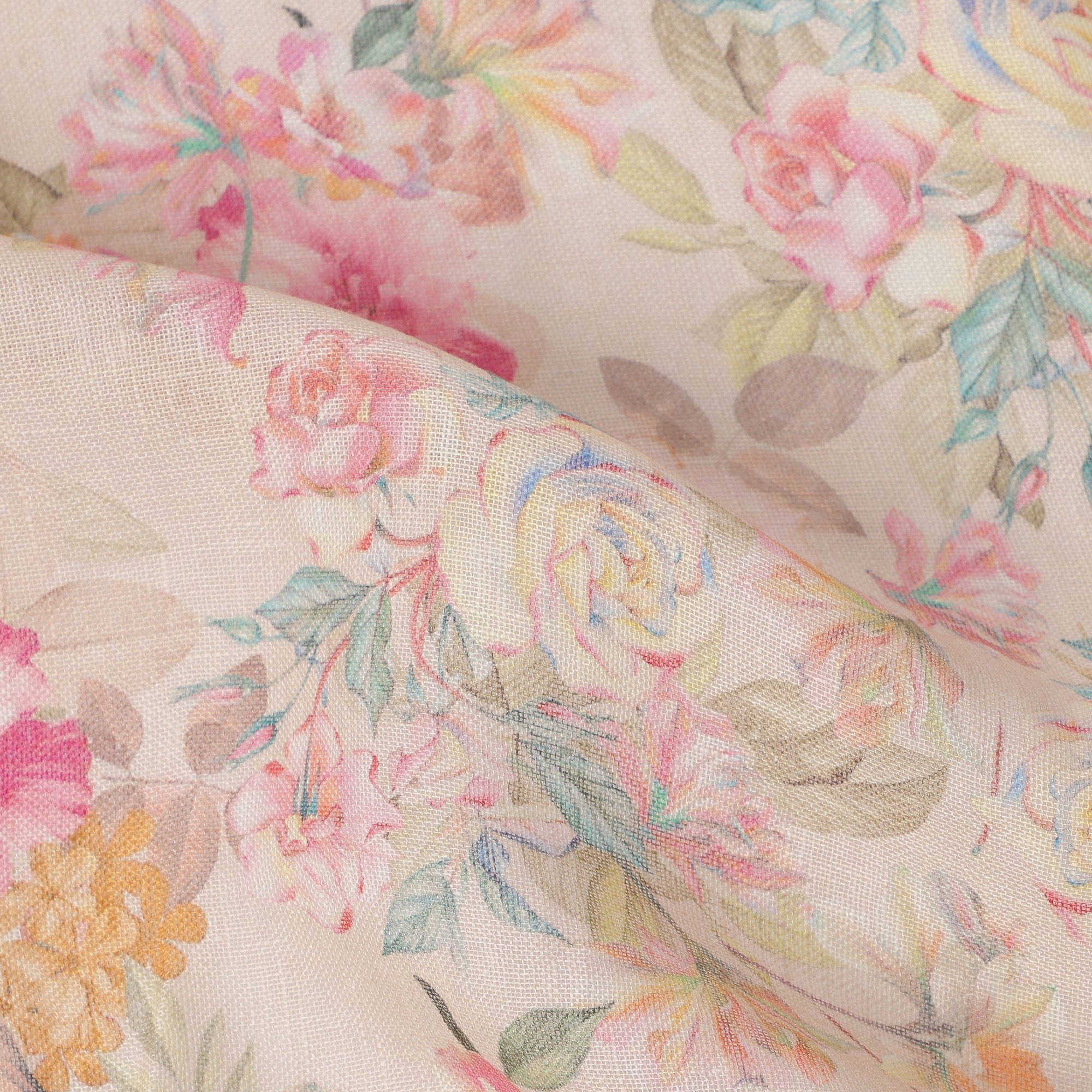 This Beige Multicolor Floral Printed Blended Cotton Linen Fabric is a soft and elegant textile that brings together timeless charm and versatile use. The soothing beige base is enhanced with delicate floral motifs in pastel shades of pink, yellow, green, and blue, creating a refreshing and graceful aesthetic. Crafted from a premium Blended Cotton-linen blend, this fabric combines the breathability and softness of Blended Cotton with the durability and subtle sheen of linen, making it ideal for both apparel and home décor projects. With a width of 110 cms, it provides ample material for designing kurtas, sarees, dresses, tunics, and shirts, as well as stylish interiors such as curtains, cushion covers, and table linens. Its lightweight texture and smooth drape make it especially suitable for summer wear, while its refined floral prints add sophistication for year-round styling. Made in India, renowned for its rich textile craftsmanship, this fabric is a reflection of quality and artistry. To maintain its vibrancy and delicate finish, gentle hand washing or dry cleaning is recommended, ensuring long-lasting beauty and elegance.