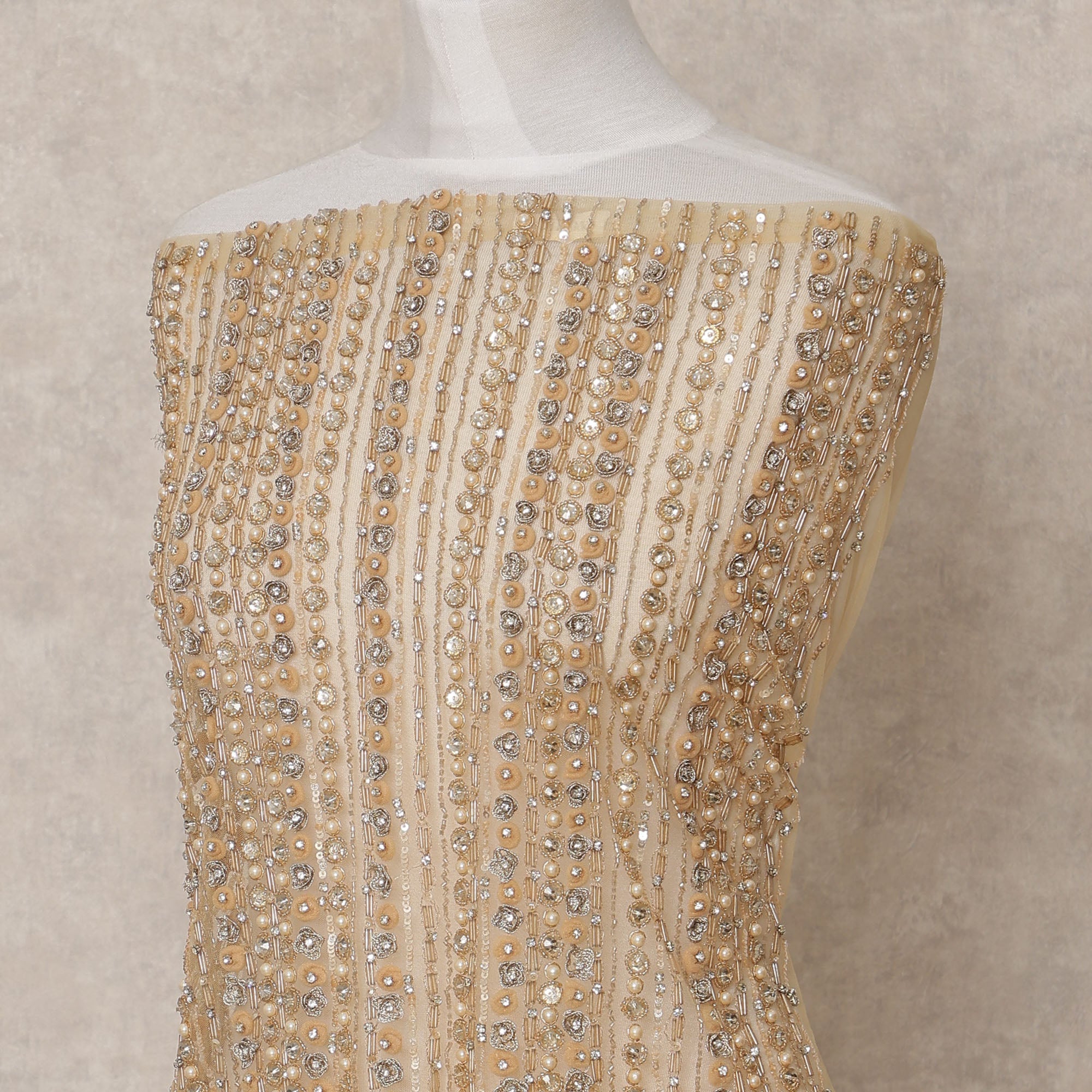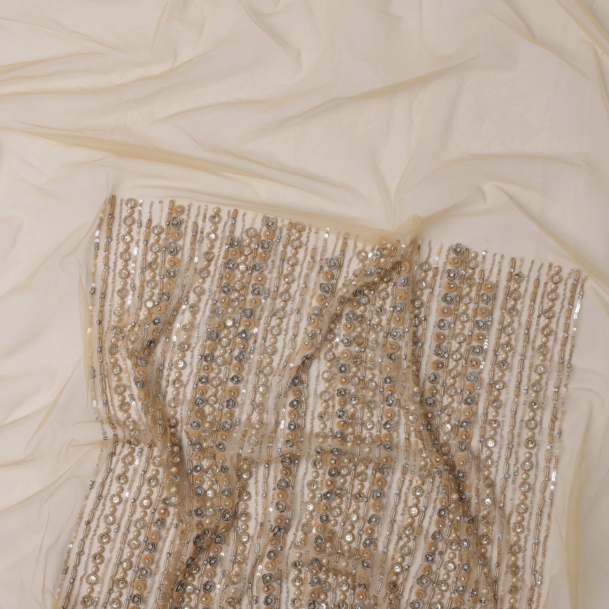 Beige Nylon Tulle with Vertical Sequin Lines & Mirror Work Embroidery, 140 cm Width, Made in India-D23514