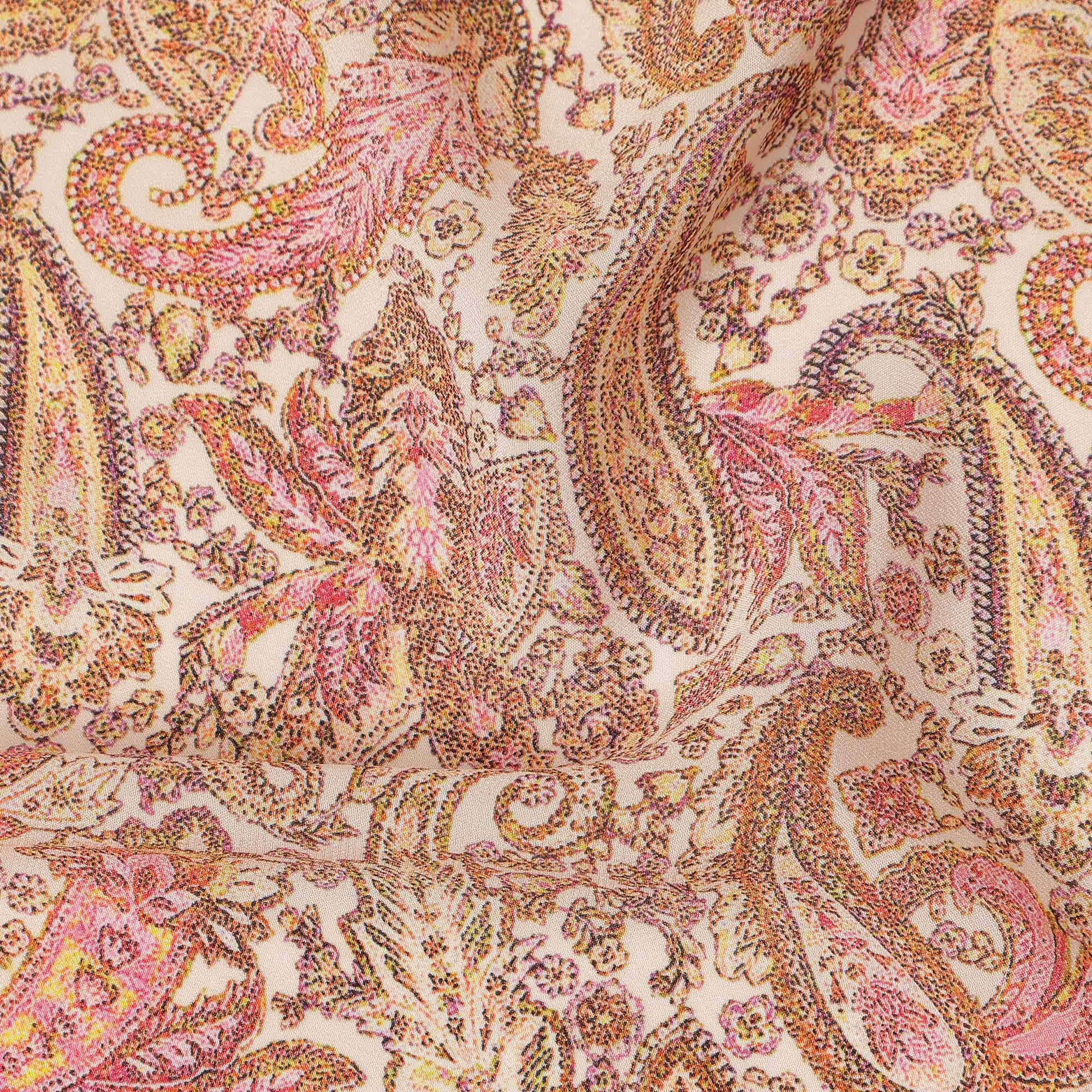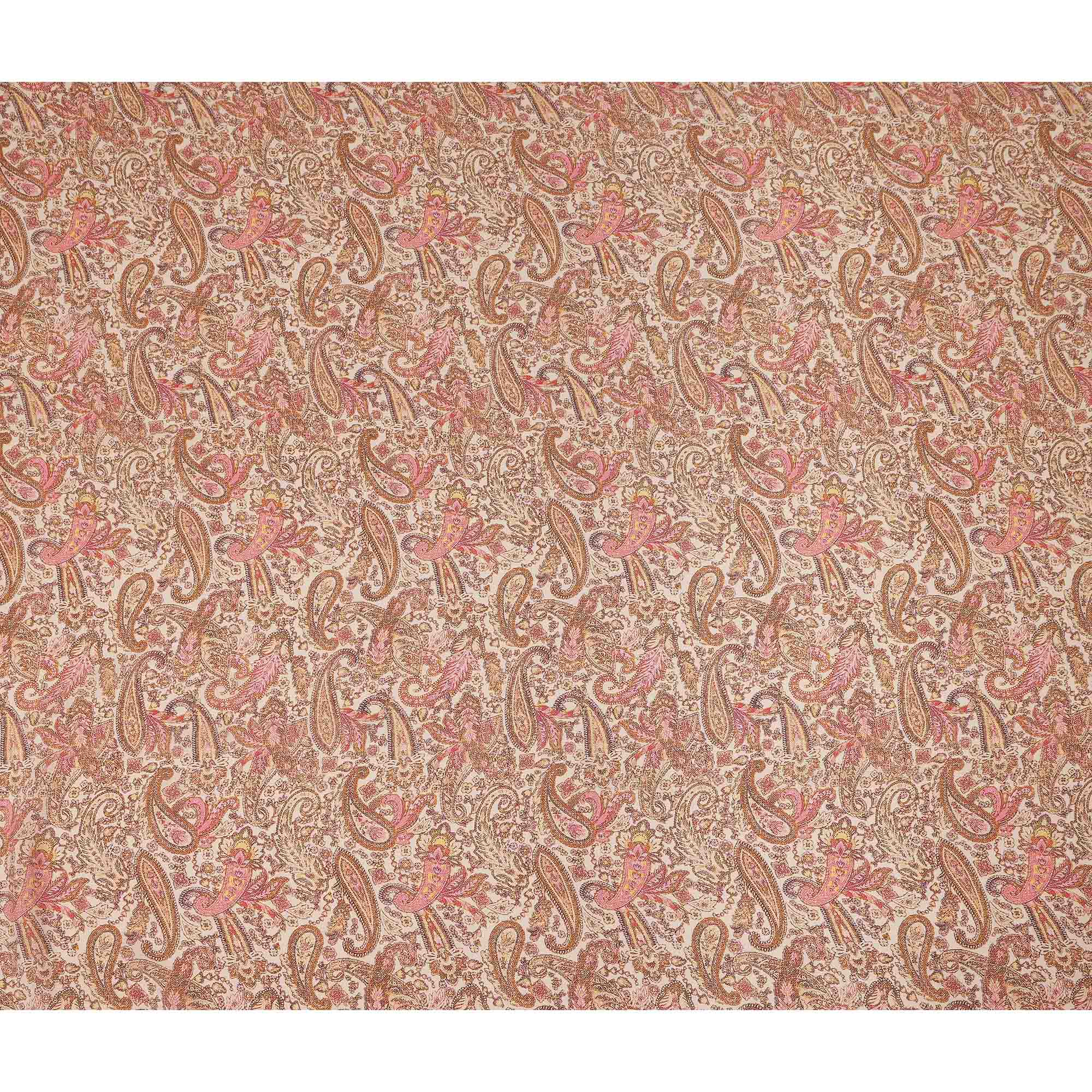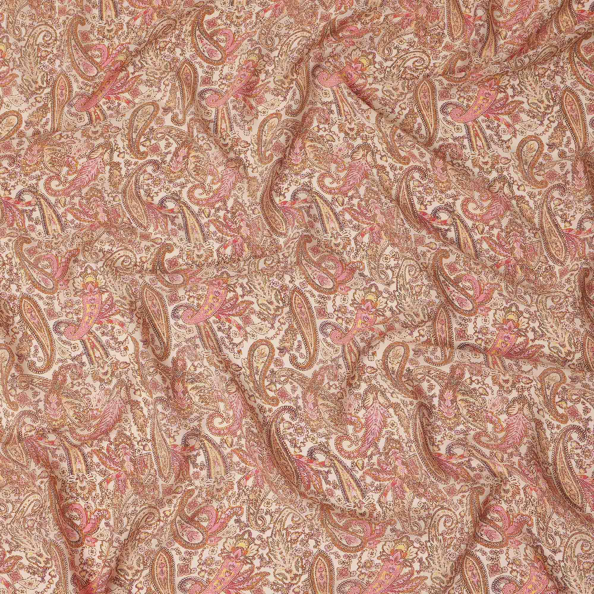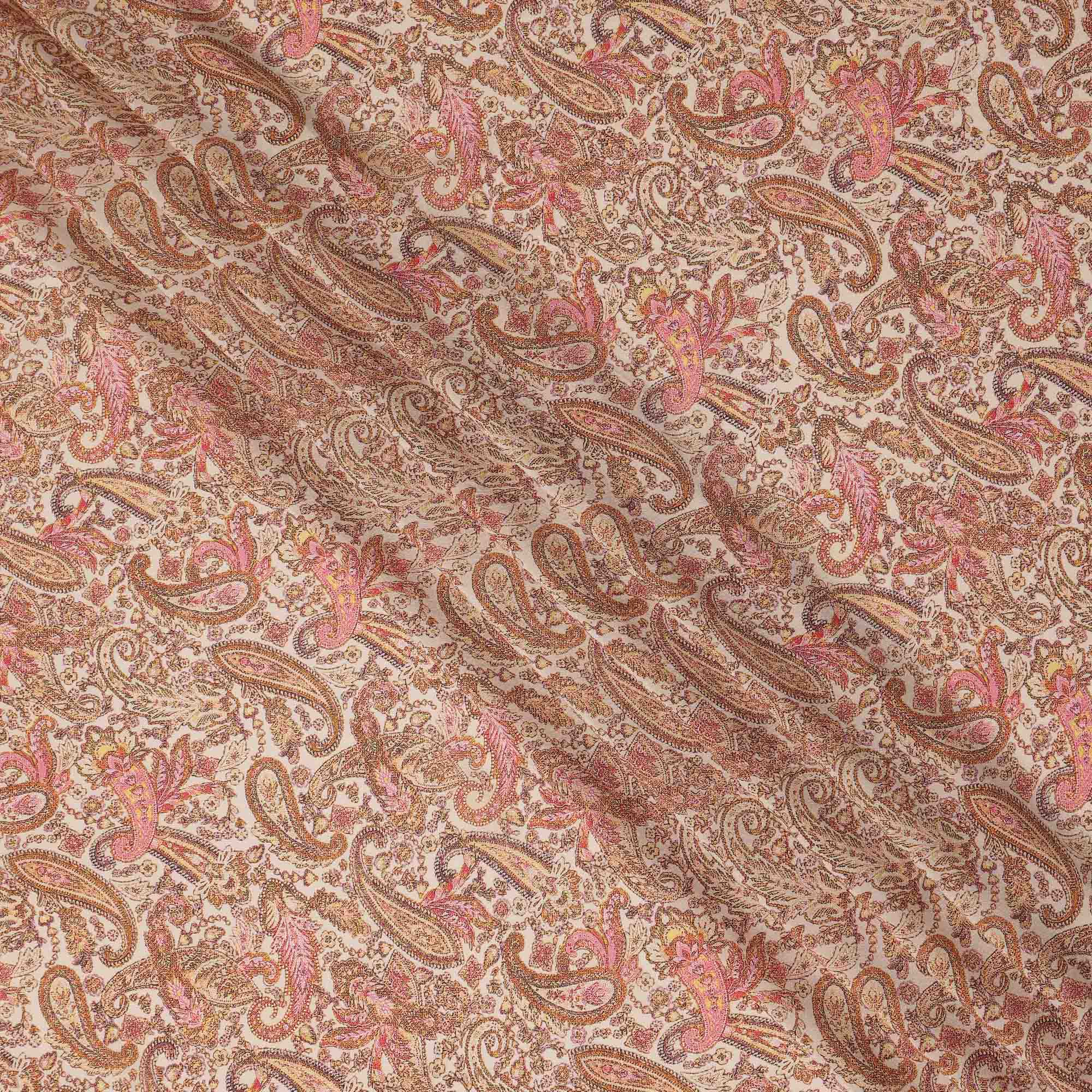 This beige paisley printed silk crepe fabric showcases an elegant vintage floral and leaf design highlighted with soft pink and... Read more Read more