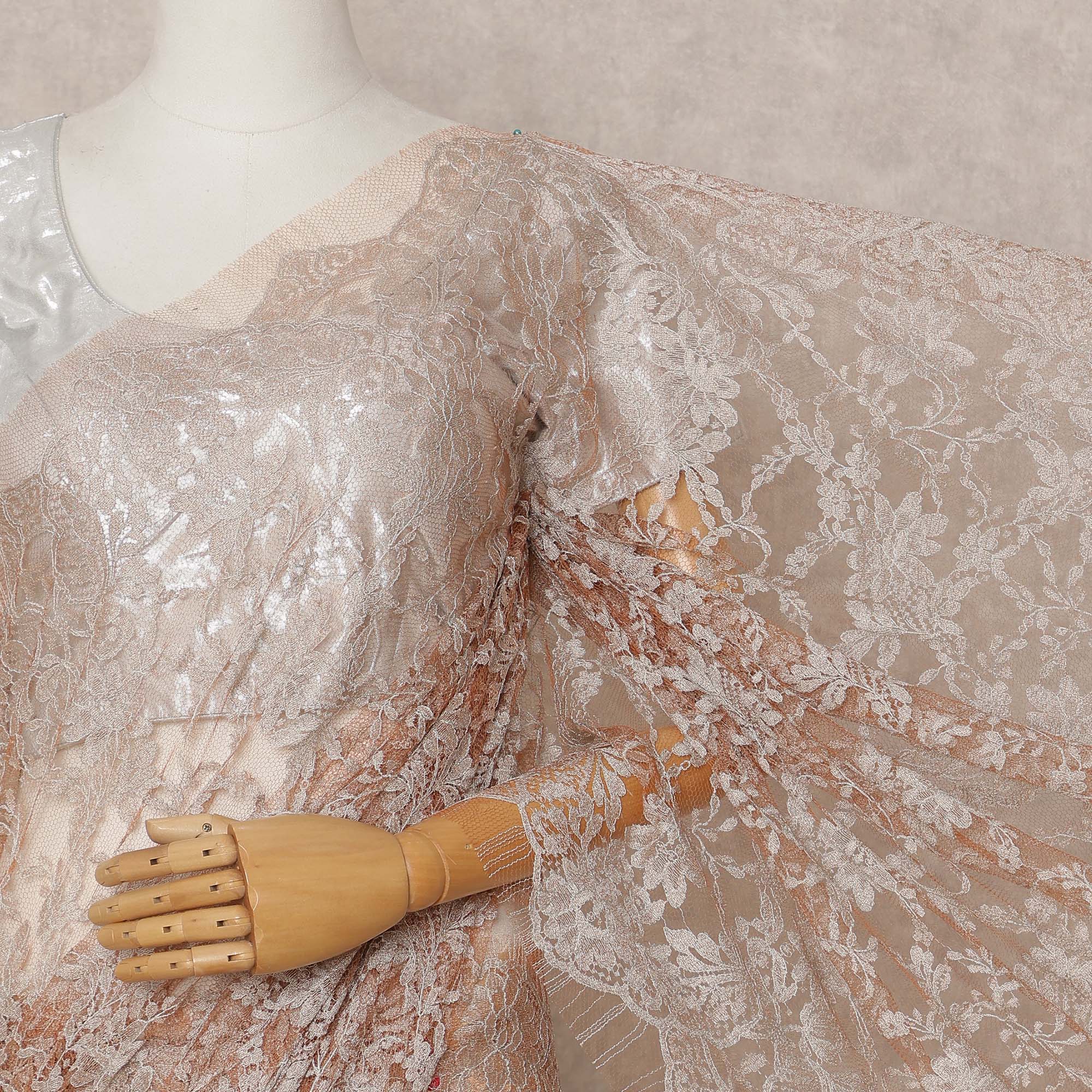 Beige Peach Premium French 2-Tone Chantilly Lace Saree, 5.5 Mtrs with 110 Cms Width, Imported from France-D25436