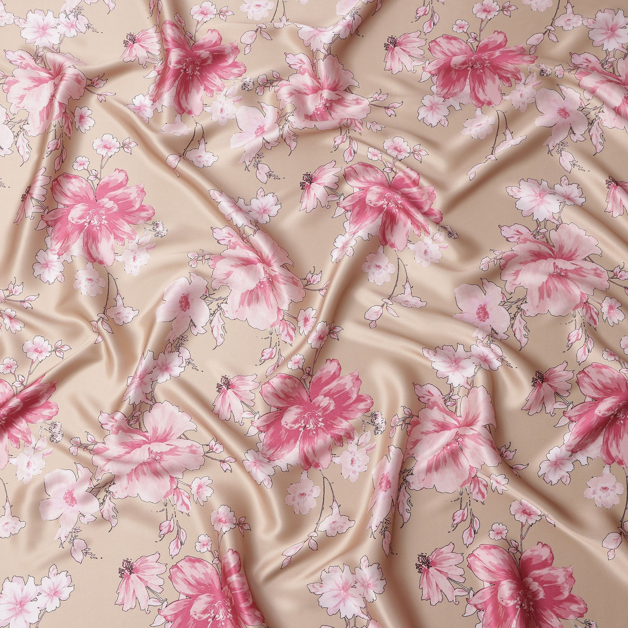 Beige Pink Floral Print Premium Pure Silk Satin Fabric, 110 Cms Width, Made in South Korea-D25941