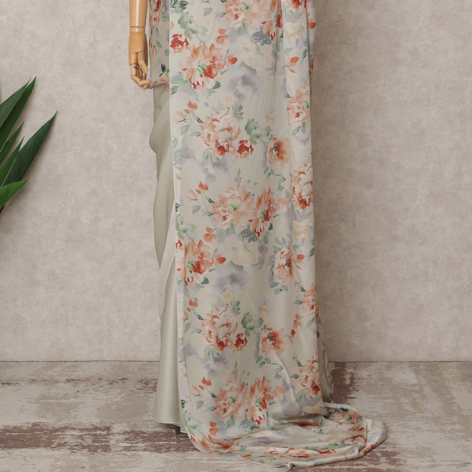 Immerse yourself in understated elegance with this beige premium pure silk chiffon saree, featuring a serene and sophisticated floral print that effortlessly blends soft peach, coral, and green tones across a delicate chiffon pallu. The solid beige base brings balance and grace, while the digitally printed upper half introduces an artistic flourish that evokes timeless femininity. Crafted from high-quality pure silk chiffon, this saree is feather-light and luxuriously smooth, offering a beautiful, fluid drape that complements any silhouette. Measuring approximately 5.5 meters in length and 110 cm in width, it provides generous styling options for modern and traditional preferences. A versatile choice for day events, casual celebrations, or festive gatherings, this saree is easy to maintain and style, making it an essential addition to any refined ethnic wardrobe. Blouse not included. Recommended care: dry clean or gentle hand wash in cold water.