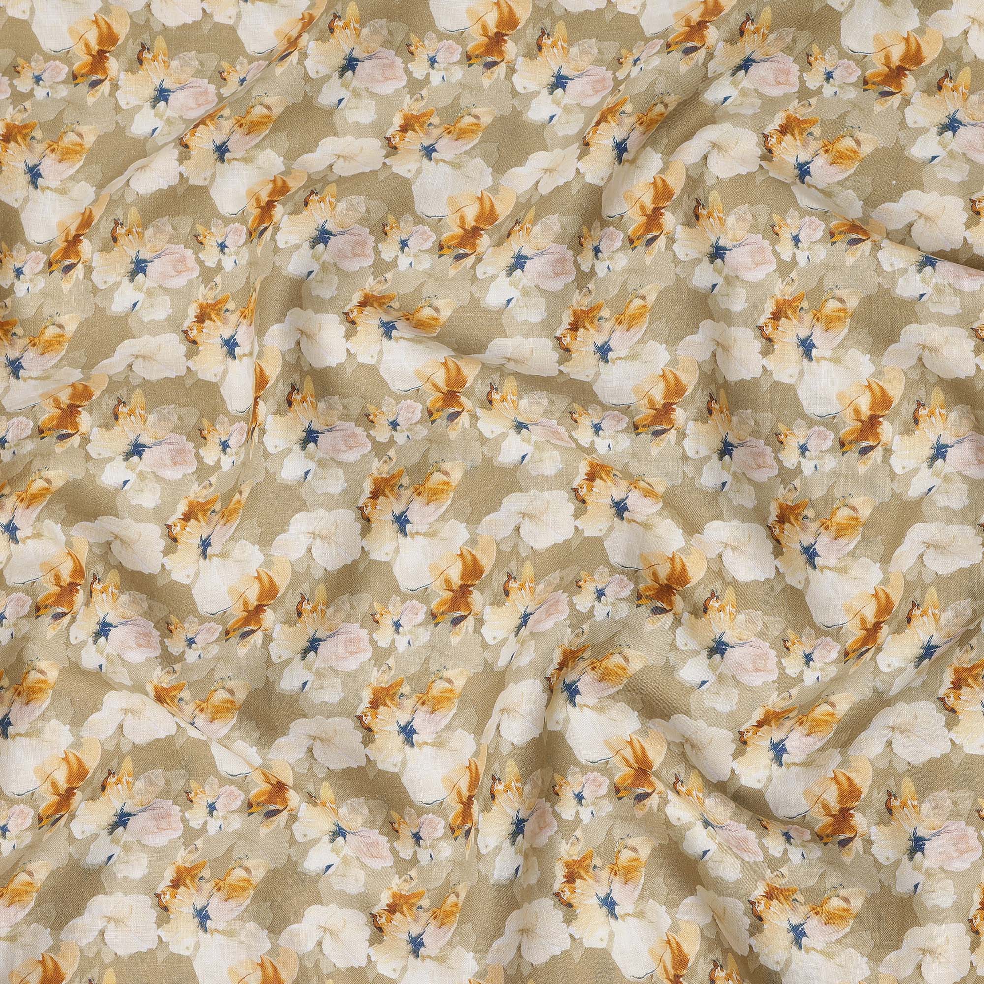 Beige Pure Linen Floral Printed Fabric with Yellow and White Blossom Design, 140 cms Width, Made in India-D25070