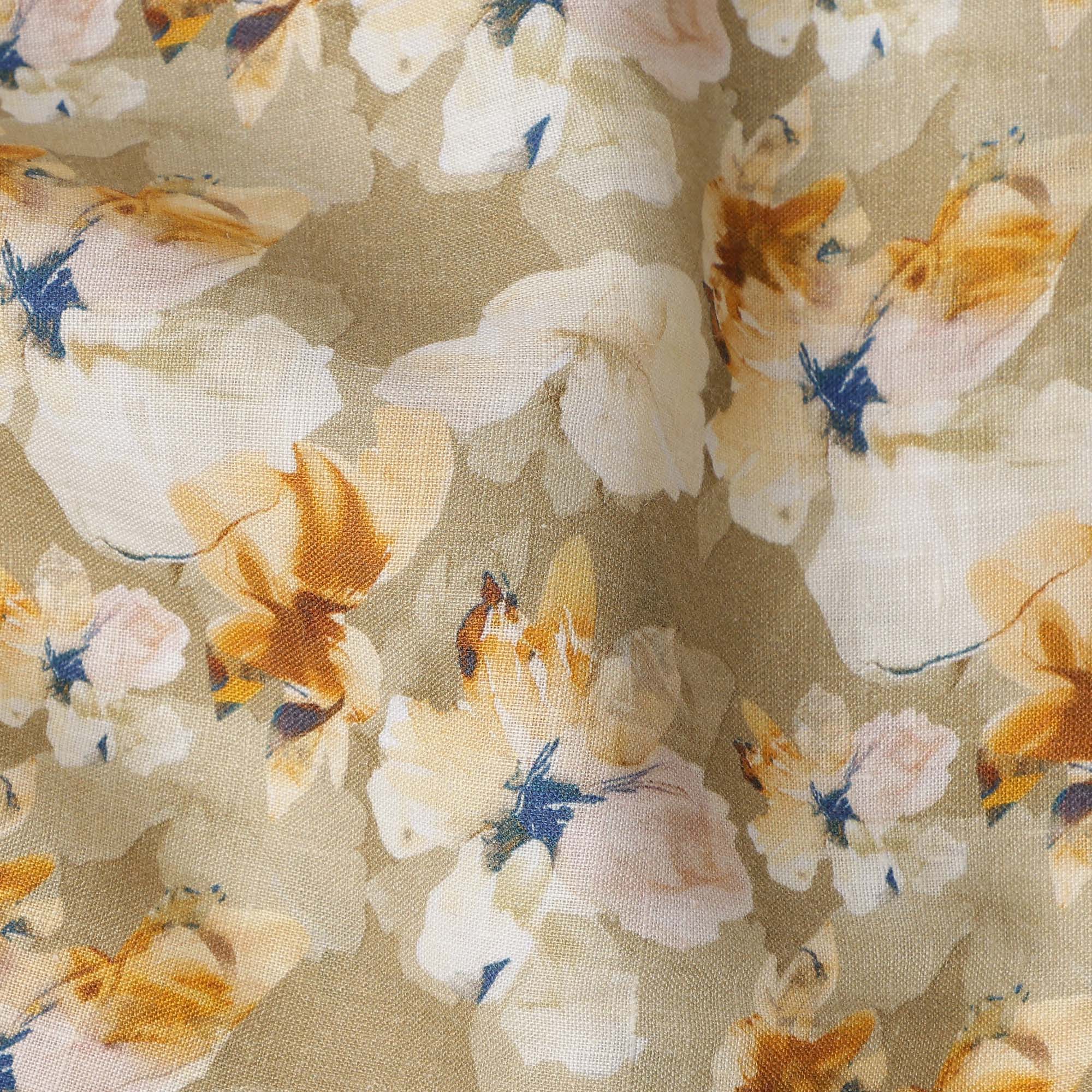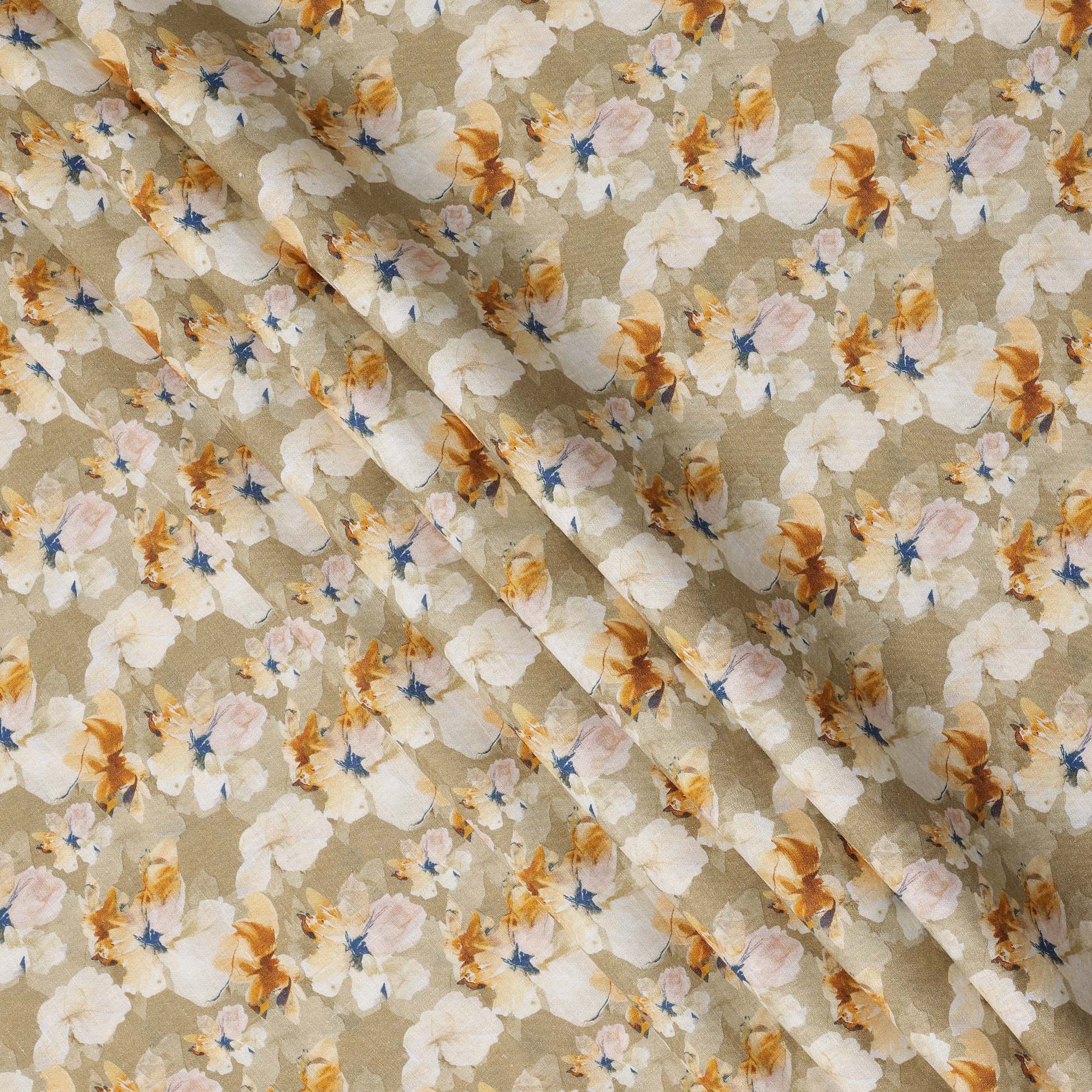 This Beige Pure Linen Floral Printed Fabric is a beautiful blend of elegance and natural charm, featuring a delicate blossom design in soft white and blush tones with vibrant yellow accents, all set against a warm beige backdrop. Crafted from premium quality pure linen, this fabric offers a breathable, durable, and naturally textured finish, making it an excellent choice for both comfort and style. The floral motifs are artistically detailed, resembling watercolor brush strokes that bring a painterly sophistication to the fabric. With a generous width of 140 cms, it allows for versatile tailoring, whether you are creating sarees, kurtis, dresses, shirts, or even chic home décor items like curtains and cushion covers. Its lightweight yet strong weave ensures long-lasting usability, while its natural drape makes it easy to stitch and style for both casual wear and festive occasions. Representing the finesse of Indian craftsmanship, this fabric perfectly combines tradition with modern aesthetics. Shop online to experience this premium beige pure linen fabric, designed to elevate your wardrobe and living space.
